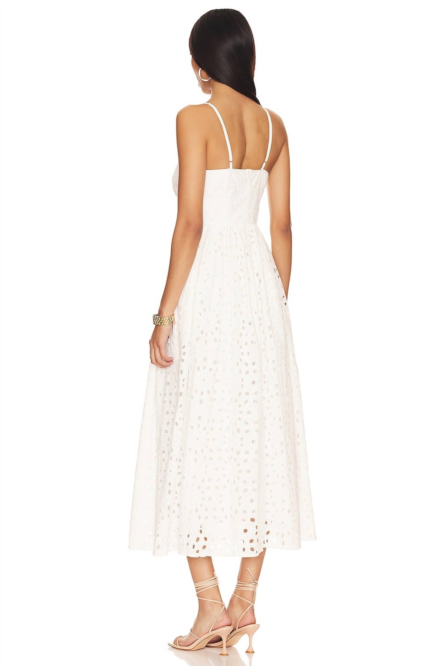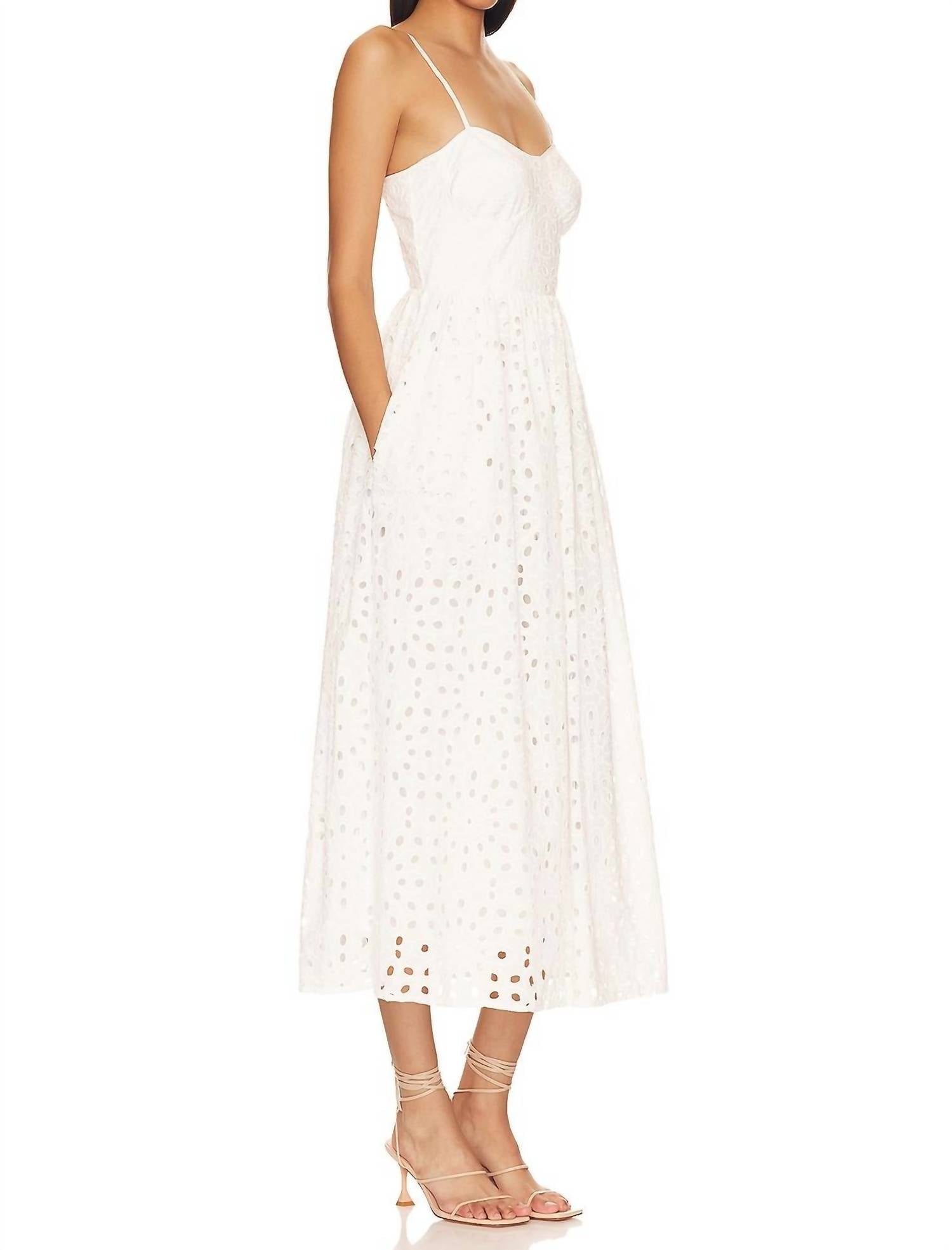 100% Cotton. Eyelet midi dress design. Adjustable spaghetti straps .Bustier style top. Hidden back zipper with hook and eye closure. Fully lined. Pull on styling. Dry Clean only.