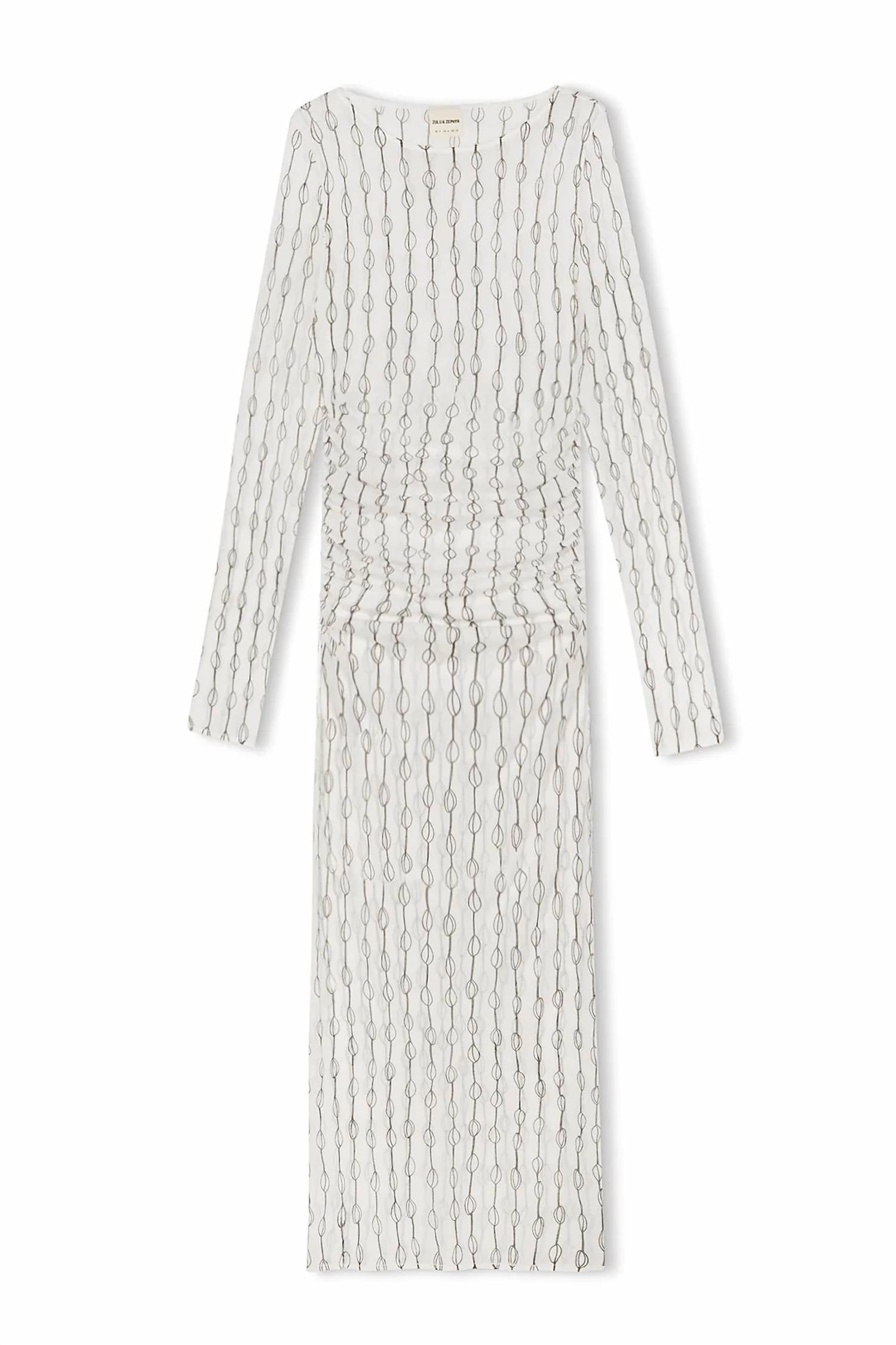 The pefect long sleeve dress for those cooler months. Women's long sleeve bodycon piece in white. Crafted from 69% cotton and 31% recycled nylon. Features thoughtful rouched detailing and a crew neckline for a chic beach day look. Pull on style. Hand wash and lay flat to dry.