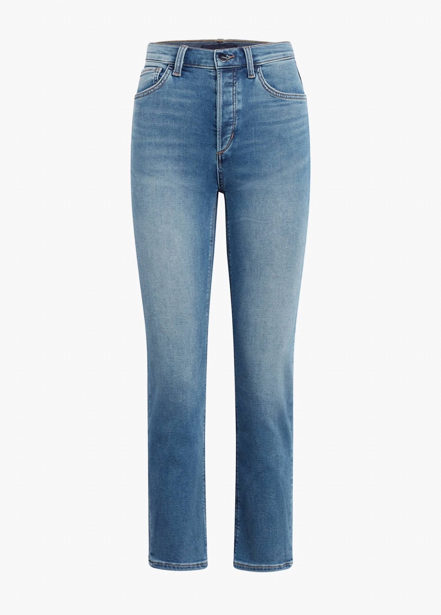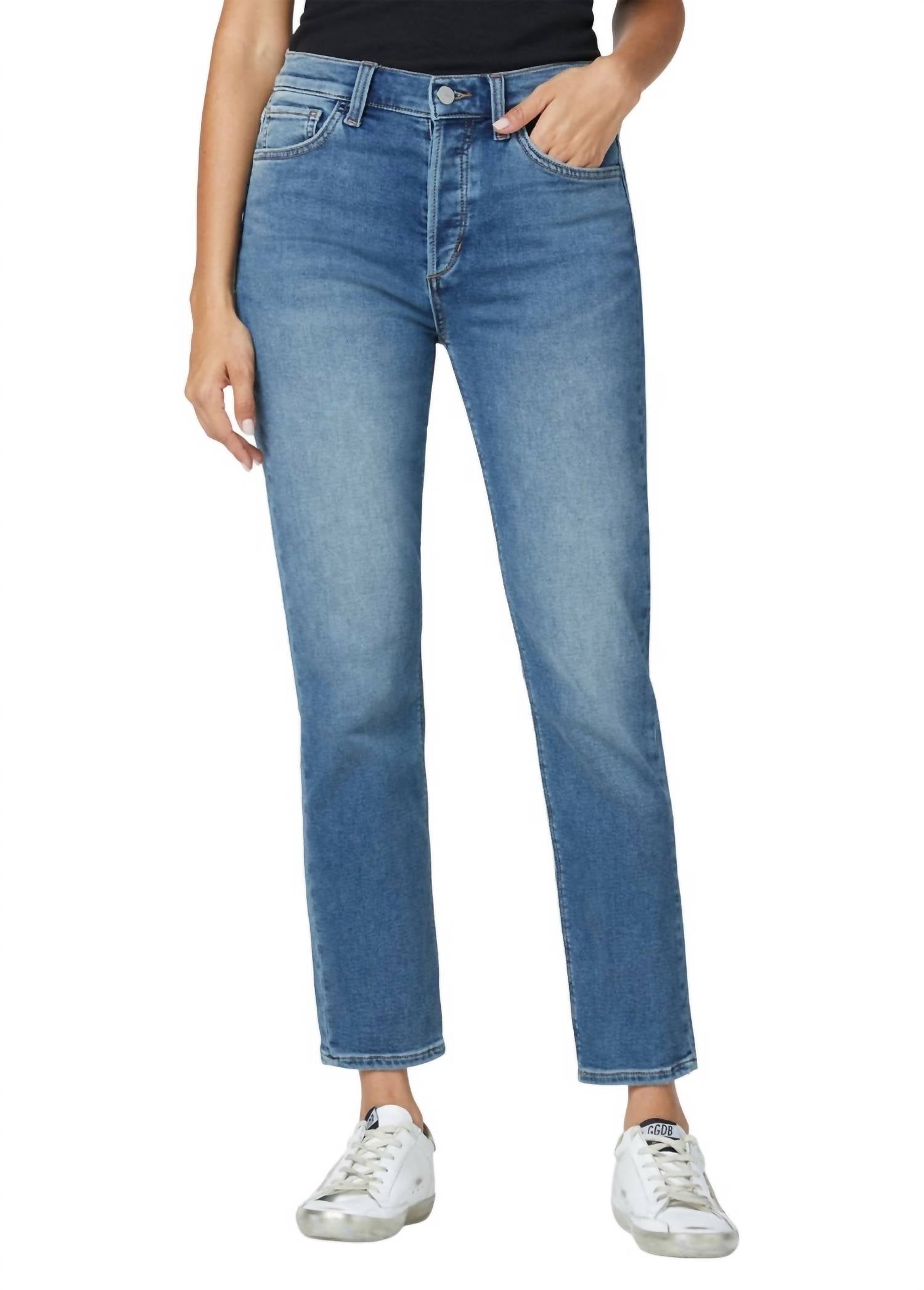 Straight-leg boyfriend jean. Medium rise and classic five-pocket styling. Denim french terry. Button fly pair. Medium light blue shade. 10 1/2" RISE. 27" INSEAM. 99% Cotton, 1% Elastane.