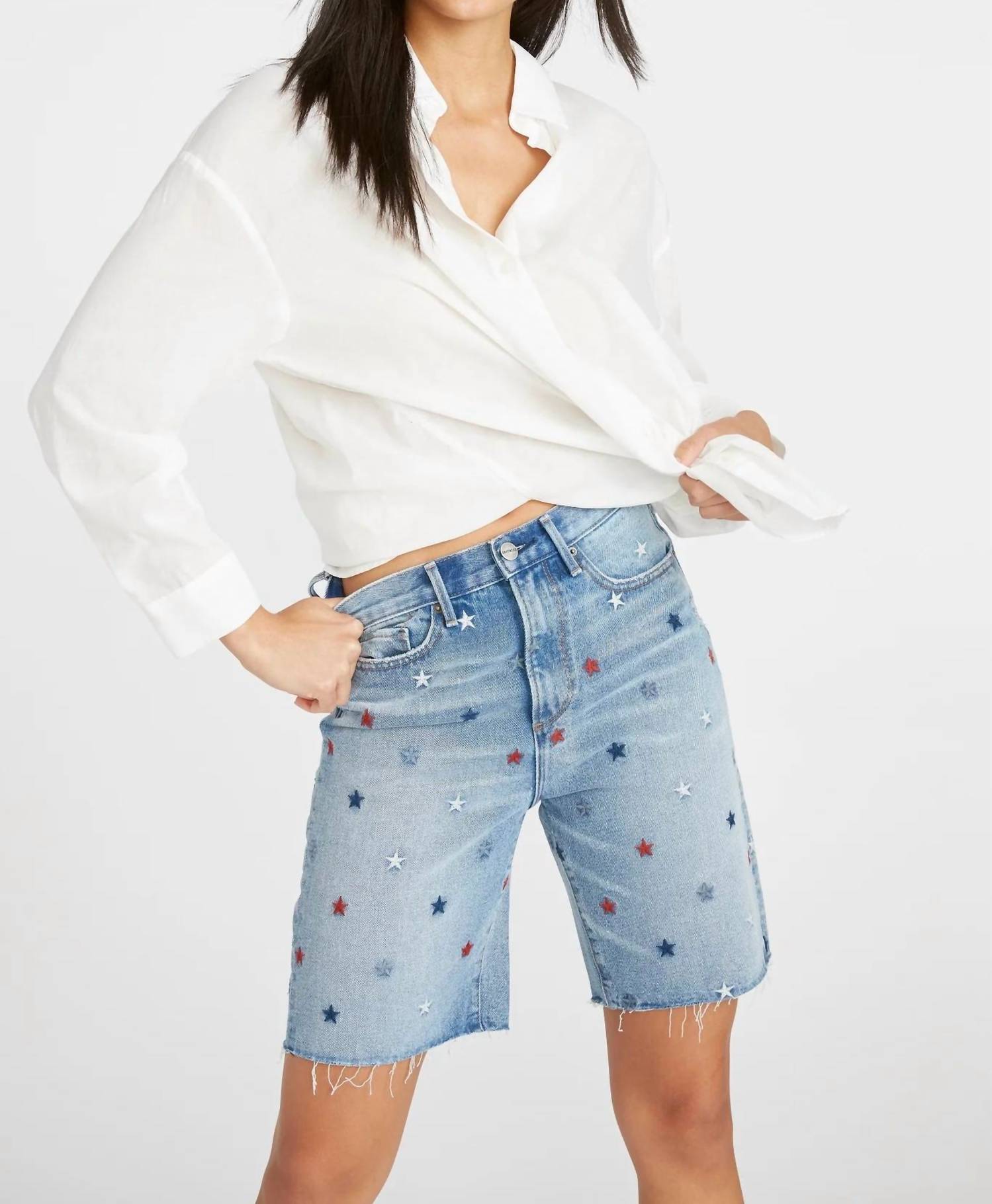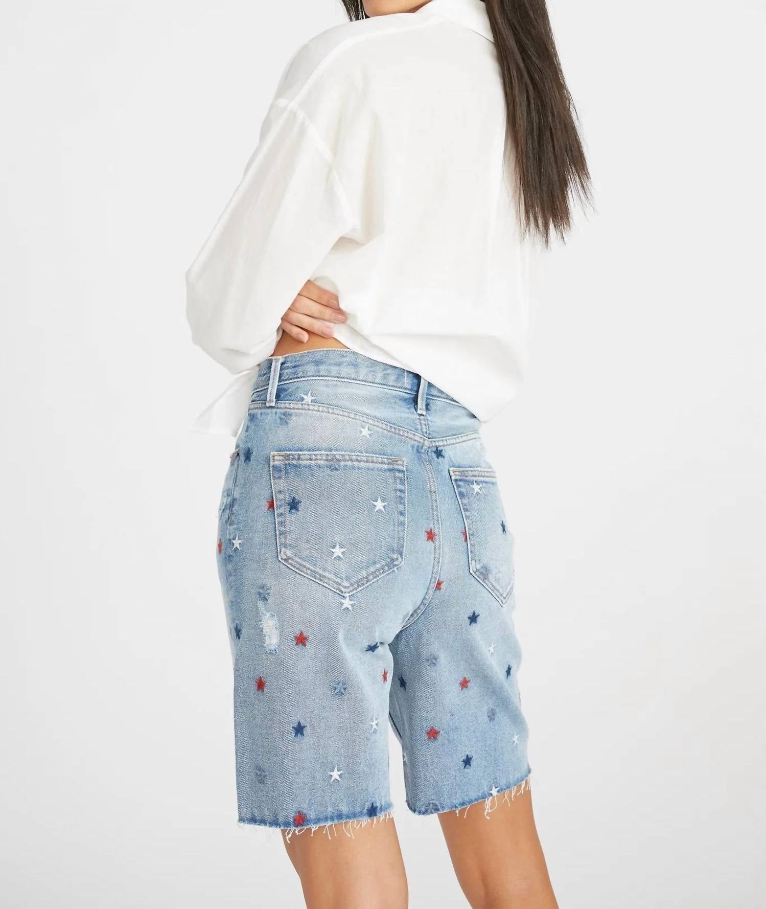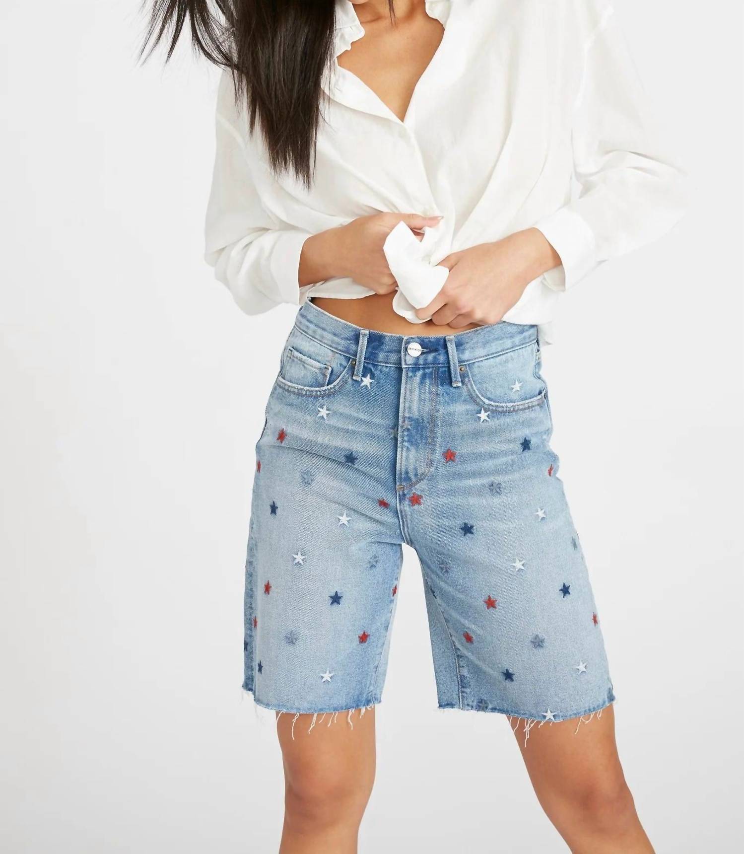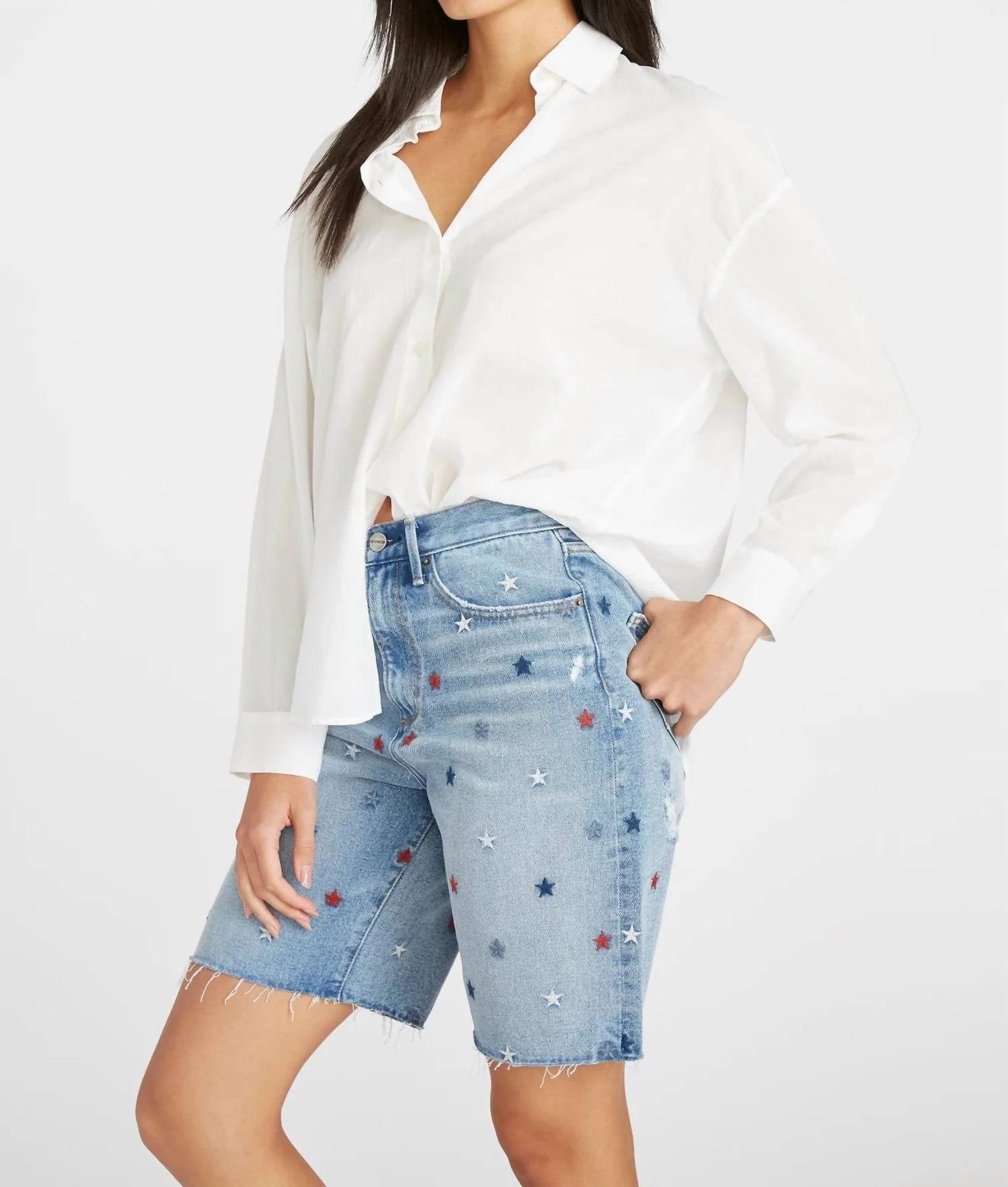 Embrace the perfect blend of comfort and style with these fashionable women's Bermuda shorts, expertly designed to offer a flattering fit and versatile wear. Introducing the Starry Eyed Bermuda Short by DRIFTWOOD, a perfect addition to your spring streetwear collection. Crafted in a 100% cotton fabric, these patterned bermuda shorts feature a comfortable 9-inch inseam and stylish frayed hem. Adorned with red, white, and blue embroidery, they also offer practical front pockets with trendy whiskering. Closure: Button closure. Care: Machine wash cold. Model is wearing Size 26.