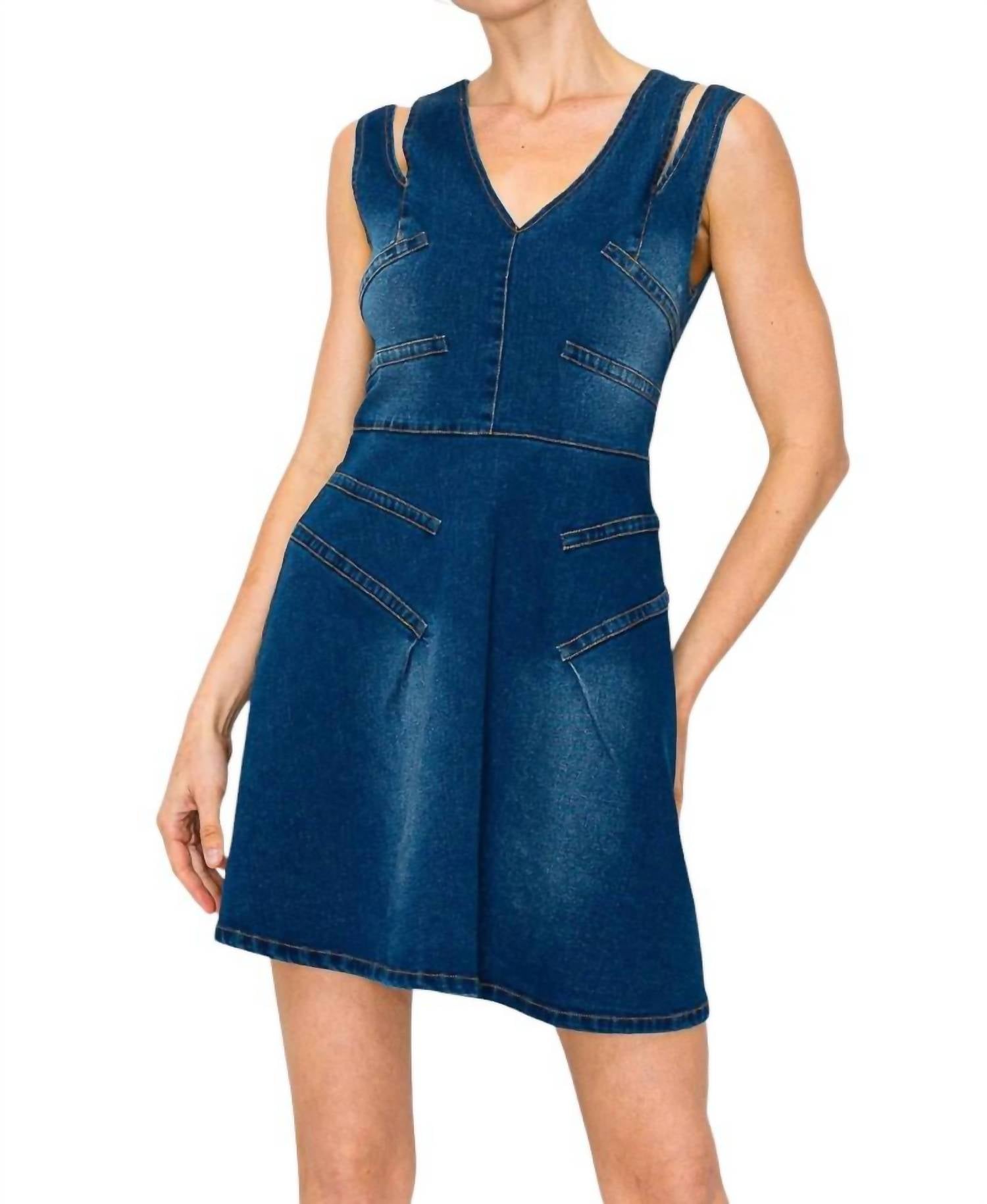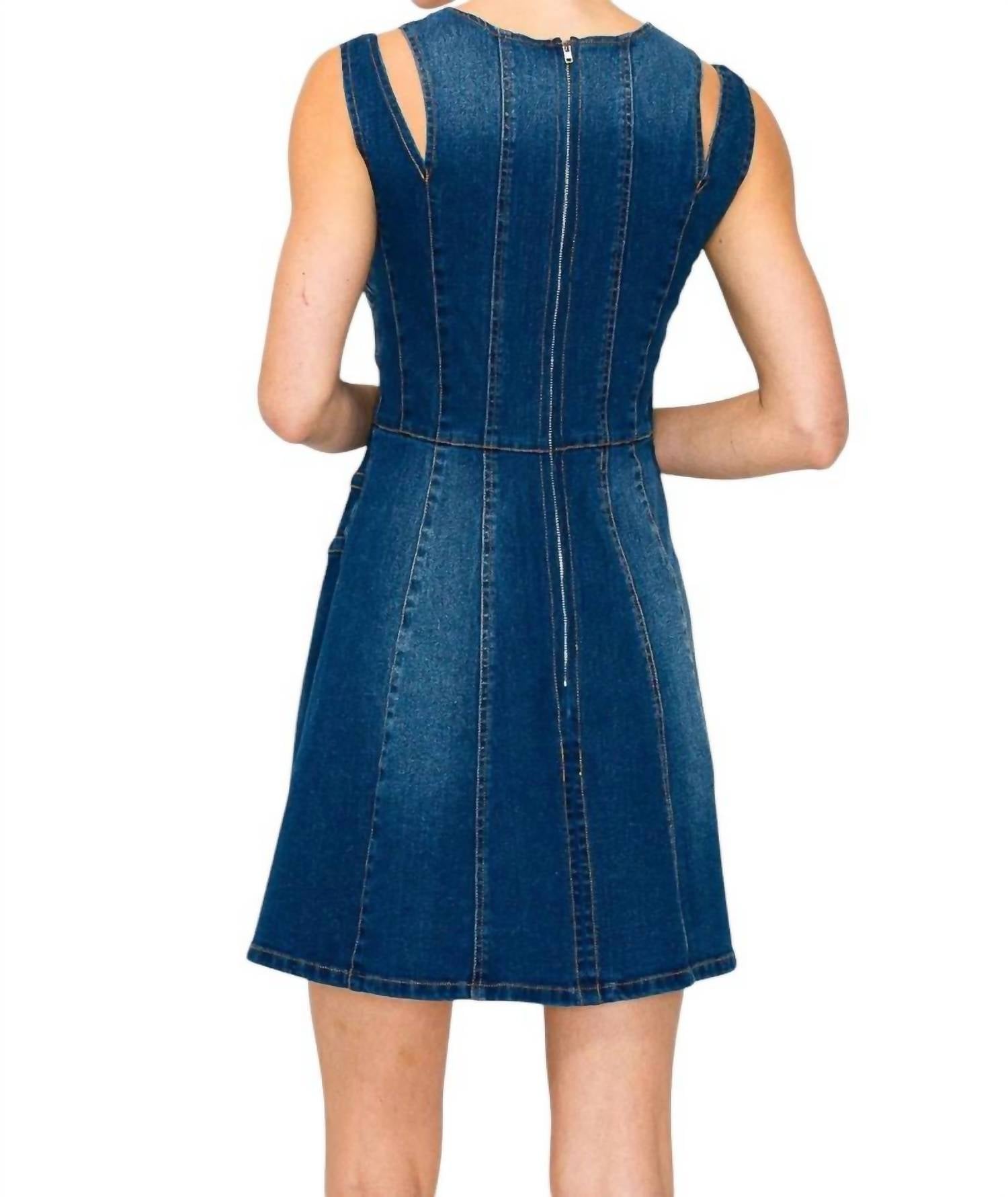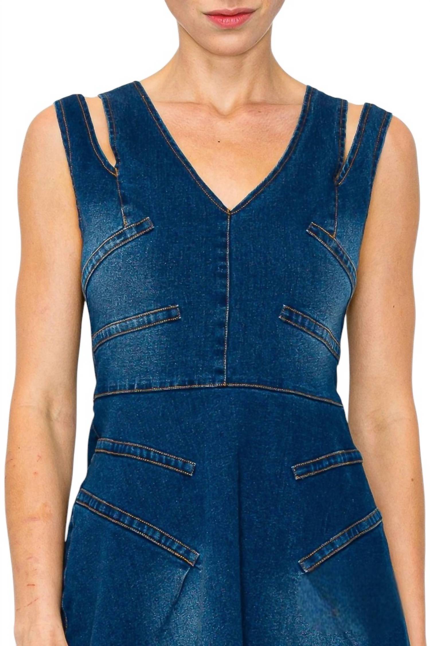 The kind of easy and flattering dress you'll be reaching for all season long. The INA Tabitha Cut Out Slit Straps Denim Mini Dress in medium wash is the ultimate blend of sophistication and daring style. This sleeveless dress features a V-neck with a captivating slit at the shoulder, crafted from a cotton blend of 65% Cotton, 33% Polyester, and 2% Spandex for a comfortable, curve-hugging fit. Imported with a modern A-line silhouette, it closes with a sleek back zip closure and requires machine wash cold and line drying for easy care. Designed without pockets, this textured piece is your statement-making choice for any chic occasion.
