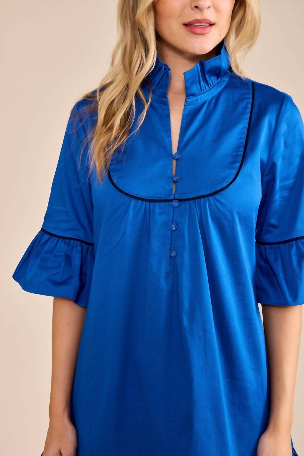 Designed in a serene Cote D'Azur shade, it features elbow sleeves and a mockneck for a touch of elegance. Made from pure cotton, this dress combines comfort with style and includes convenient pockets. Button closure. Machine wash.