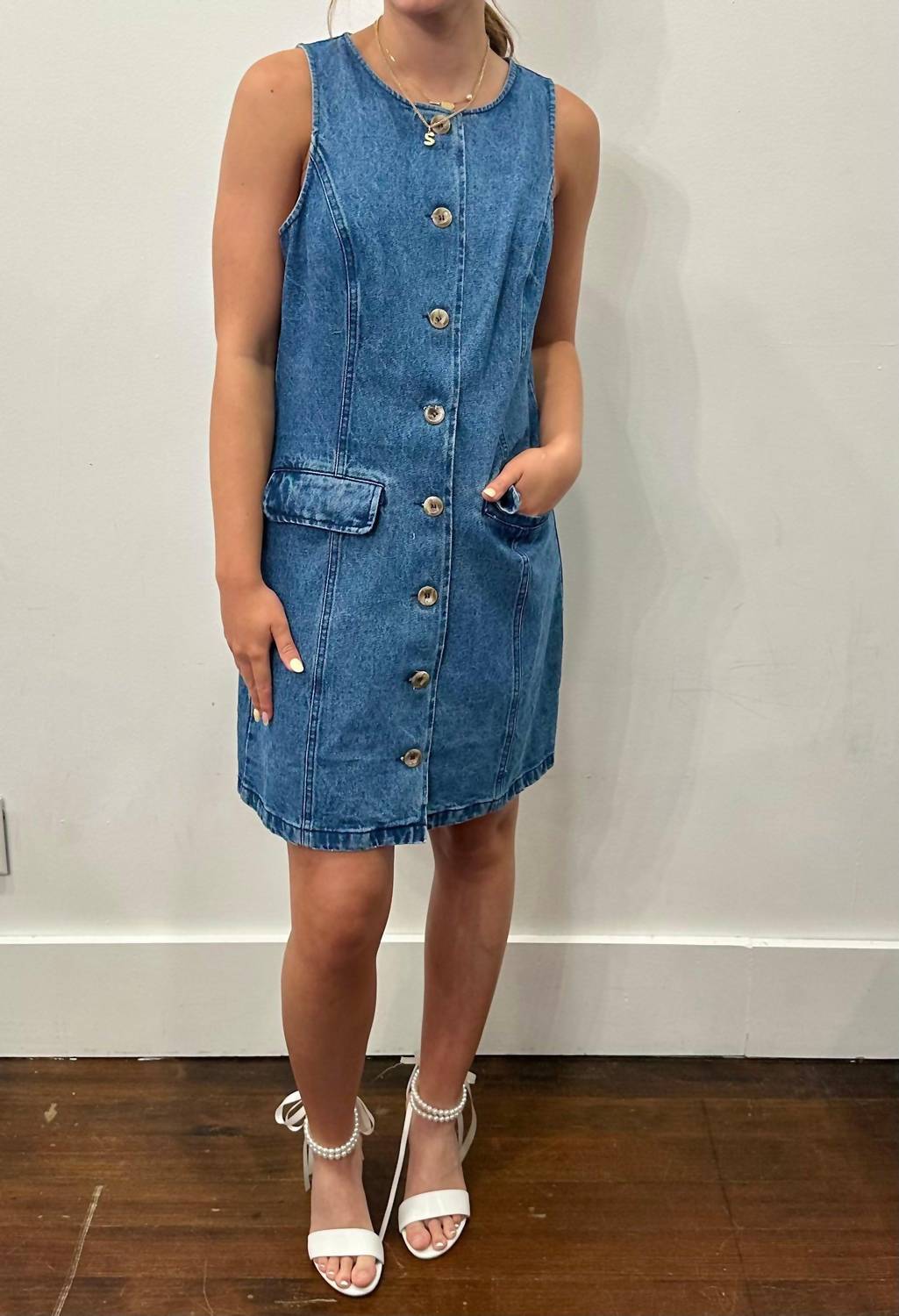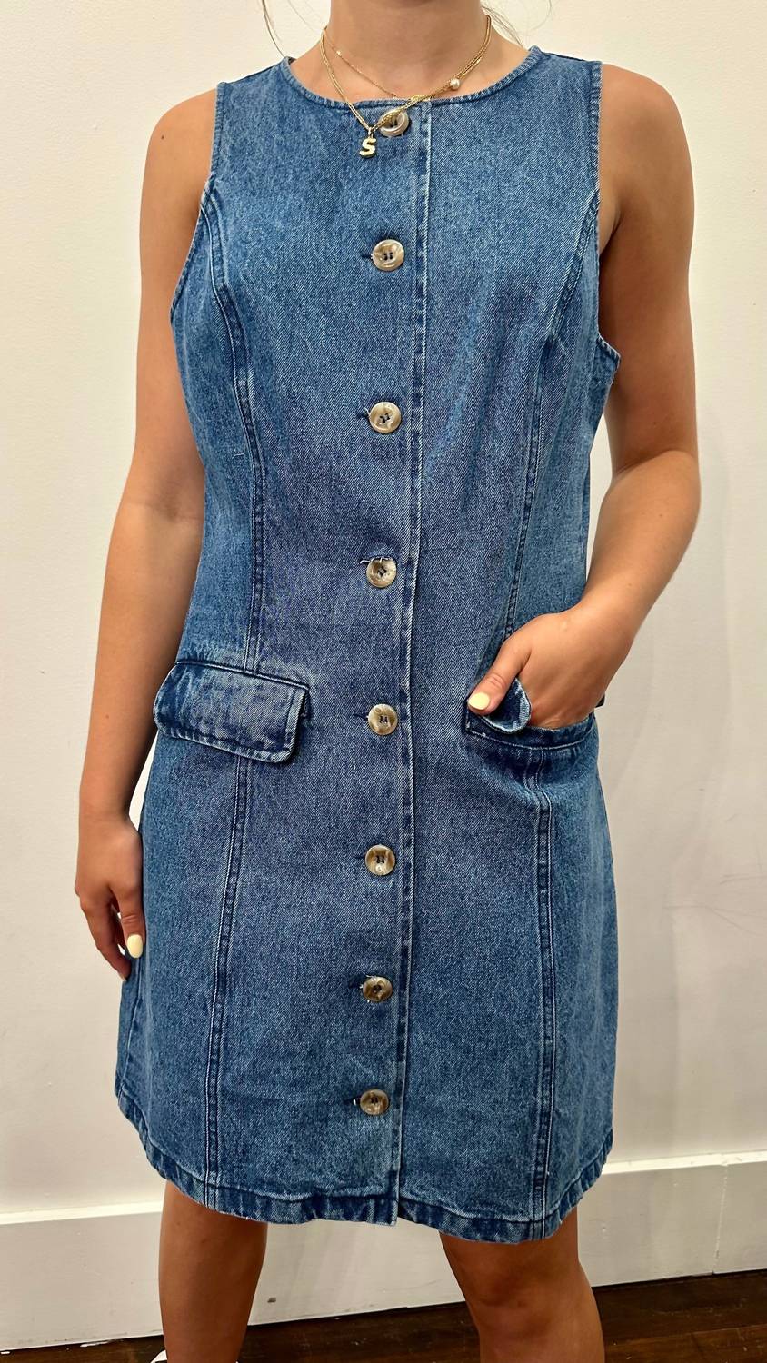 Pair with your favorite sandals for an effortlessly chic look. Meet the Sierra Mini Dress by GILLI, a chic sheath silhouette perfect for your spring occasions. This sleeveless denim dress features a classic crewneck and convenient button closure, enhanced by two practical pockets. Material: Denim. Care: Machine wash cold, hang to dry. It's available in sizes Small (2-4), Medium (6-8), and Large (10-12). Model is wearing a size medium.