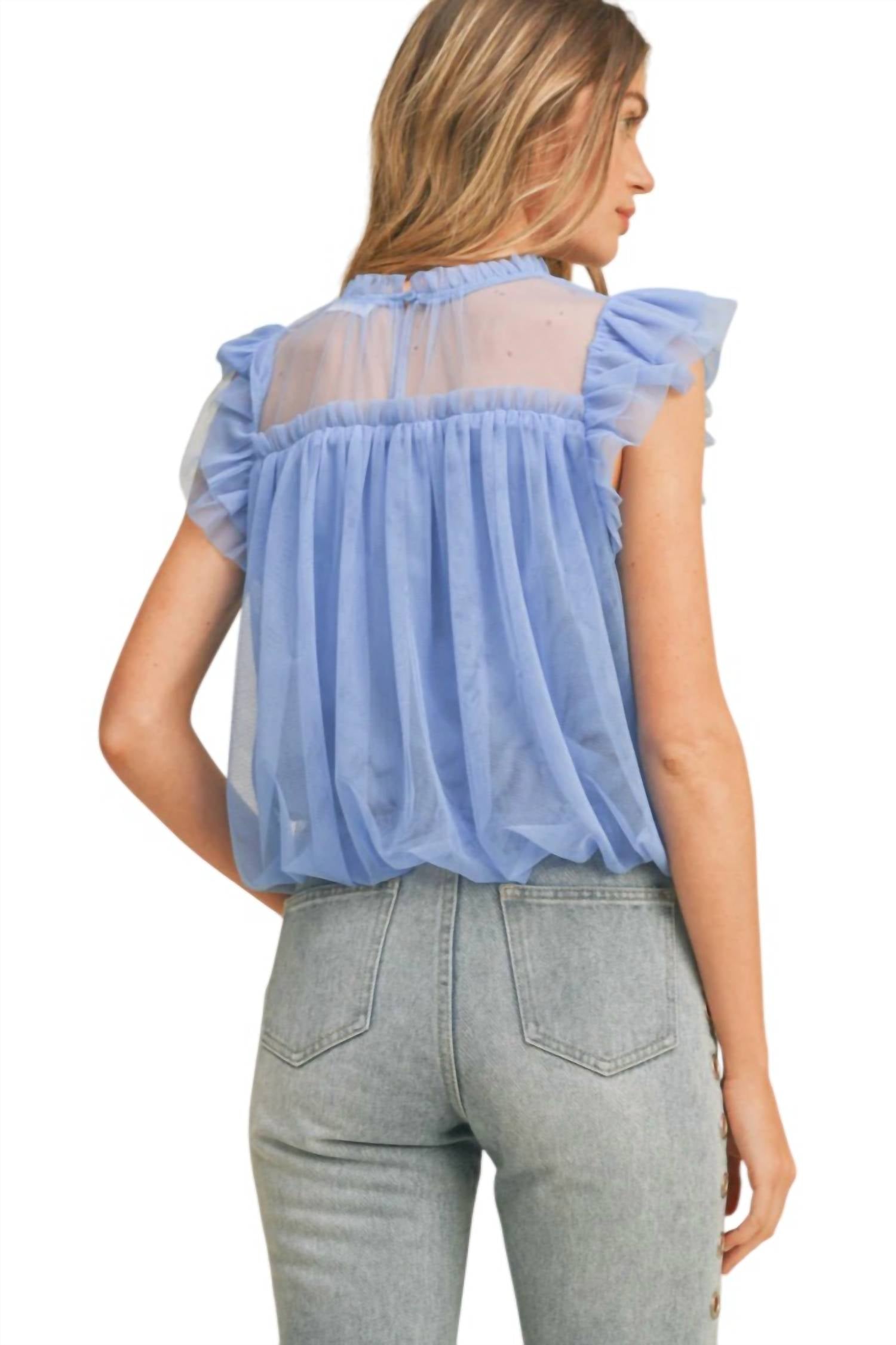 Embrace elegance and standout piece in cornflower blue. Captivating blouse features cap sleeves and a high ruffled crewneck. Complemented by a bubble hem. Made with a sheer mesh overlay and solid lining. Offers both style and comfort. Completed with a back button closure.