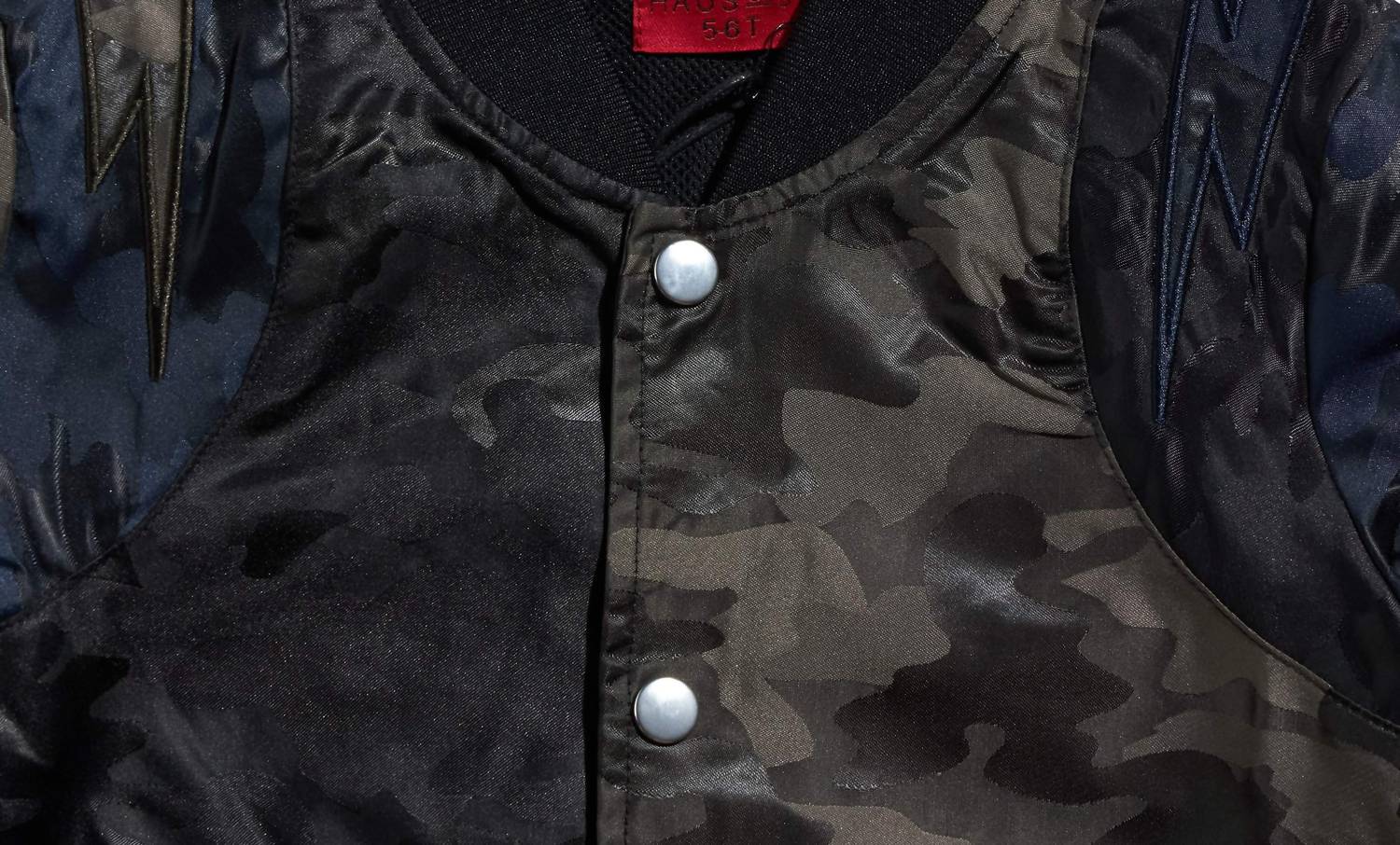Button front. Pockets. Ribbed cuffs and hem. Original varsity jacket silhouette. All-over camouflage print.