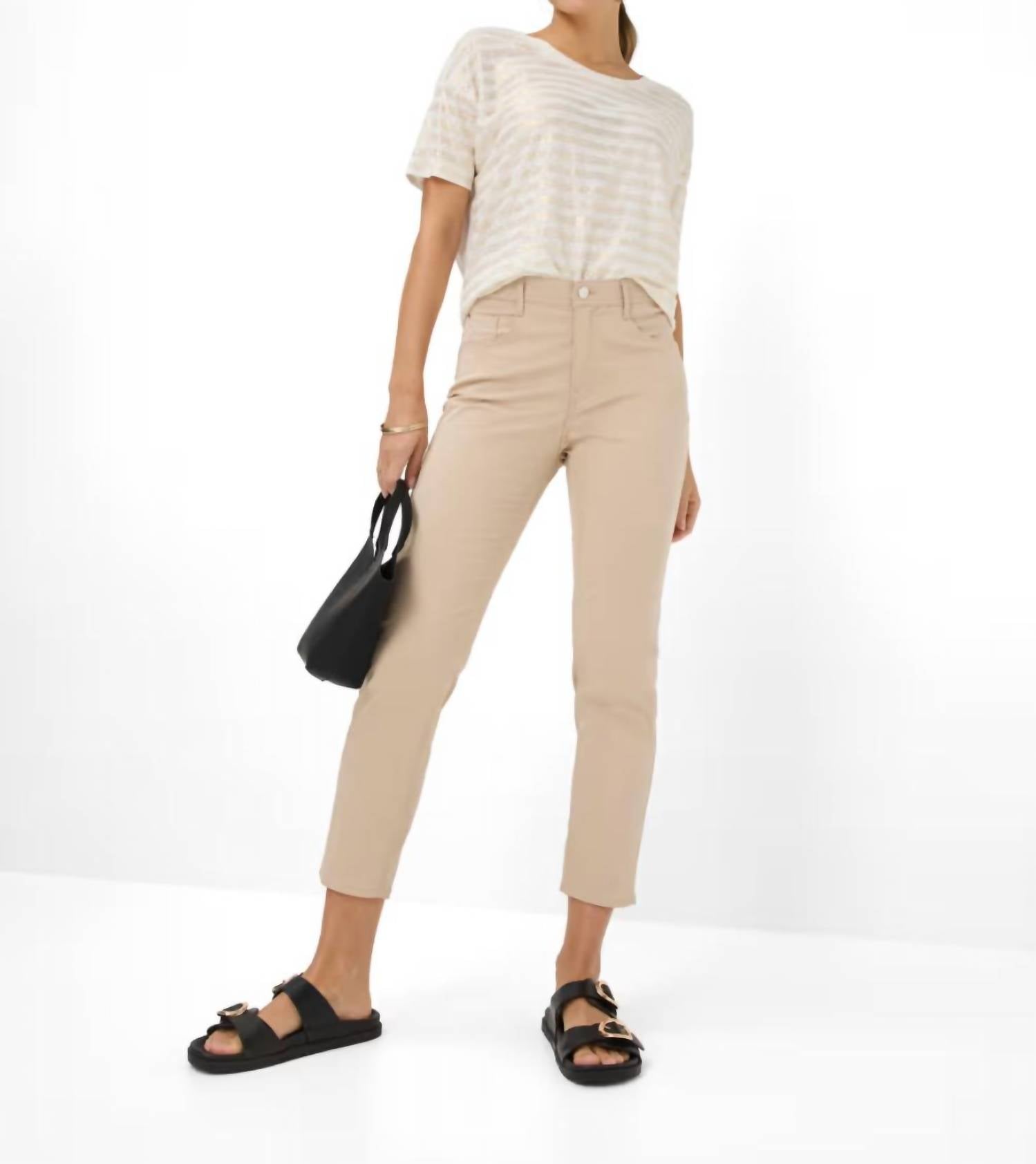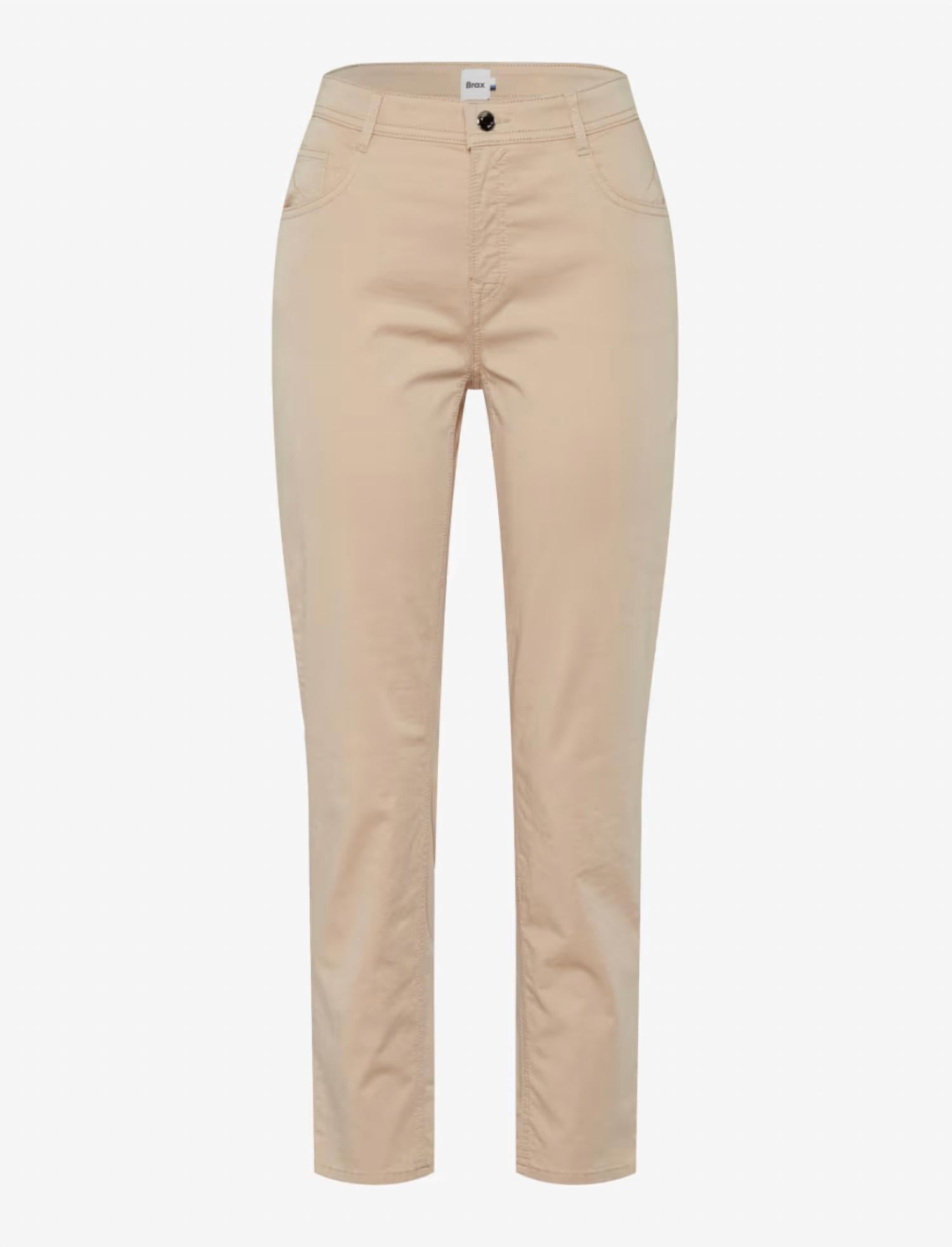 A straightleg pant that workes season after season. Dress these up with your favorite blouse or keep it casual with your go-to tee. Discover the Mary Straight Leg Pants by Brax, a chic choice for summer vacation attire in a solid almond hue. With a composition of 78% Cotton, 19% Lyocell, and 3% Elastane, these pants ensure exceptional lightness and durability. Designed for a regular fit, they feature a straight leg silhouette, a high rise, and a 26.75" inseam, making them perfect for stylish combinations. Closure is provided by a zipper and button, while care instructions suggest machine washing and laying flat to dry. Sustainability is prioritized with environmentally conscious production and support for Cotton made in Africa.