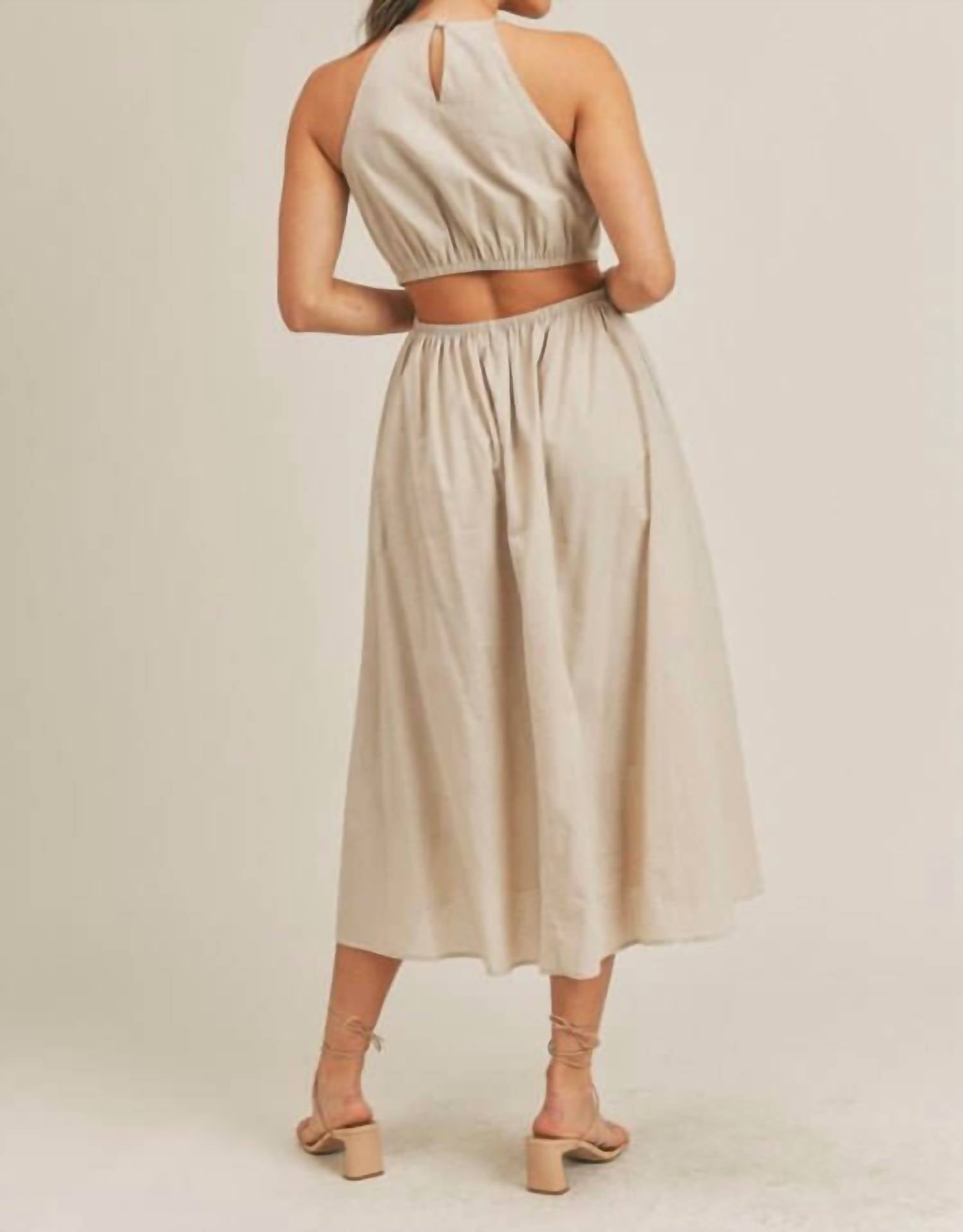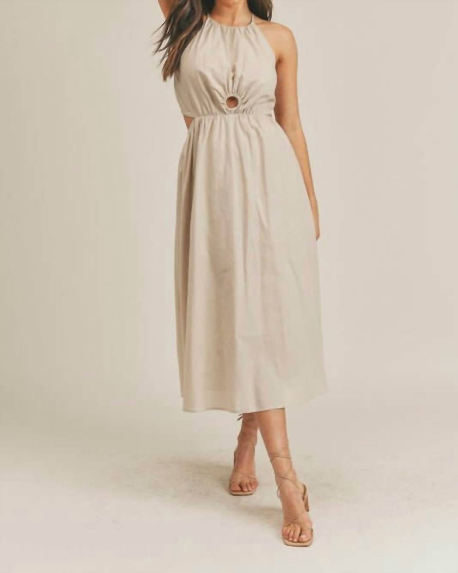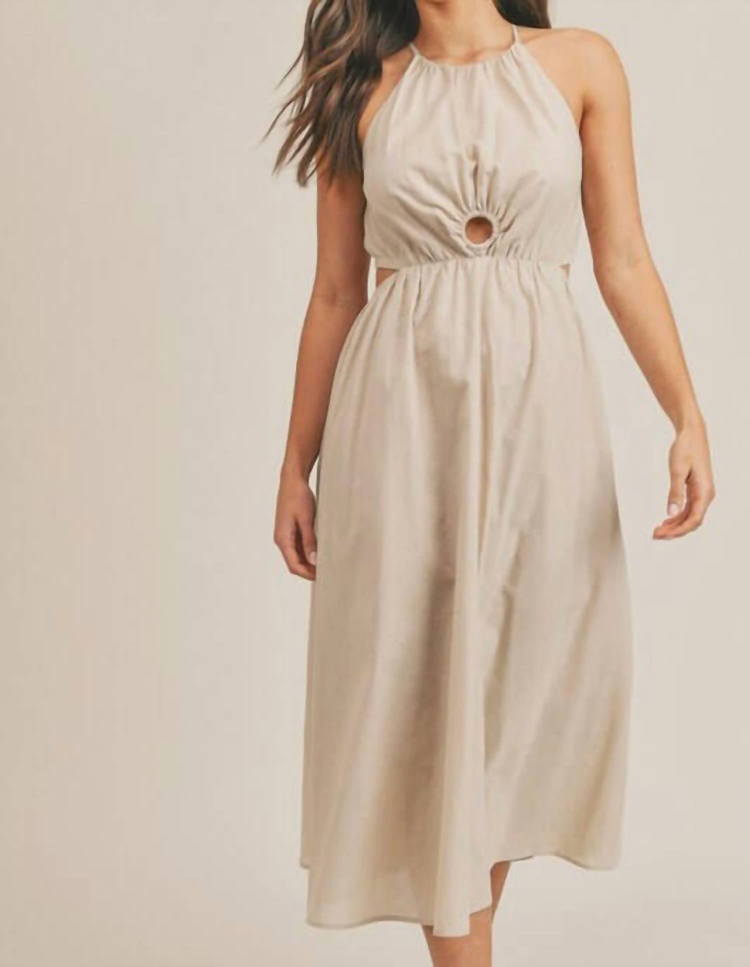 The perfect length dress does exist. Step into summer with the Cut Out Midi Dress by &merci, the perfect blend of style and comfort. This sleeveless sheath dress, available in Almond and Green, features a flattering halter neckline and a chic open back. Made from 100% Polyester, it showcases a playful front ring cutout and a convenient pull-on closure for easy wear. Ideal for any summer outing, this dress promises effortless elegance without compromising on comfort.