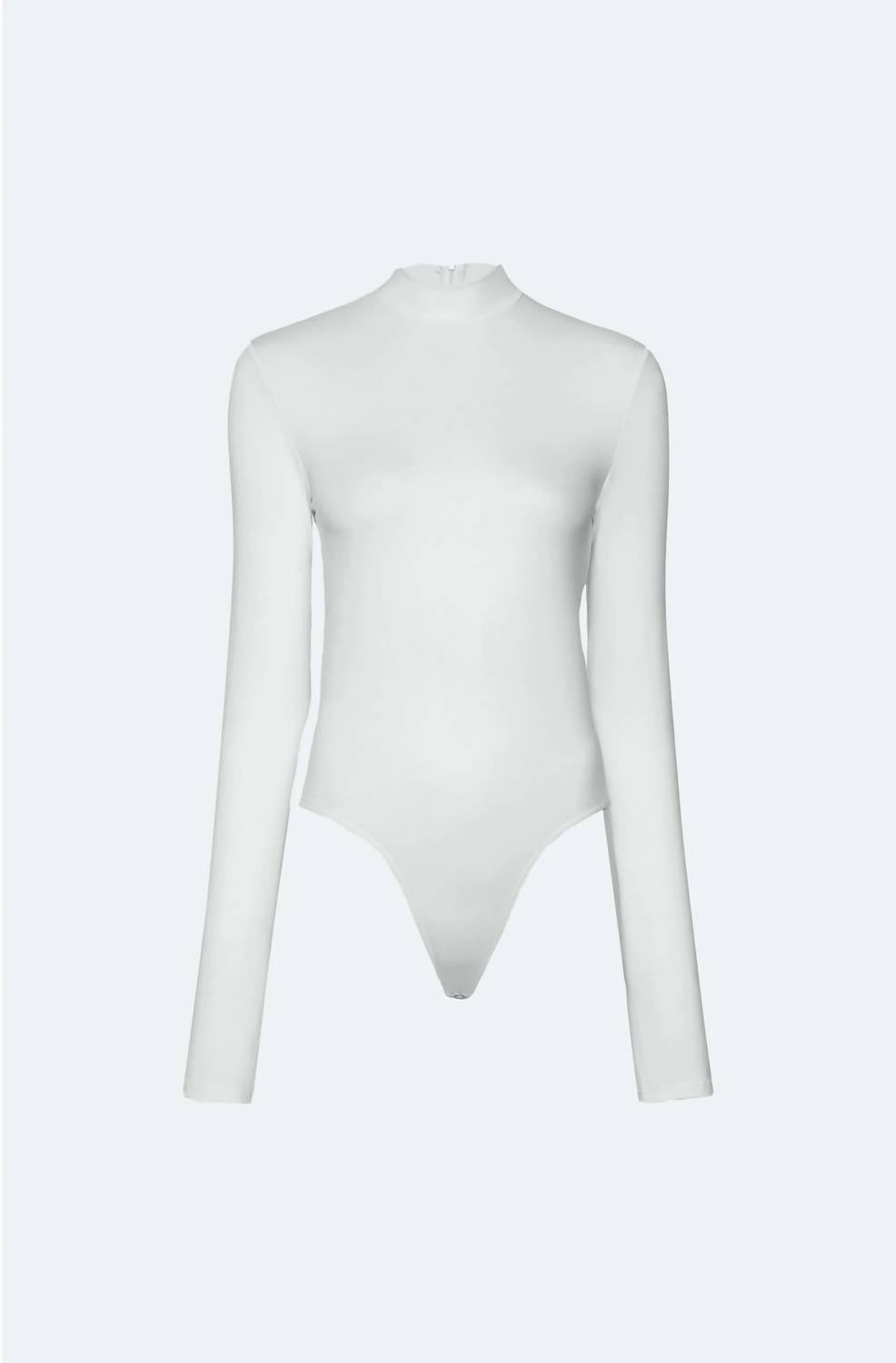 Pair this number with your favorite high-waisted jeans. The Compact Jersey Mock Neck Bodysuit by LAPOINTE is the epitome of minimalist elegance, tailored for versatility. Featuring long sleeves and crafted from 83% recycled polyester and 17% elastane, this optic white bodysuit offers a sleek silhouette with stretch fabrication for seamless layering. A convenient invisible back zipper and snap closure ensure a flawless fit. Care for this piece with a simple machine wash in cold water. The model, standing at 5'10", is wearing a size S.
