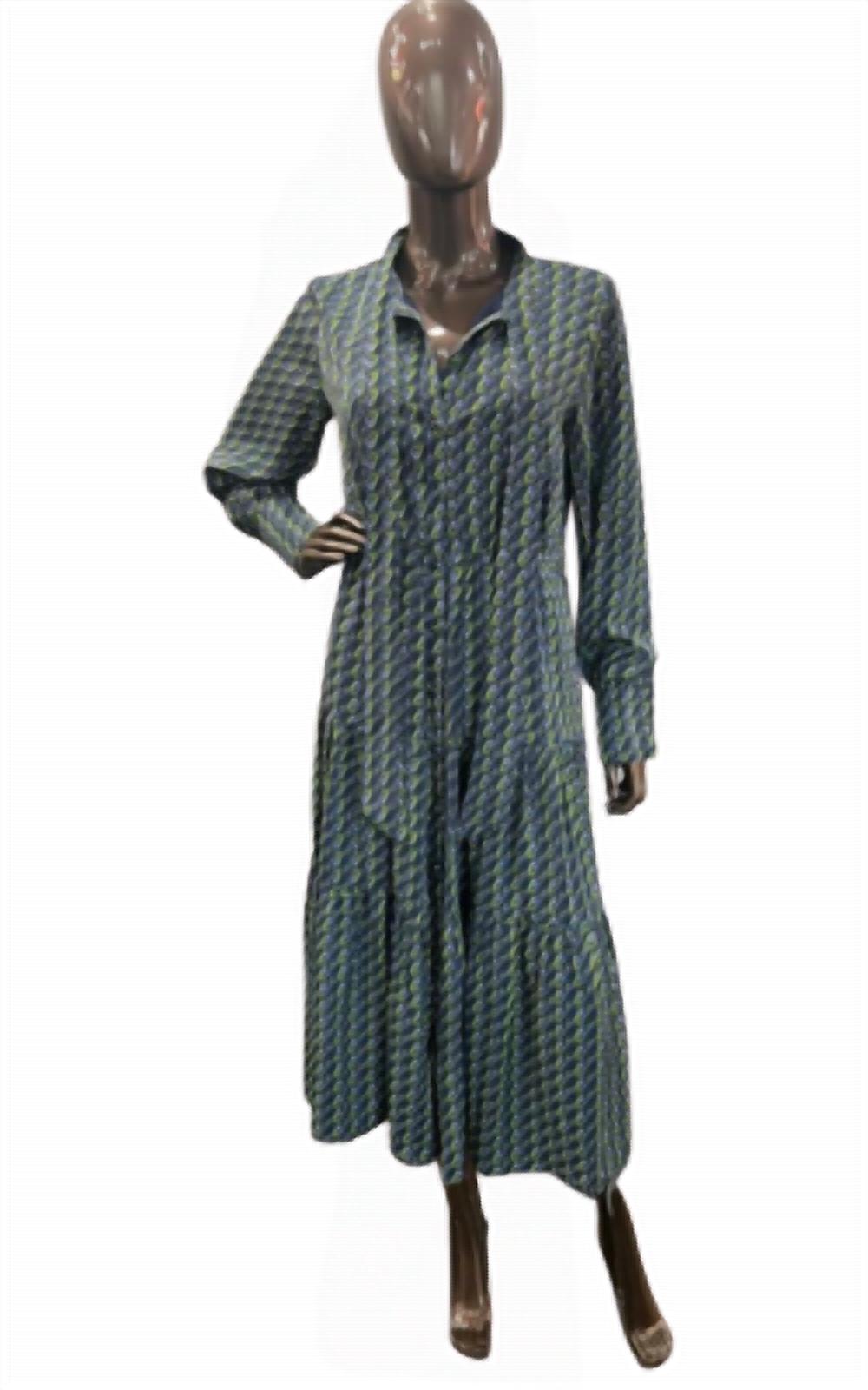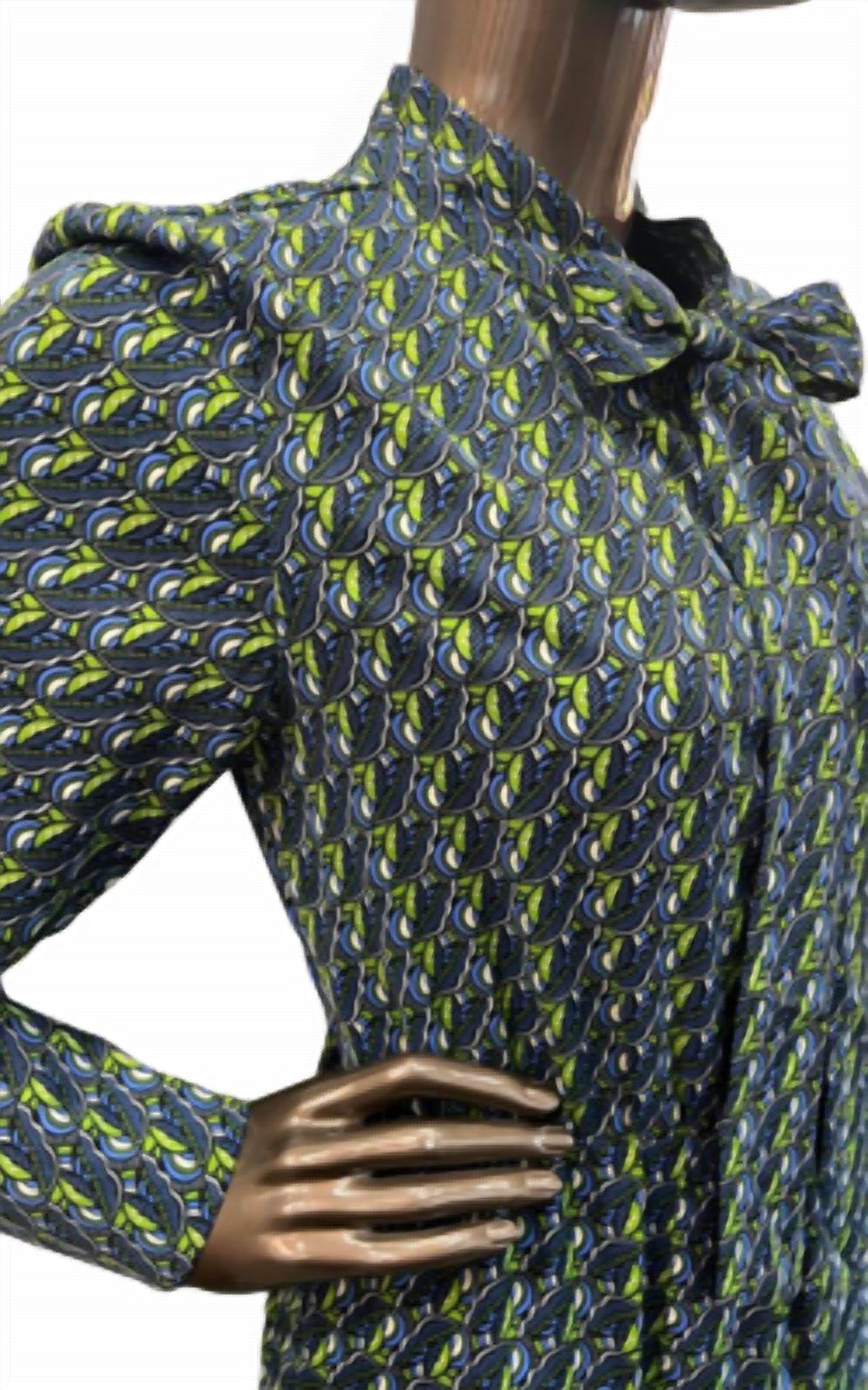 Mid length printed dress with tie neck. Hand Wash. Runs true to size