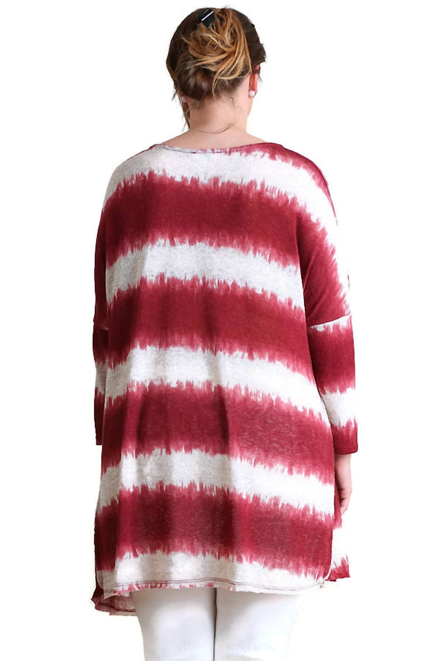 It features a tie-dye striped design, dropped shoulders with 3/4 sleeves, a V-neckline, surged seams, a high-low asymmetrical hemline, soft knit fabric, and an oversized relaxed A-line silhouette. XL Bust 52" Length 33". 1X Bust 54" Length 33.5". 2X Bust 56" Length 34". Sides & back are longer. 97% polyester, 3% spandex. Made in the USA.