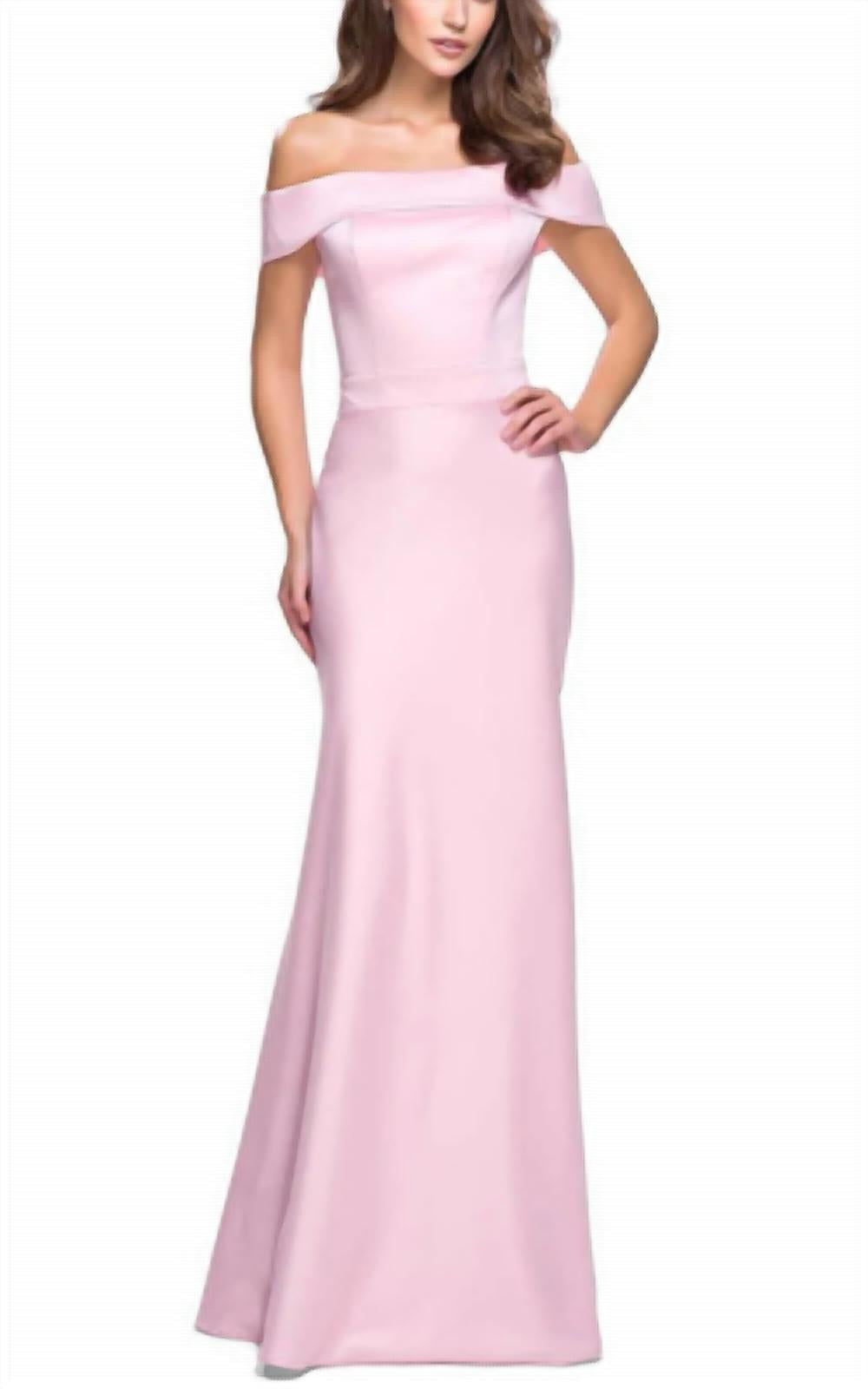 Off-the-shoulder dress with zip up back. The bodice is smooth and moves into a gently flared skirt with a full length hem. It’s a fabulous look that is sure to get you noticed at your next special occasion. Professional spot clean only
