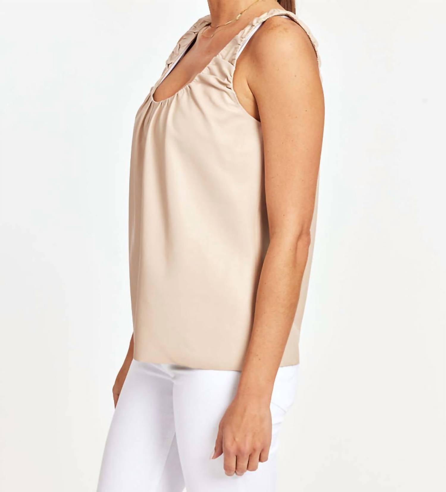 Faux leather tank top. Unique gathered neckline. Sleek profile. Versatile for daytime or nighttime wear. Pair with jeans or skirts for a contemporary look. Also pairs well with flowy maxi skirts for a romantic vibe. 100% Nylon. Hand wash cold.