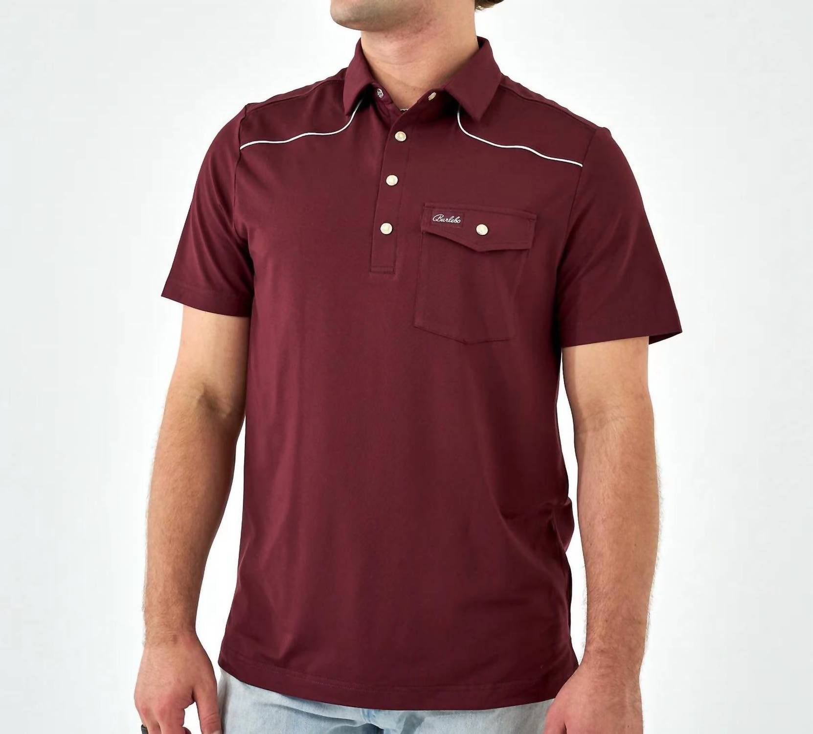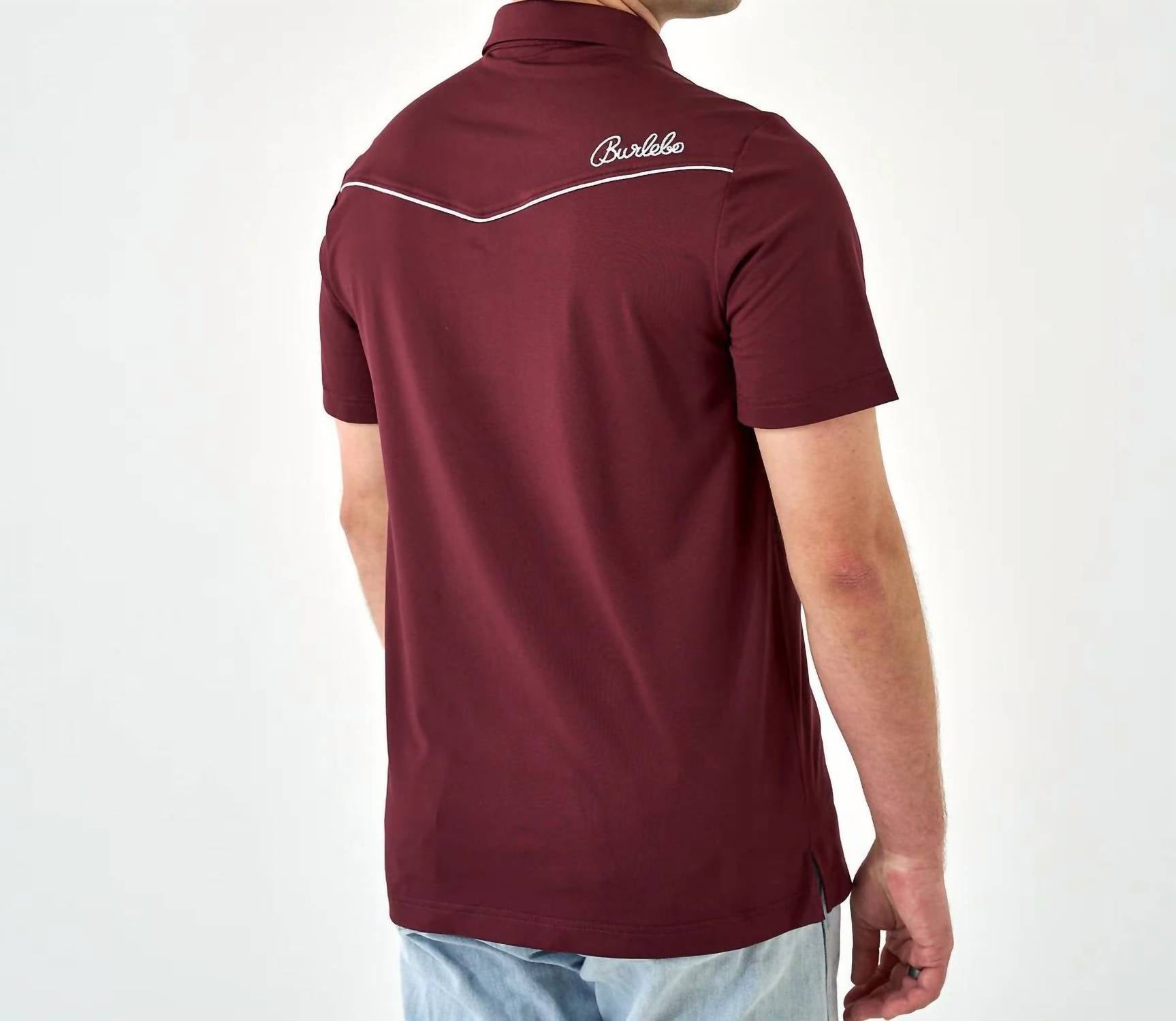 Introducing the Pearl Snap Performance Polo by BURLEBO, a solid maroon piece perfect for summer adventures. This short sleeve polo combines style with the functionality of its 91% Polyester and 9% Spandex composition, providing comfort and flexibility. Enjoy UPF 50 sun protection with quick-drying, moisture-wicking, and anti-microbial features ideal for vacations or casual outings. Closure: Button closure. Care: Machine wash, line dry.