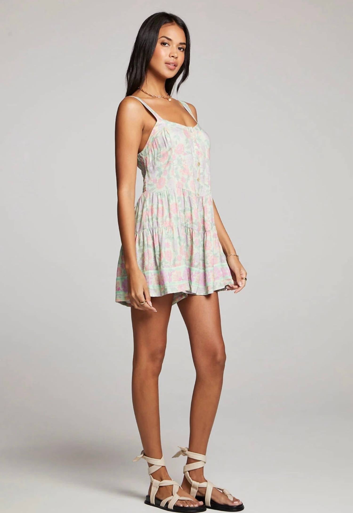 Easy-to-wear outfit that features a front button detail, a ruffle trim, back ruching, and a pretty floral print. Measurements taken from X-Small: 15" Chest. 29.5" Length. Hand wash cold. 100% Rayon.