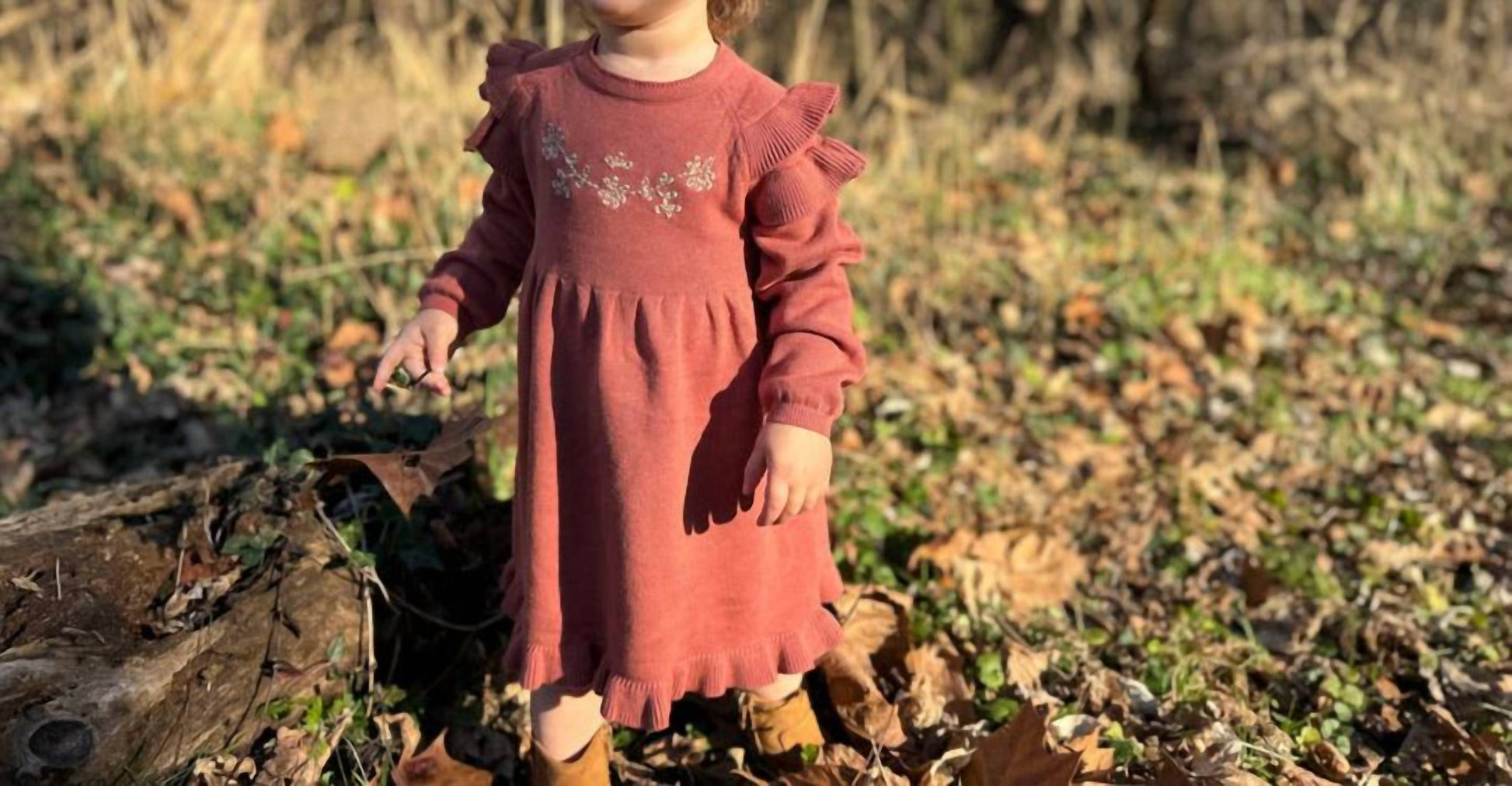 Introducing the Ysella Knit Sweater Dress by ettie + h, a charming piece in vibrant Rust. Crafted from cozy knit material, this dress features playful ruffle sleeves and delicate floral embroidery for a touch of elegance. Perfect for a casual day out or a Thanksgiving gathering, it embraces a trendy minimalist style. Designed for girls who love to showcase their unique fashion sense, this dress is a perfect addition to any wardrobe.