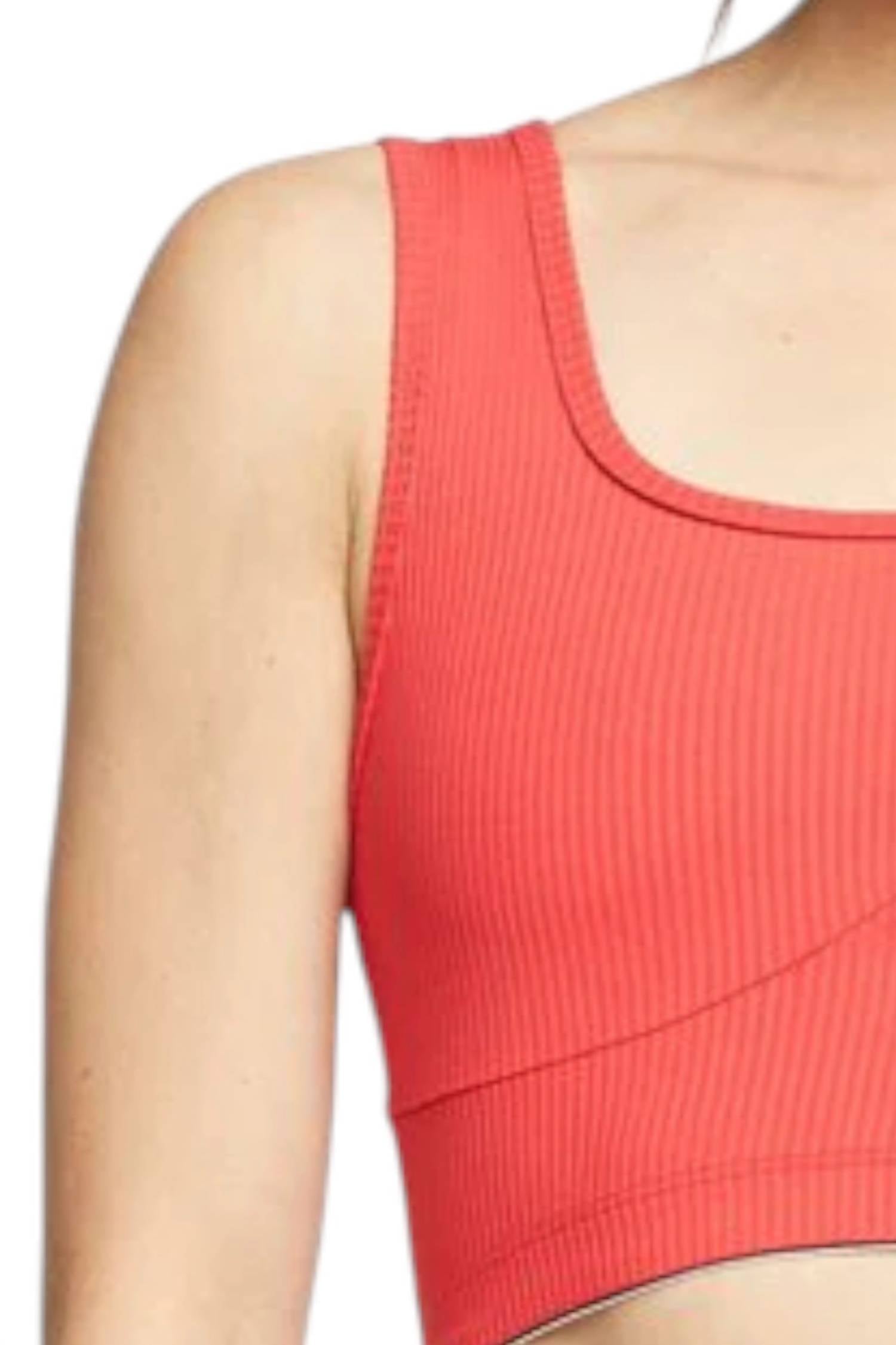 The most comfortable and stylish bra that you'll reach for daily. Meet the Ribbed Gia Sports Bra by YEAR OF OURS in a vibrant red, perfect for your athleisure wardrobe. This women's bra features a textured pattern and is crafted from an 85% Nylon, 15% Spandex active jersey blend. Proudly made in the USA, it’s designed for fitness or workout occasions, especially fitting for Summer and celebrations like the 4th of July. Care is simple with machine wash cold and lay flat to dry. Model is wearing a size small.