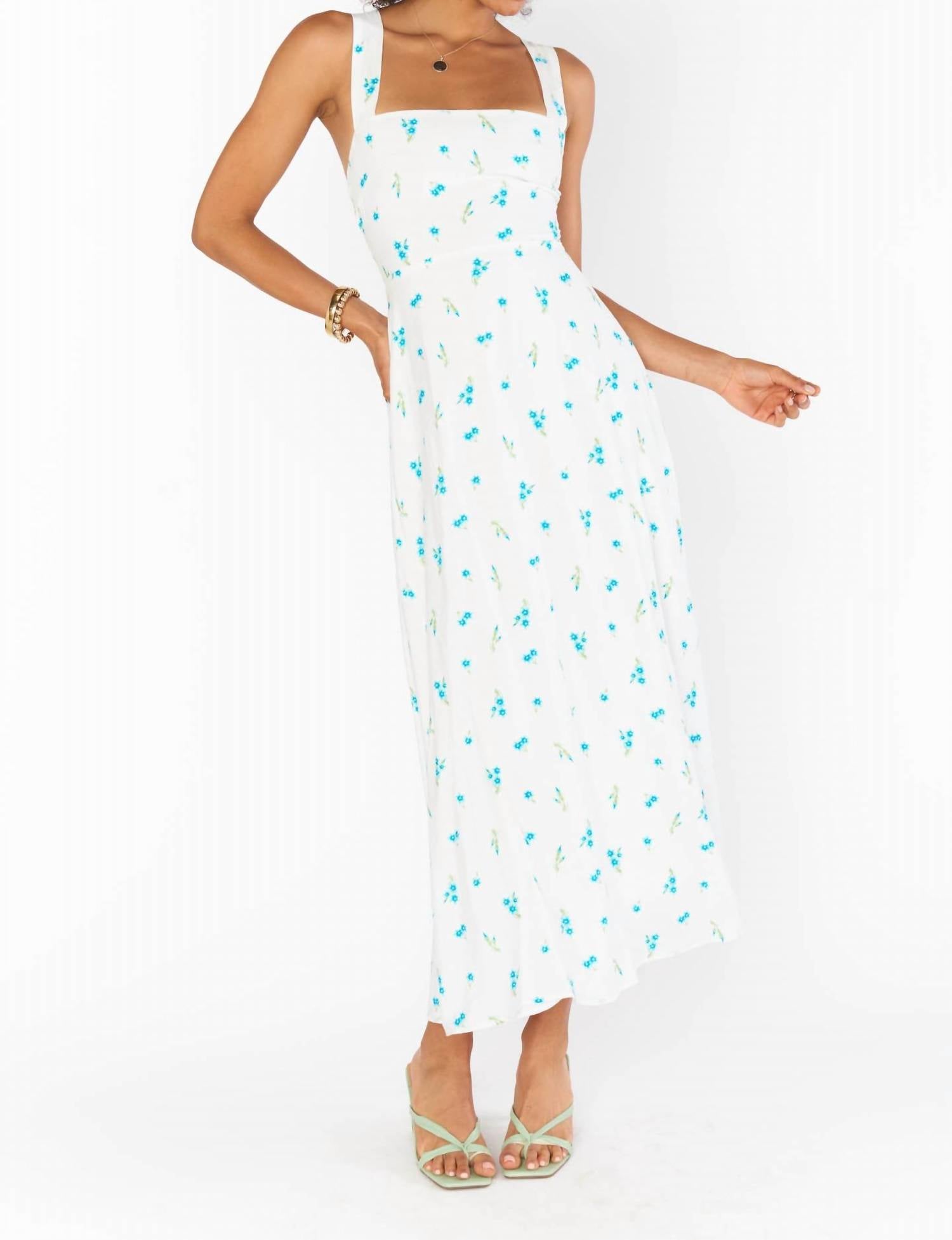 Charming Bluebell Ditsy print. Crafted from lightweight and breathable rayon. Square neckline and sleeveless silhouette. Playful open back with a tie closure. Midi length. Medium weight drapey fabric. 85% Rayon. 15% Nylon. Lining: 100% Rayon. Open back. Criss cross ties. 53" shoulder to hem.