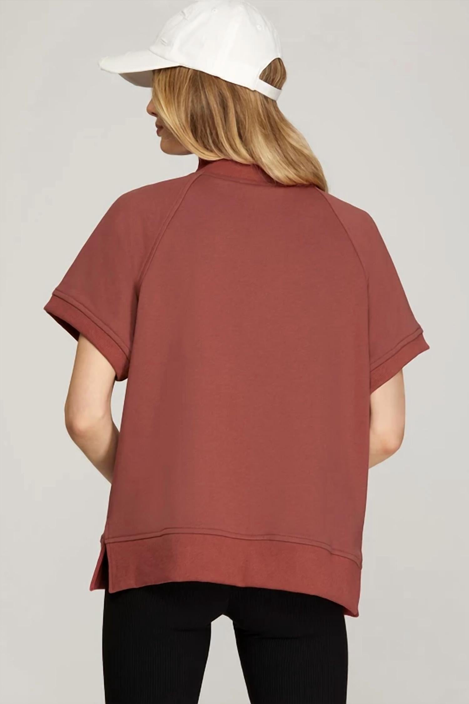 Pair this with your favorite jeans and slides for your next girls night out. The Brickyard French Terry Top by SHE + SKY is a chic and minimalist blouse perfect for holiday parties. This solid red piece features a collar and convenient zip closure, complete with short sleeves and functional pockets. Made from comfortable cotton, it's ideal for spring gatherings like Thanksgiving. Please note that care instructions are not provided.