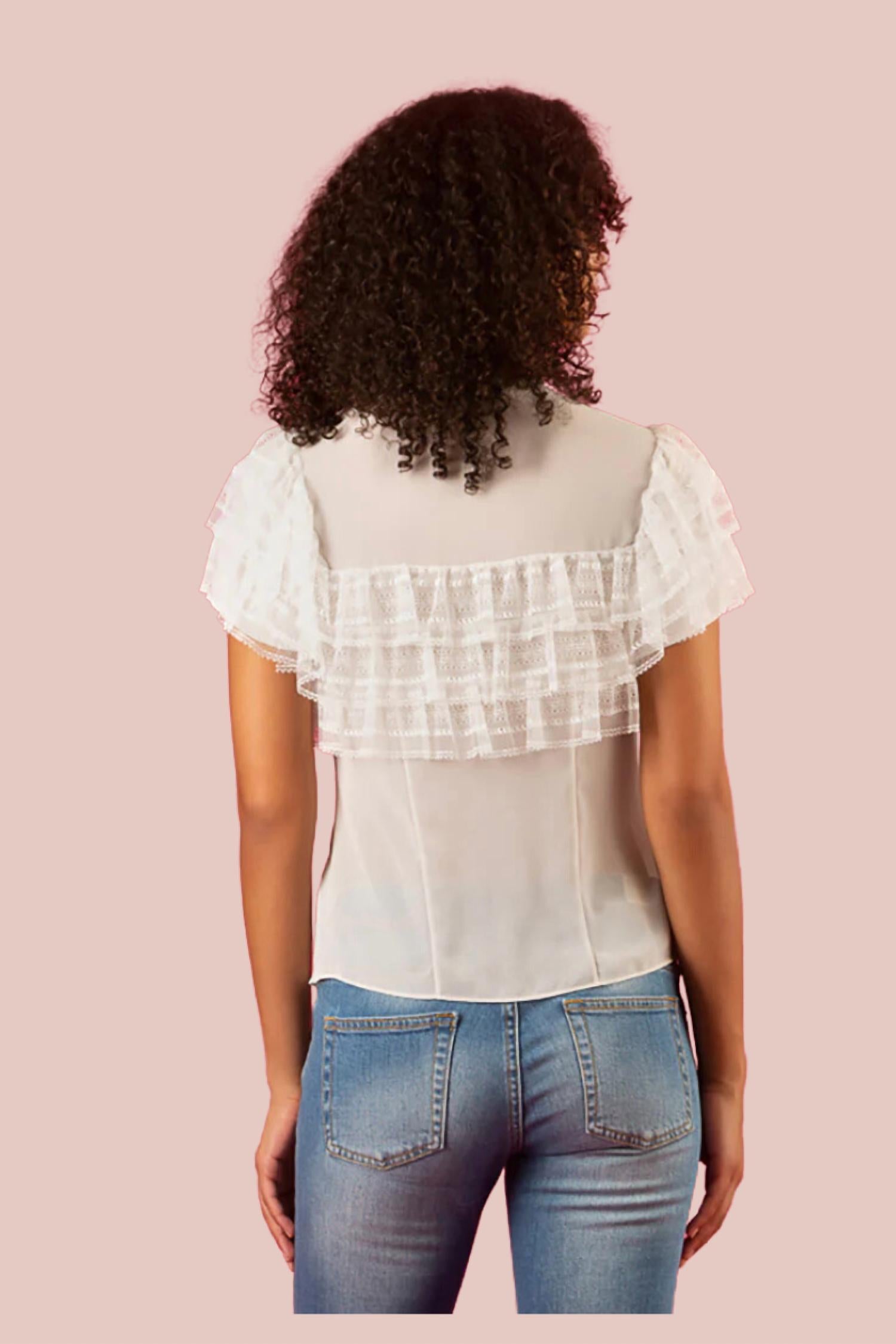 Chiffon blouse with hidden button CF and tulle ruffle details on sleeve and shoulder. Material: 100% Polyester.