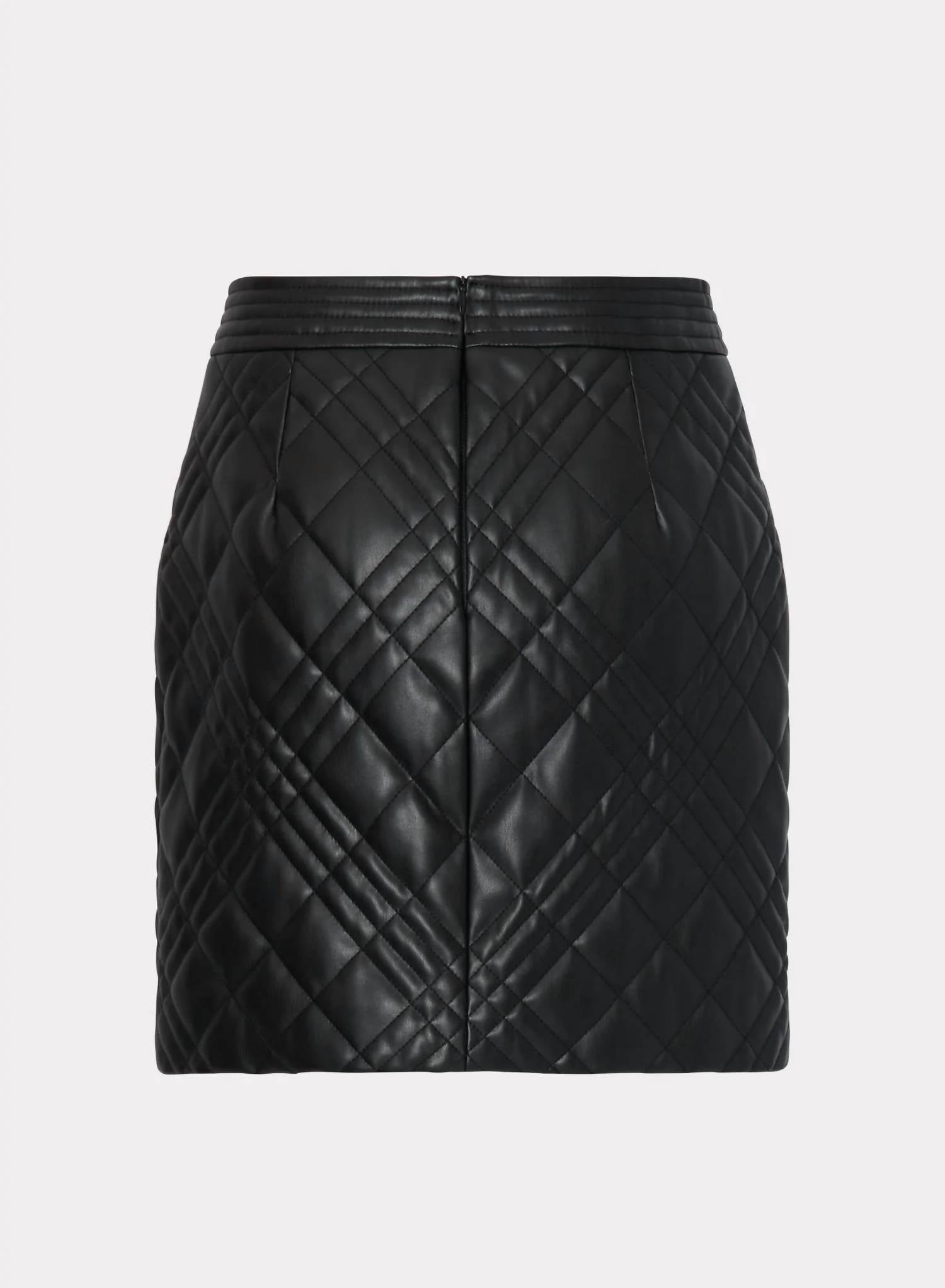 Quilted Vegan Leather Mini Skirt. Lined. Back Zipper. Model is 5’10 and is wearing a size 4. Approx 16.5" in length from top edge to hem. Dry clean only.
