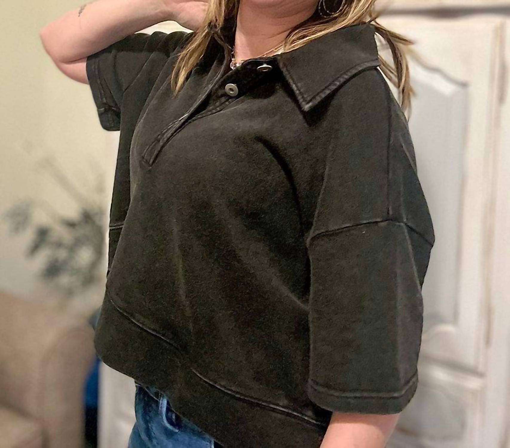Whether you're running around town or lounging at home, this sweatshirt works for both. Casual comfort meets effortless style in our black Mineral Wash Terry Crop Sweatshirt! Perfect for days when you want to stay cozy without sacrificing style, this top is designed in an ultra-soft sweatshirt black material that feels as good as it looks. Featuring a relaxed cropped fit, a wide hem for structure, and button details at the collar, this top adds a polished touch to your laid-back look. Whether paired with high-waisted jeans, leggings, or layered over a tank, it's the ultimate go-to for a stylish yet comfortable outfit. Stay comfy, stay chic—because you should never have to compromise on style! Fabric: 60% Cotton, 40% Polyester