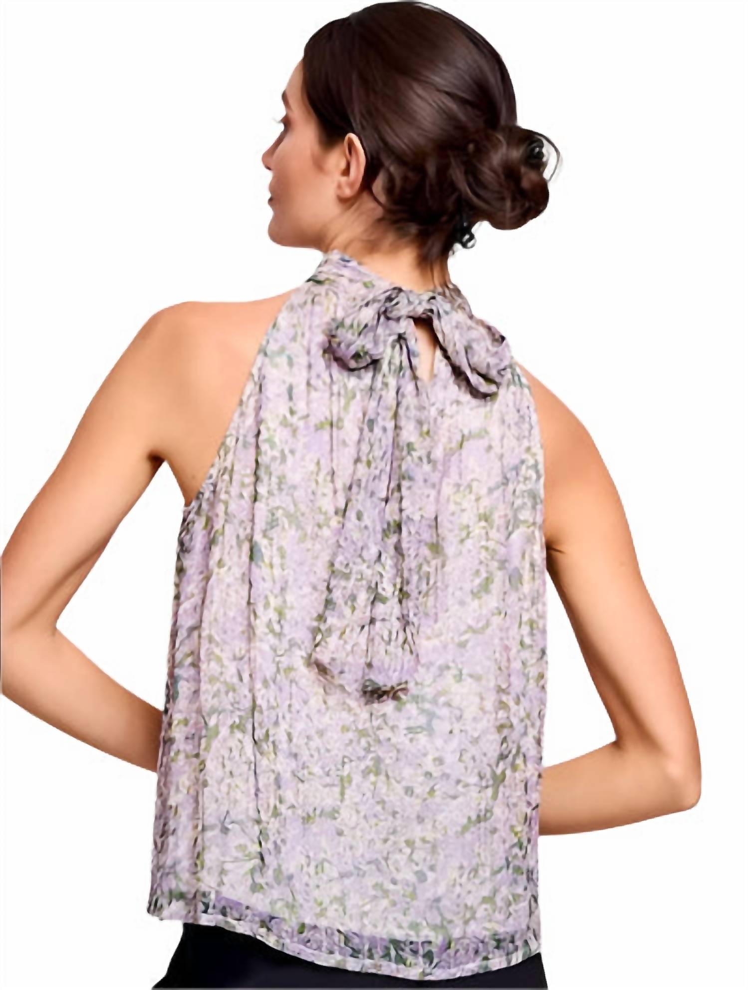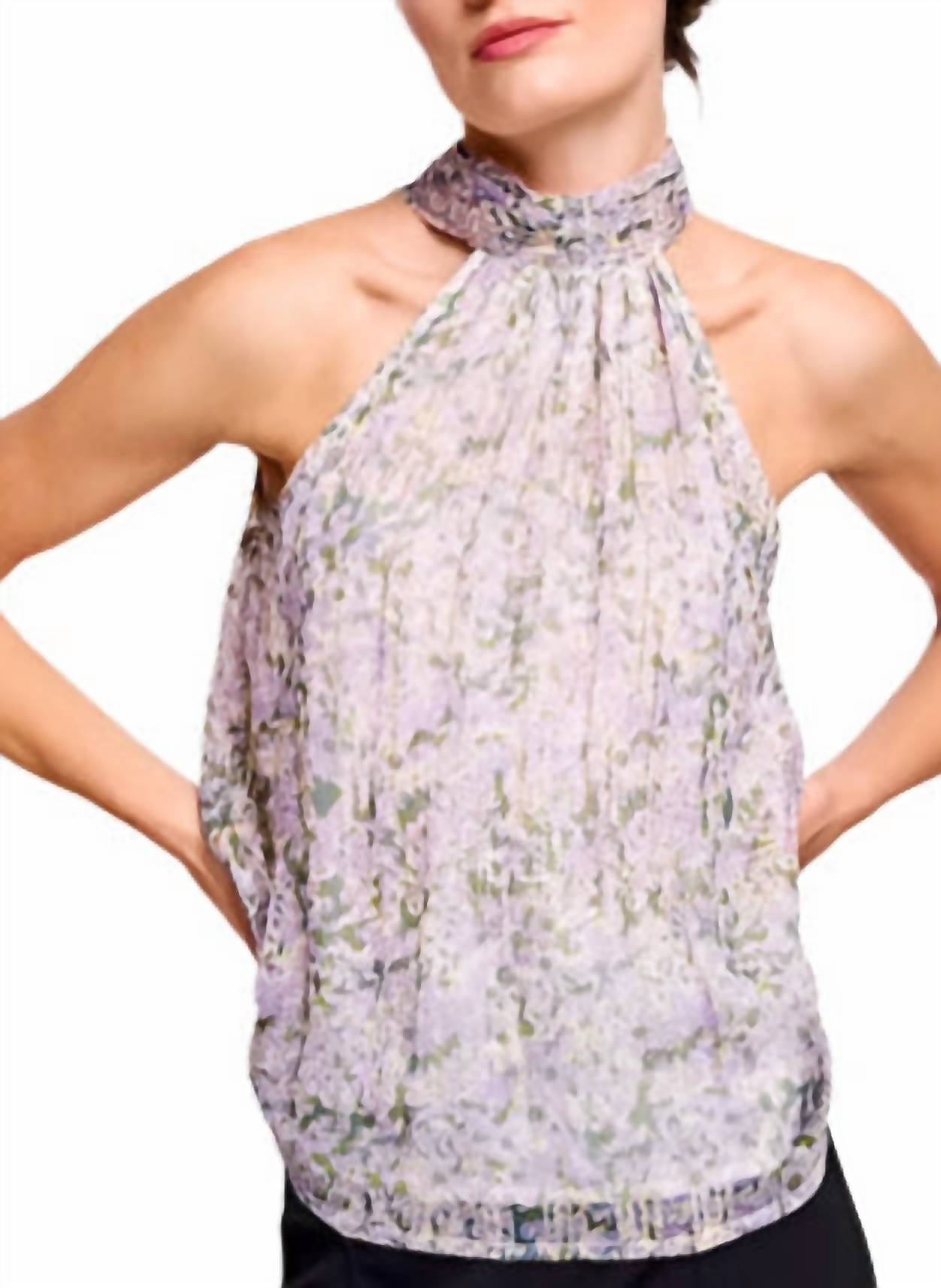 Pair this with your favorite jeans and slides for your next girls night out. Introducing the CIEBON Etna Floral Halter Top, a stunning addition to your boho chic wardrobe. This strapless blouse features a captivating floral pattern in lavender, green, and cream, enhanced by metallic details for an elegant touch. Closure: Pull-on style with a high neckline and a charming back bow detail. Care: Hand wash and lay flat to dry, perfect for special occasions like Valentine's Day.