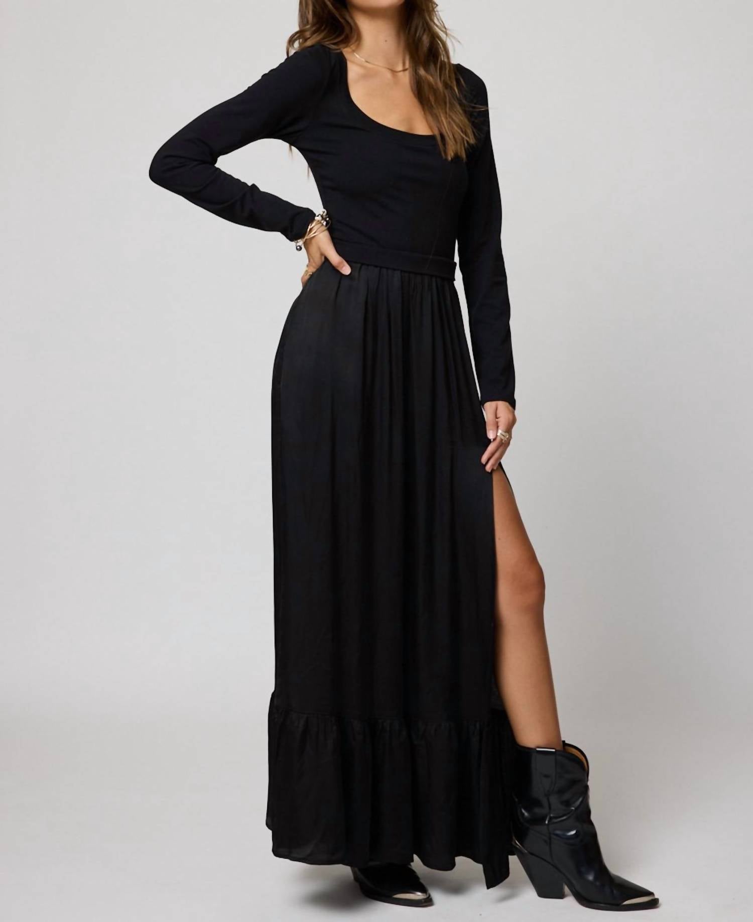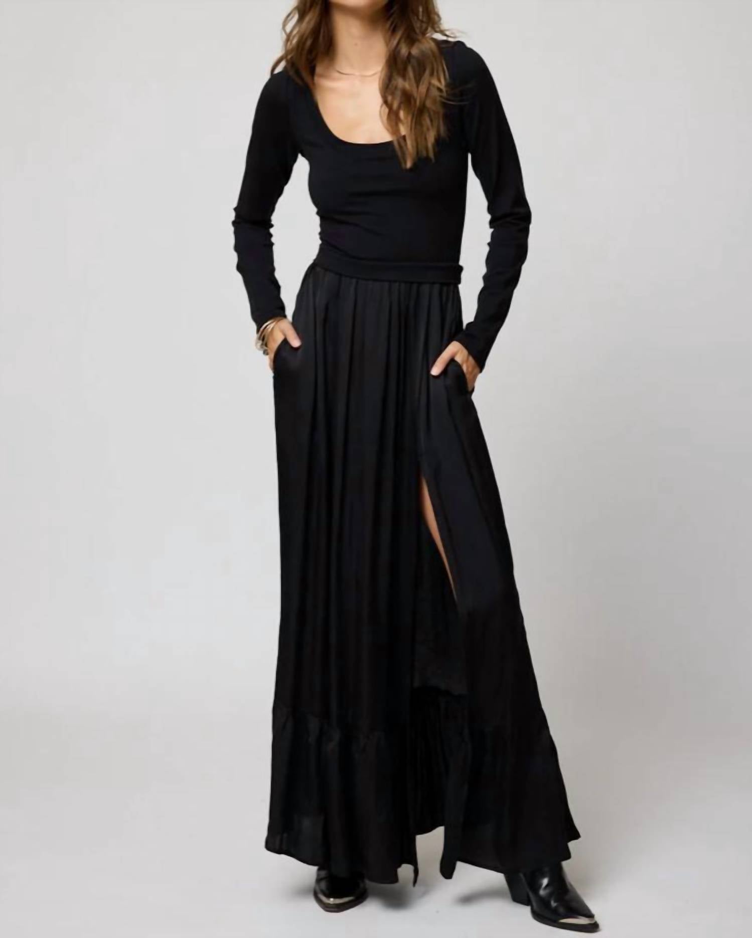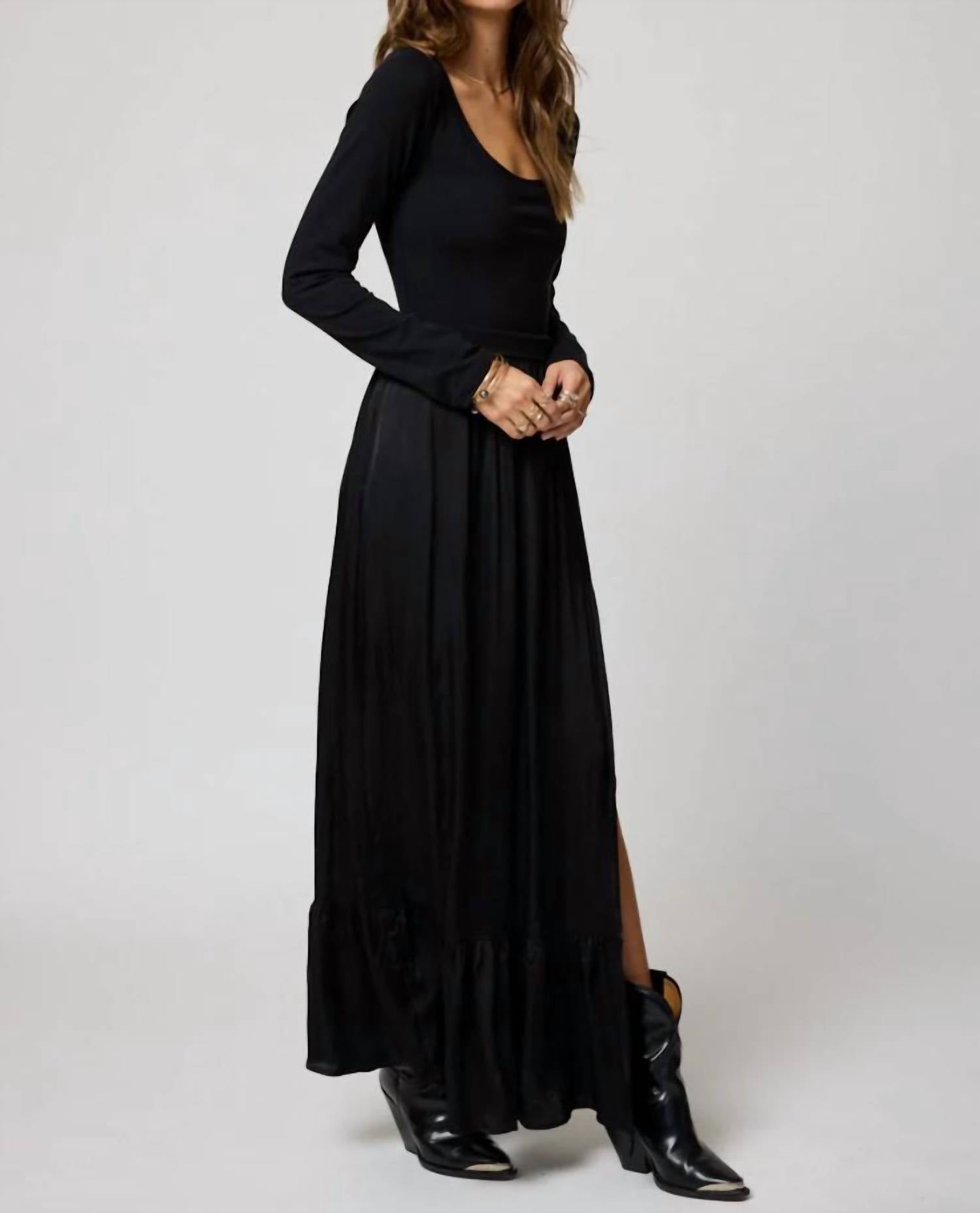 A maxi dress that is just as cute as it is comfortable. Embrace elegant simplicity with the Valentina Maxi Dress by Stillwater in a timeless black hue. Featuring a long sleeve scoopneck top crafted from a luxurious blend of 63% Tencel, 27% cotton, and 10% spandex, this dress ensures comfort and ease. The skirt in this maxi silhouette is made from 100% viscose satin, while its zip closure ensures a tailored fit. Care for this chic number by dry cleaning to maintain its sophisticated allure.