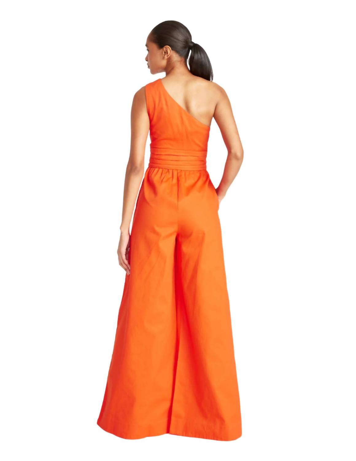 Wide leg design creates a flattering silhouette while the cotton twill fabric. One shoulder twist top. Concealed side zipper. Inseam: approx. 29.5". Model is 5'11" and wearing a size 2. 100% BCI Cotton.