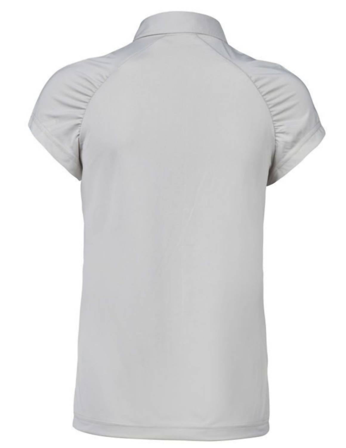 Press studs at the neckline. Moisture-wicking Quick Dry. Cap Sleeve. mall pleats at sleeves. Self collar. 6 button placket. Straight hem. Regular fit . True to Size. Machine wash cold. 88% Polyester. 22% Elastic.