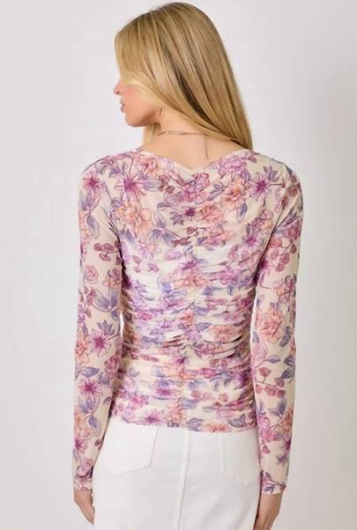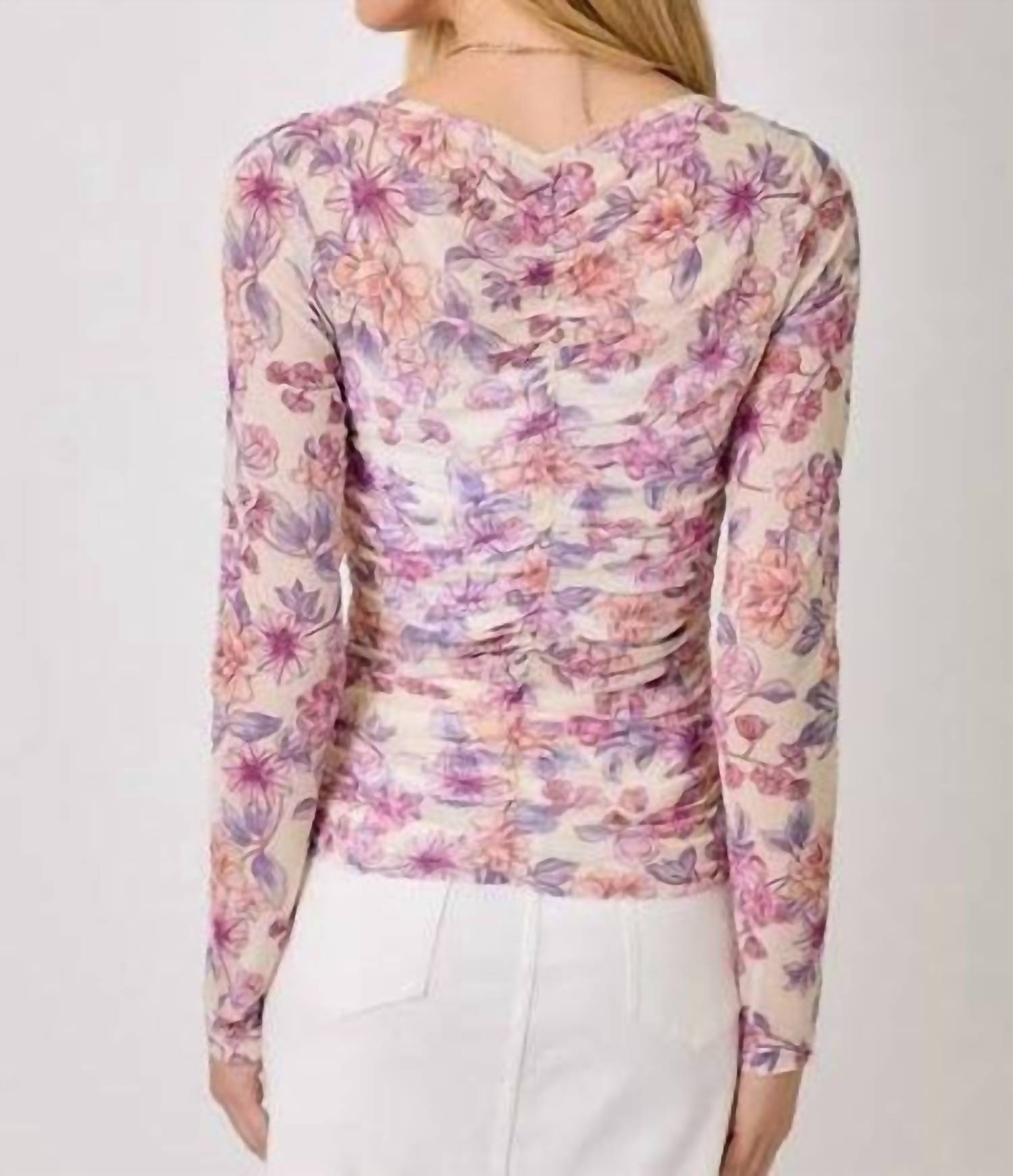 The perfect long sleeve tee that goes with just about anything. Embrace elegance with the Mystree Ruching Floral Mesh Top, showcasing a delicate pale blue floral pattern perfect for spring travels. This long sleeve tee features a flattering V-neck, with ruching on the front, back, and sides for a dynamic look. Crafted from 92% polyester and 8% spandex, it offers a comfortable stretch as a pull-on style. Care instructions: Hand wash. Model wears size S and is 5'9".