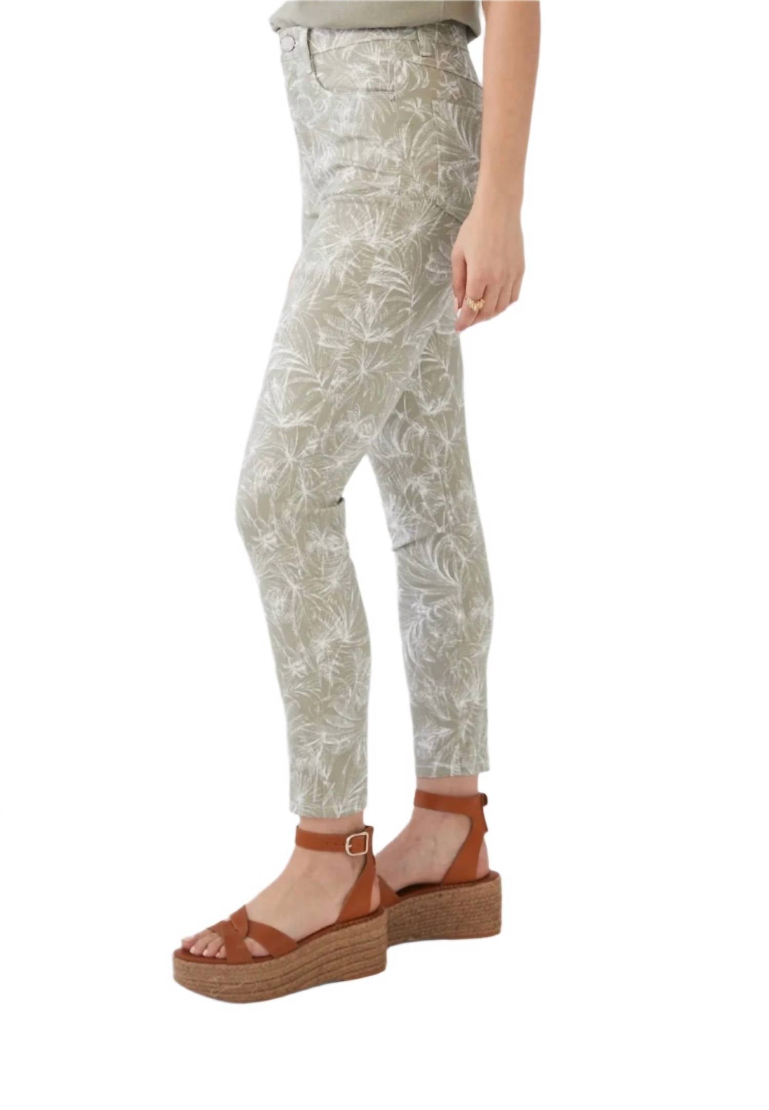 We especially love this cropped jean with a cute pair of slides or sandals. Introducing the FDJ Suzanne Mid-rise Jeans, designed for women who love to combine style with comfort. These slim ankle jeans feature a playful Palm Scribble print in green, adding a fun twist to your spring wardrobe. Crafted from a cotton blend of 66% cotton, 31% polyester, and 3% elastane, they promise durability and a flattering fit with their mid-rise waist. Closure: Pull-on style for easy wear.