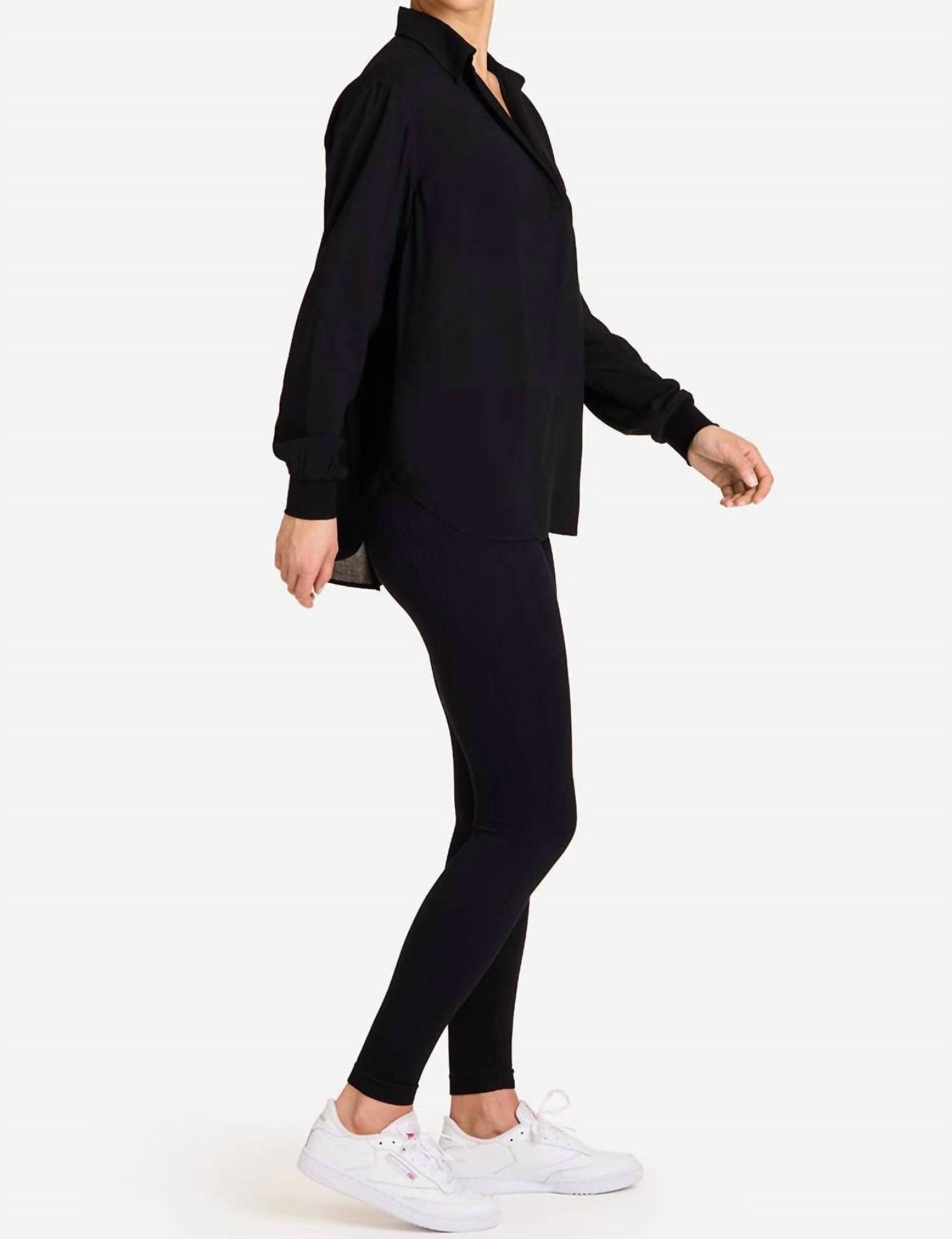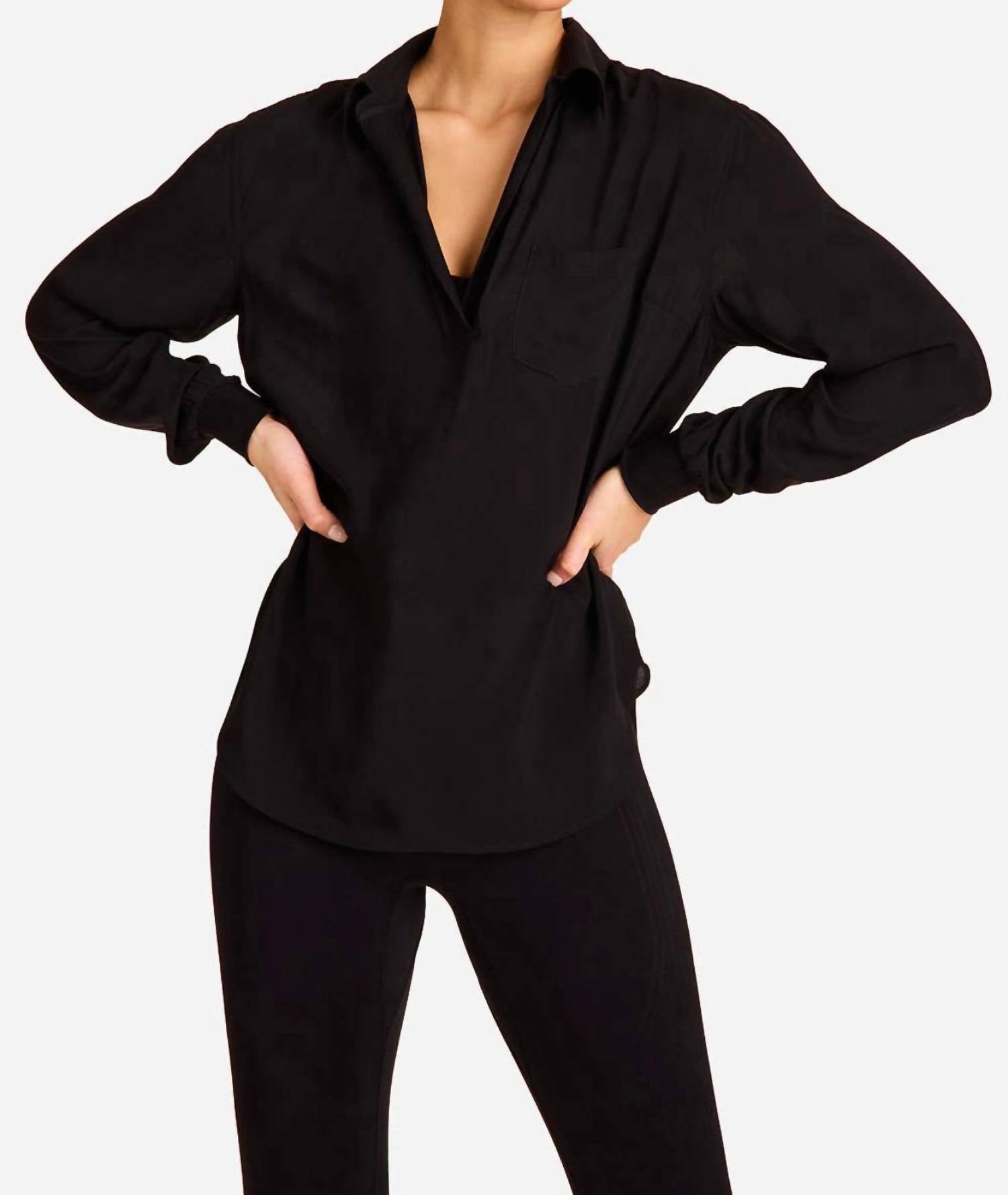 Lightweight woven pullover shirt with a loose fit and long sleeves. Front pocket with rib trim at placket and cuffs. 70% rayon, 30% lyocell. Machine wash cold with like colors on gentle cycle. Tumble dry low or lay flat away from direct sunlight to dry.