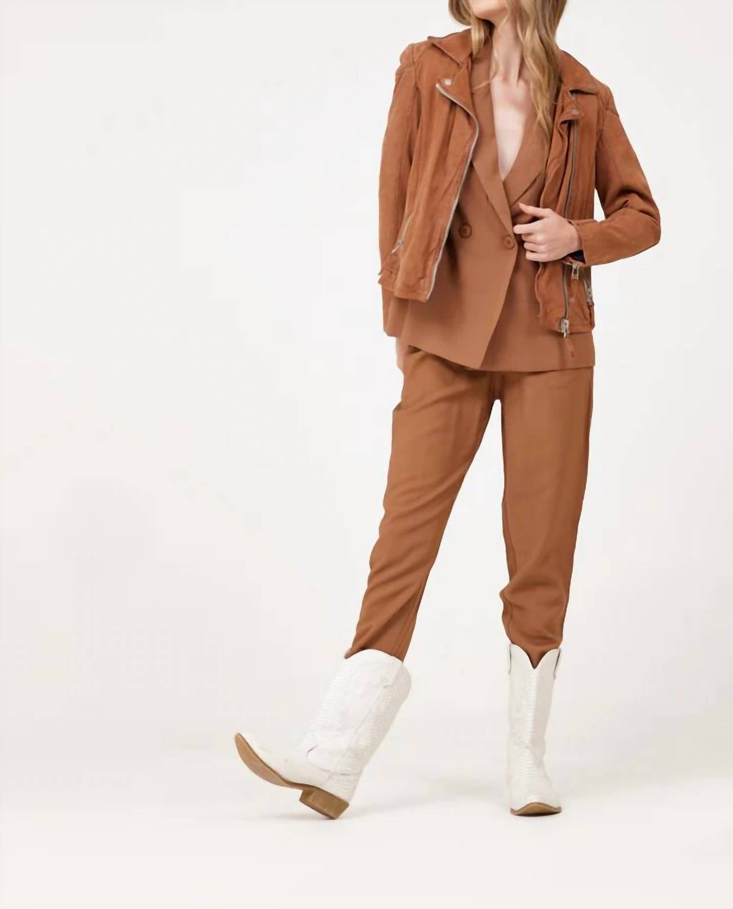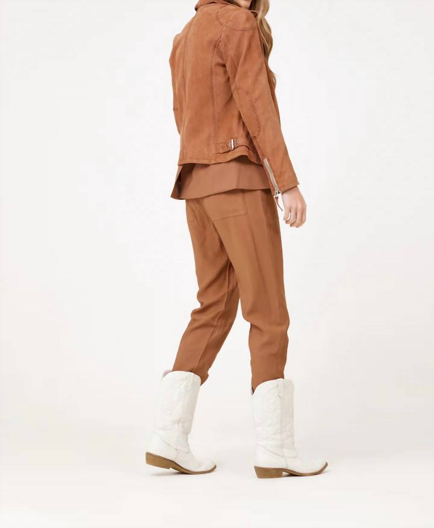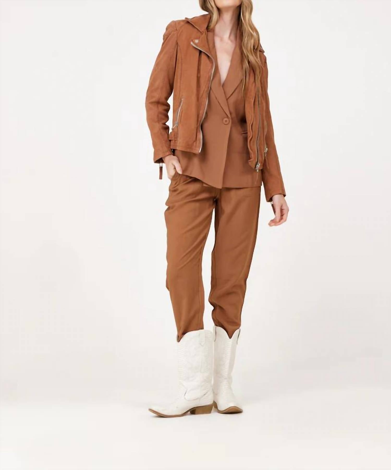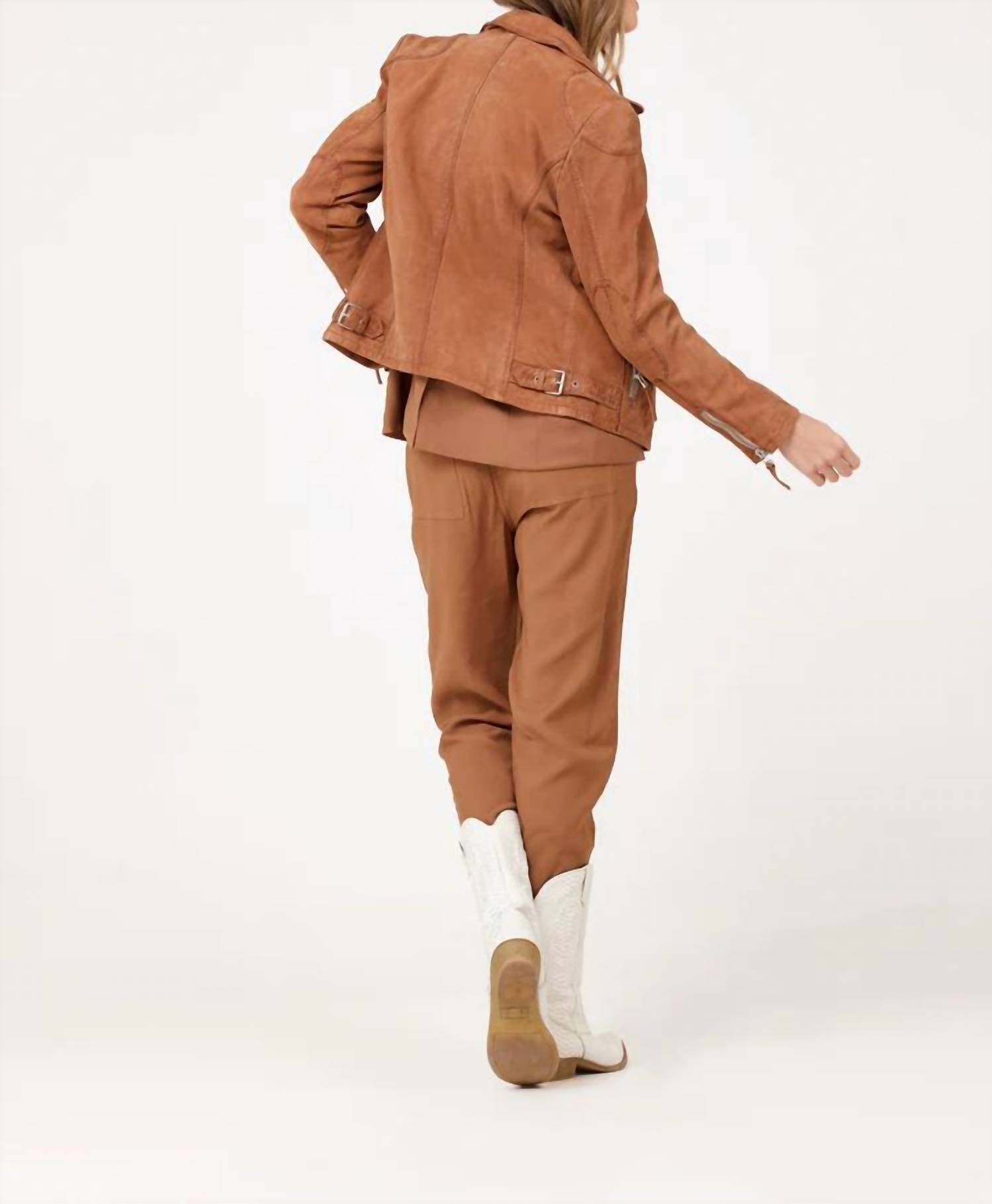 Timeless piece in a rich caramel hue that seamlessly blends style and functionality. Features long sleeves and a practical zip closure, ensuring easy wear. Crafted from high-quality leather. Offers durability and a sophisticated look. Enhanced by a collar neckline for added elegance. With its lined interior and pockets.