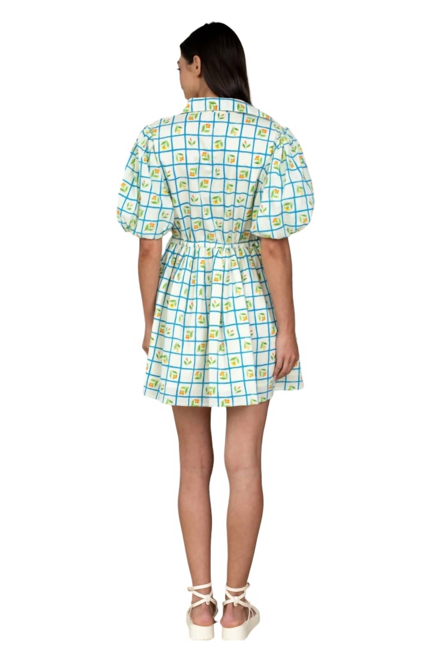 A-line style dress with a slightly gathered rounded V-neckline. Drop-balloon puff sleeves for added flair. On-seam hip pockets for functionality. Optional rope belt for styling versatility. 100% cotton. Machine wash on a cold, gentle cycle.