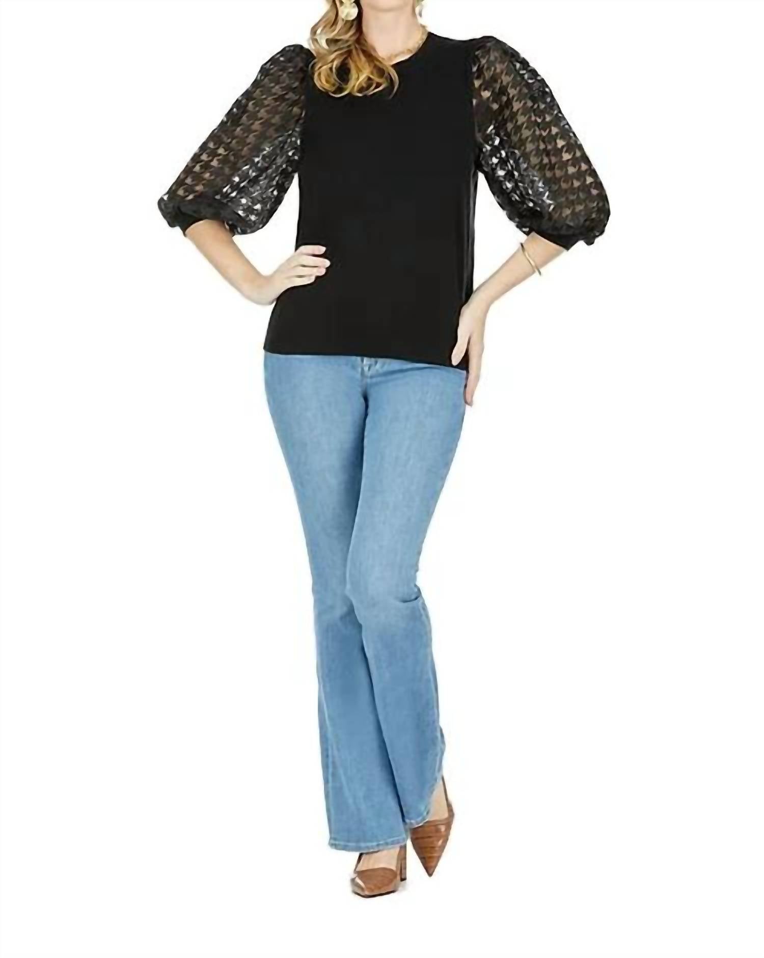 Pair this with your favorite jeans and slides for your next girls night out. Enhance your style with the Ebony Top by Jade, a chic addition in black that brings sophistication with its sheer three-quarter sleeves. Crafted from 100% acrylic, this patterned blouse is ideal for the spring season. It features a crewneck design and a convenient pull-on closure. Model is wearing a size S/M.