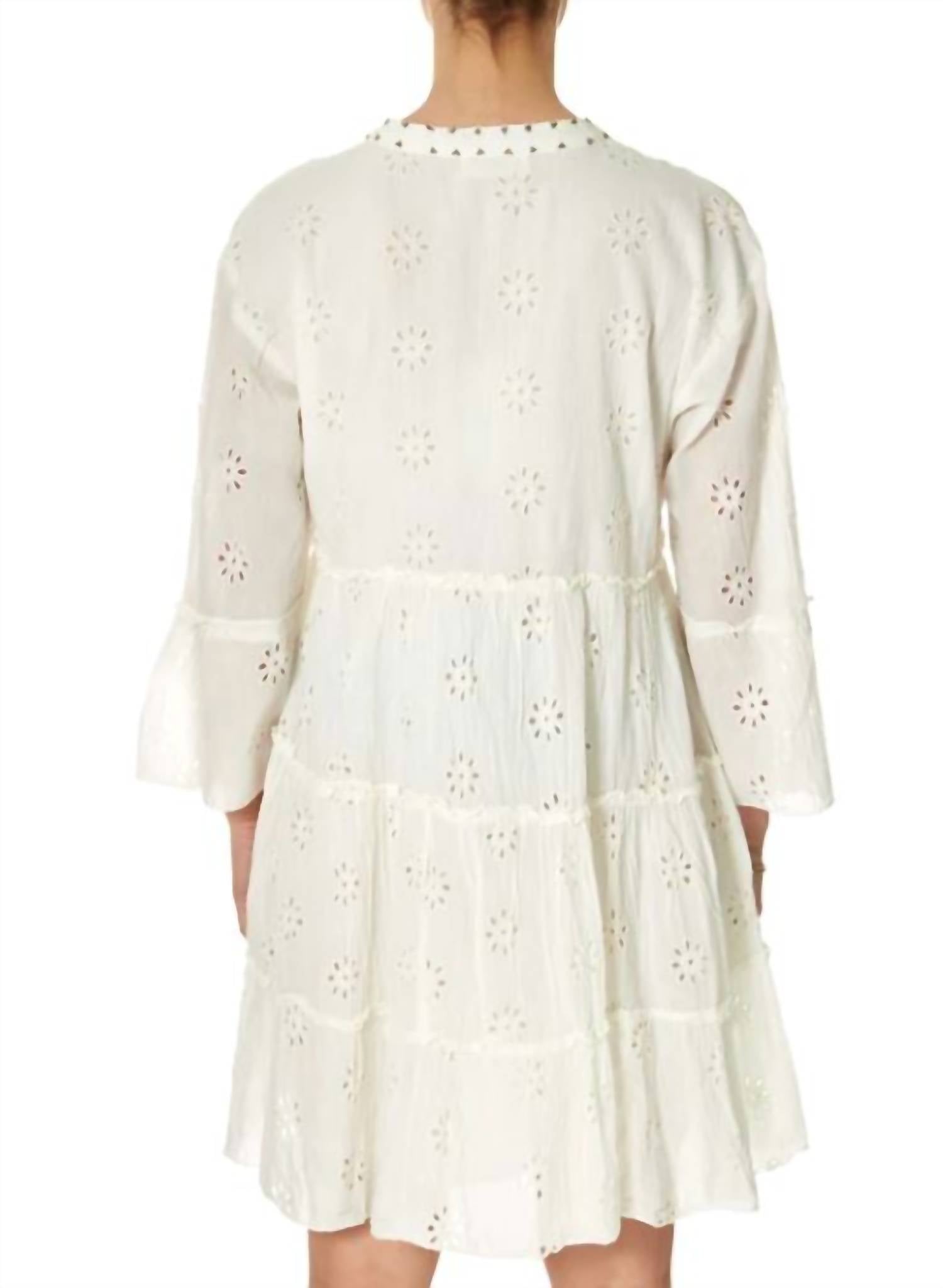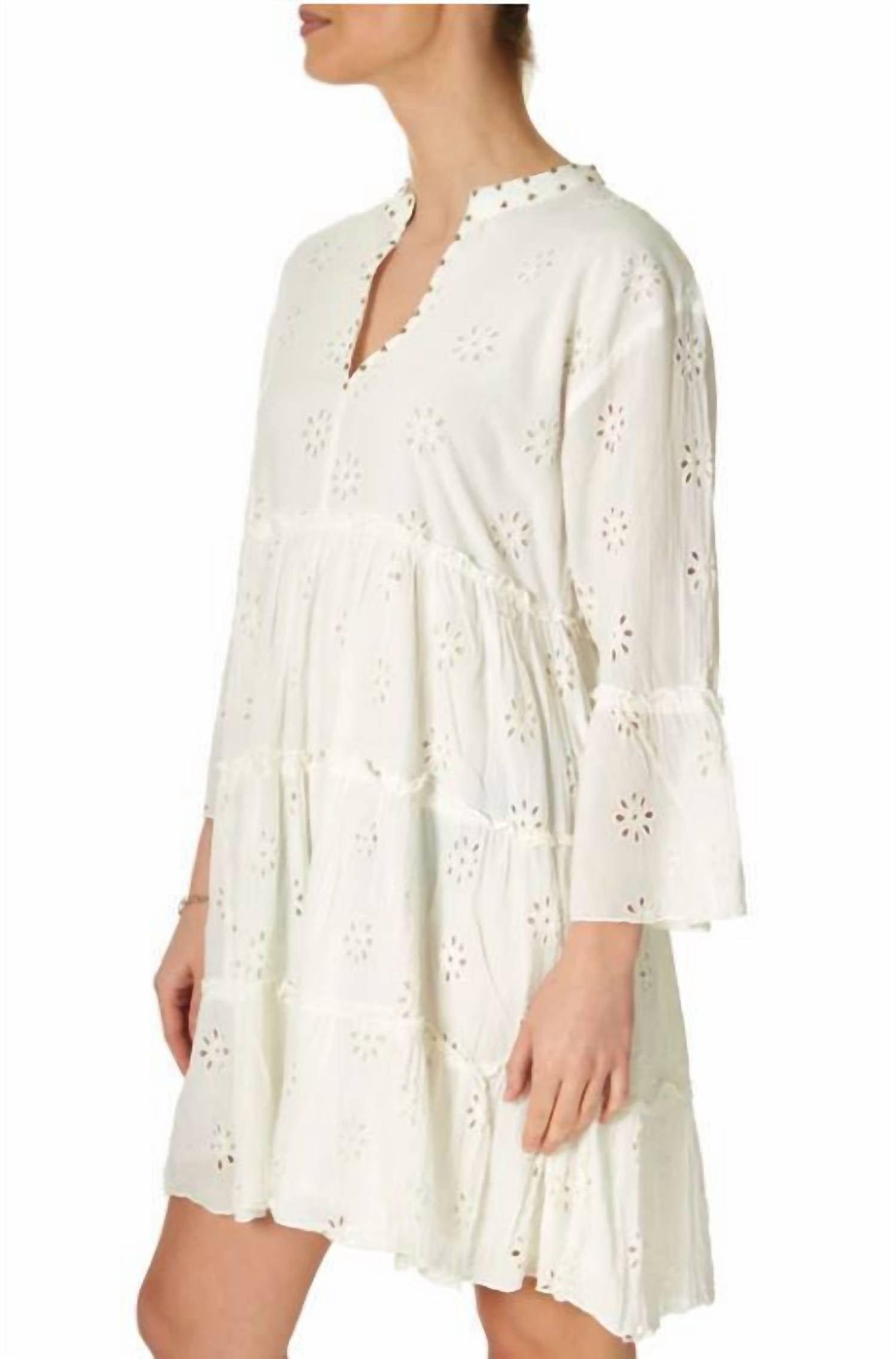 The perfect mini dress for those warmer months. Introducing the Dennis Babydoll Dress by Maison Hotel, a beautifully crafted piece in an enchanting ivory hue. This empire waist dress features a v-neckline with three-quarter sleeves and a delightful flower embroidered pattern that adds an elegant touch. Made entirely of cotton with a comfortable cotton lining, it offers a pull-on closure for ease of wear. Perfectly combining style and comfort, this mini dress is an ideal choice for a sunny holiday ensemble.