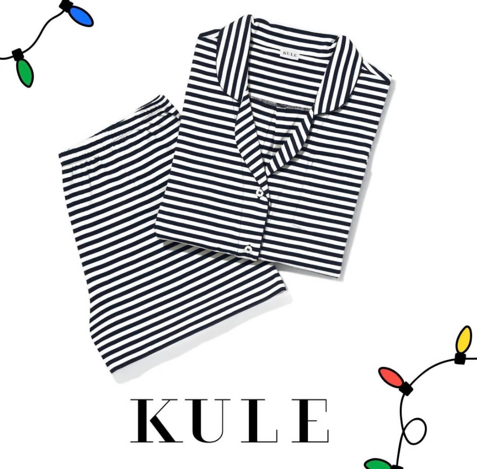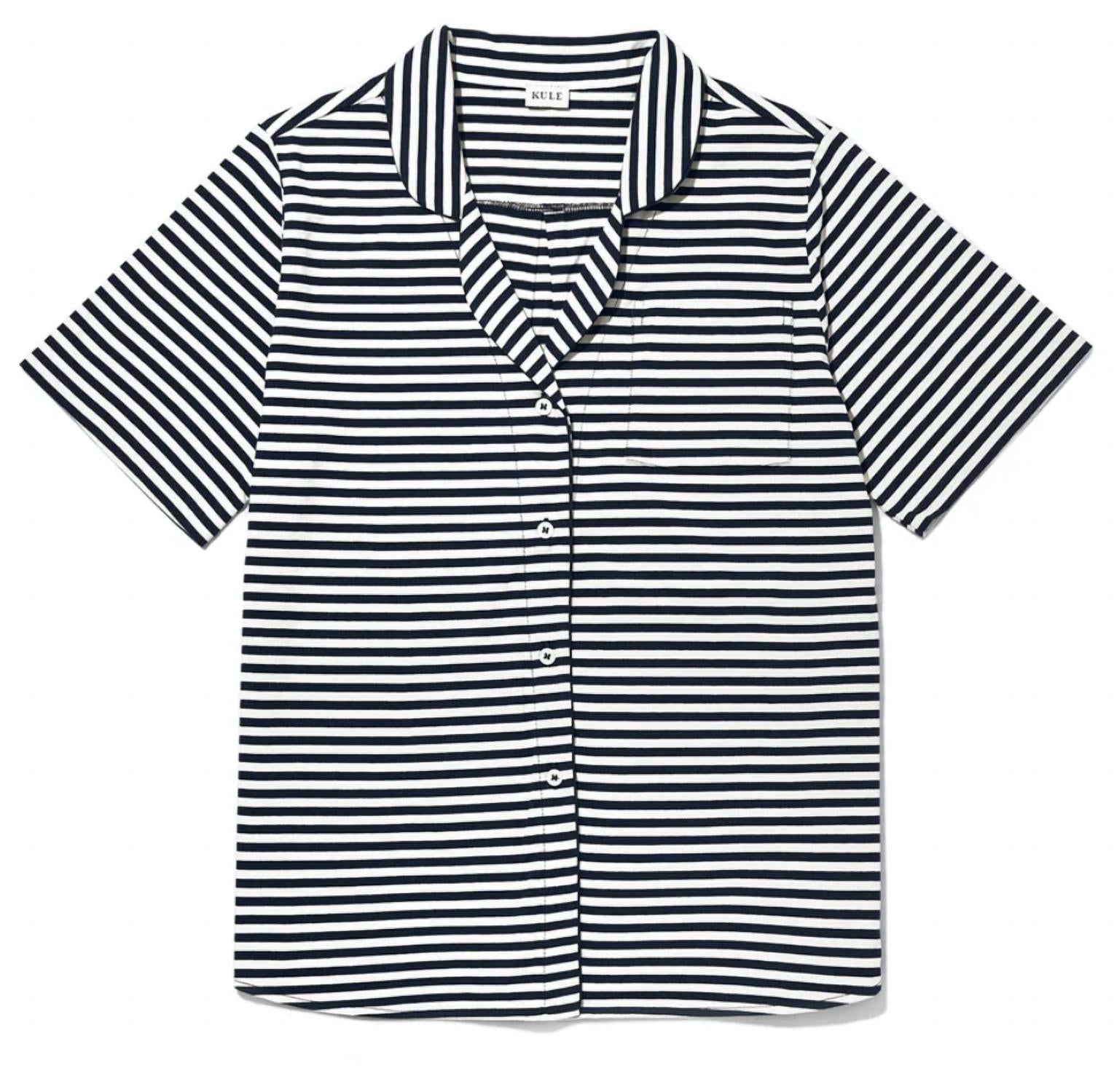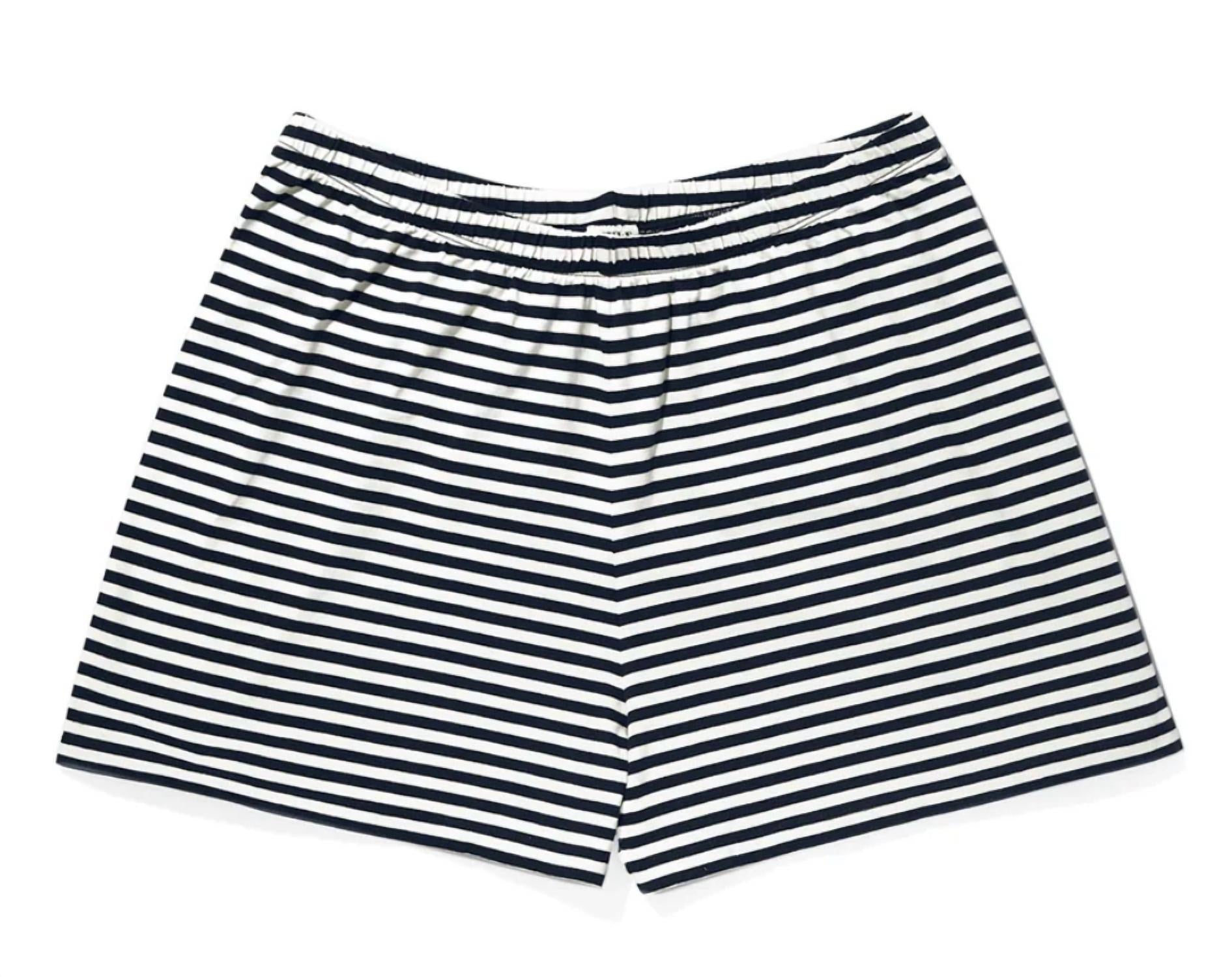 Introducing the The Short Pajama Set by KULE, perfect for a cozy PJ party. This navy and white striped pajama set features a short sleeve top with a collar and contrast piping along the sleeves, lapel, hem, and front pocket. Composition: 100% Cotton. Origin: Imported. Care: Machine washable for easy maintenance.