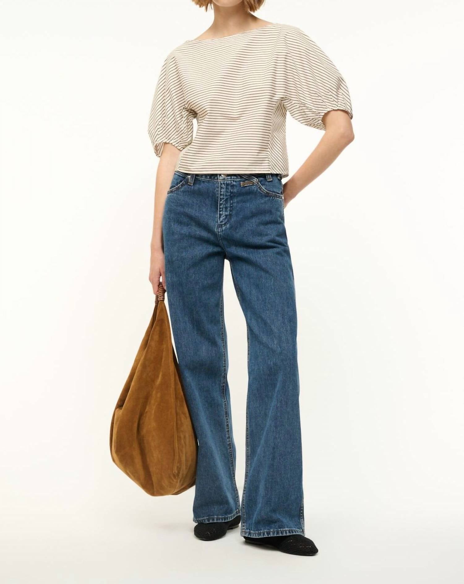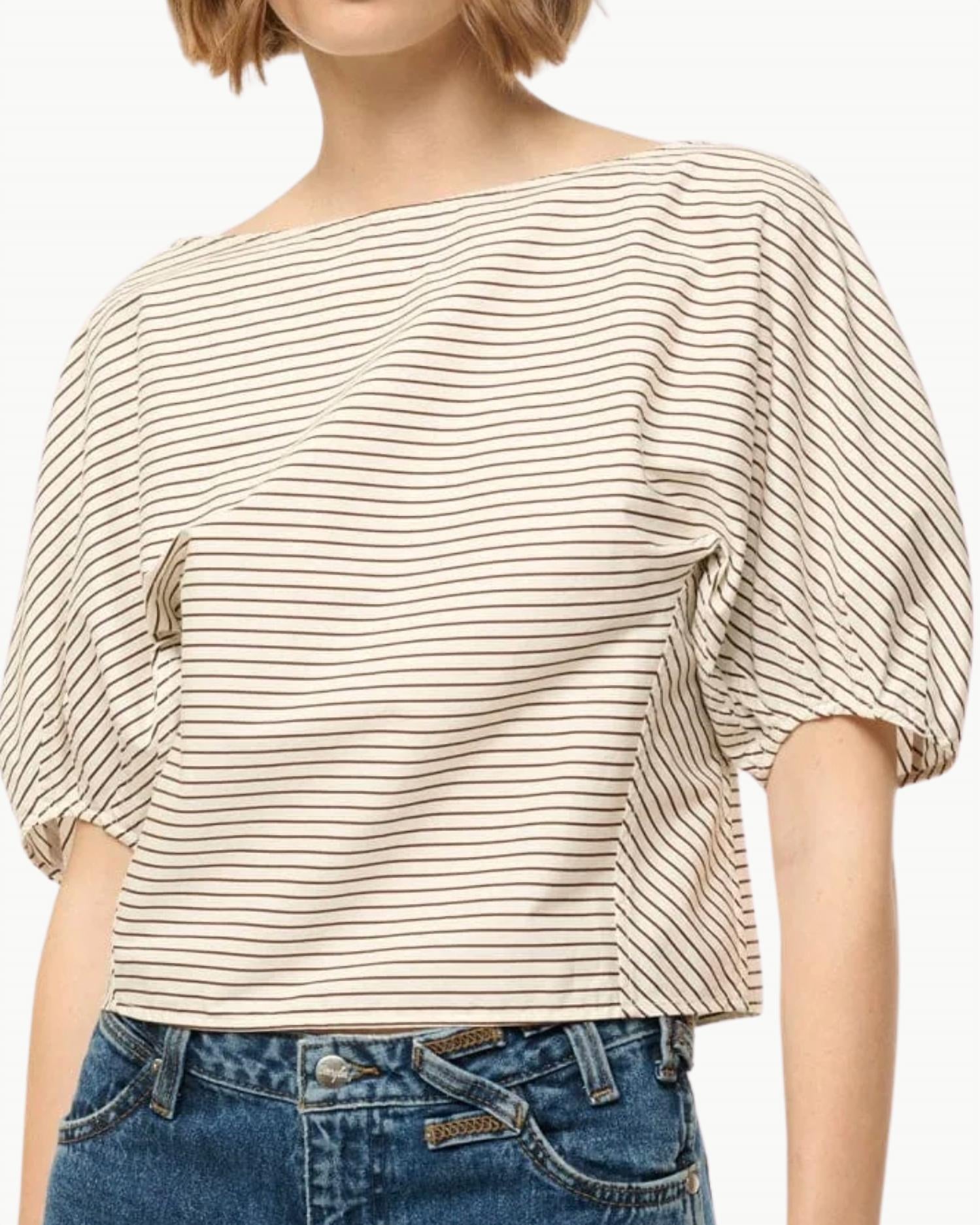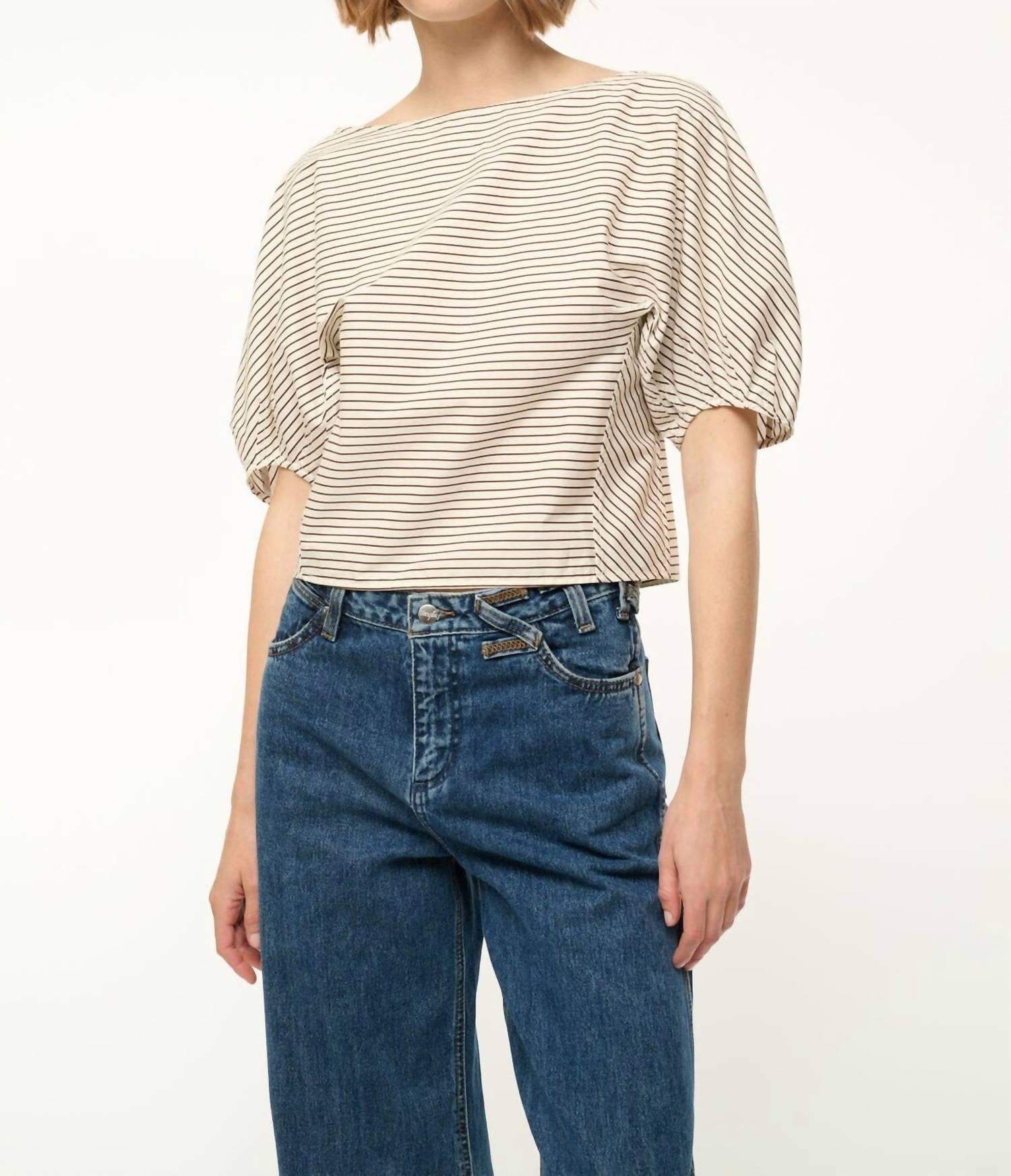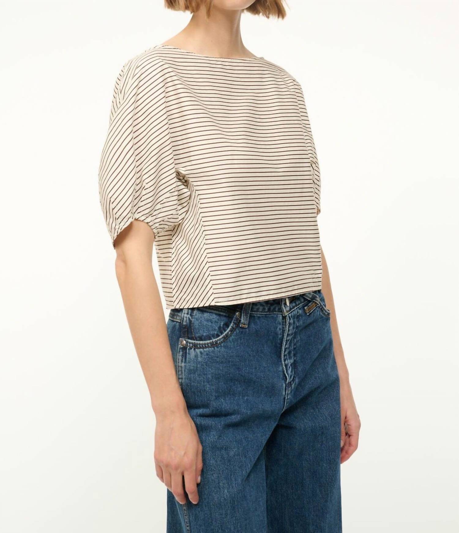 This classic, short sleeve tee will be your go-to staple this season and beyond. This Didi Short Sleeve Top by STAUD in Ivory/Dark Oak Micro Stripe is a chic addition for spring wardrobes. Crafted from 98% cotton and 2% spandex, it features a relaxed fit and playful striped pattern. The pull-on design is enhanced by a boatneck, ensuring comfort and ease in warm weather. Care instructions recommend machine washing and tumble drying. The model is 5'10" and wearing a size small.