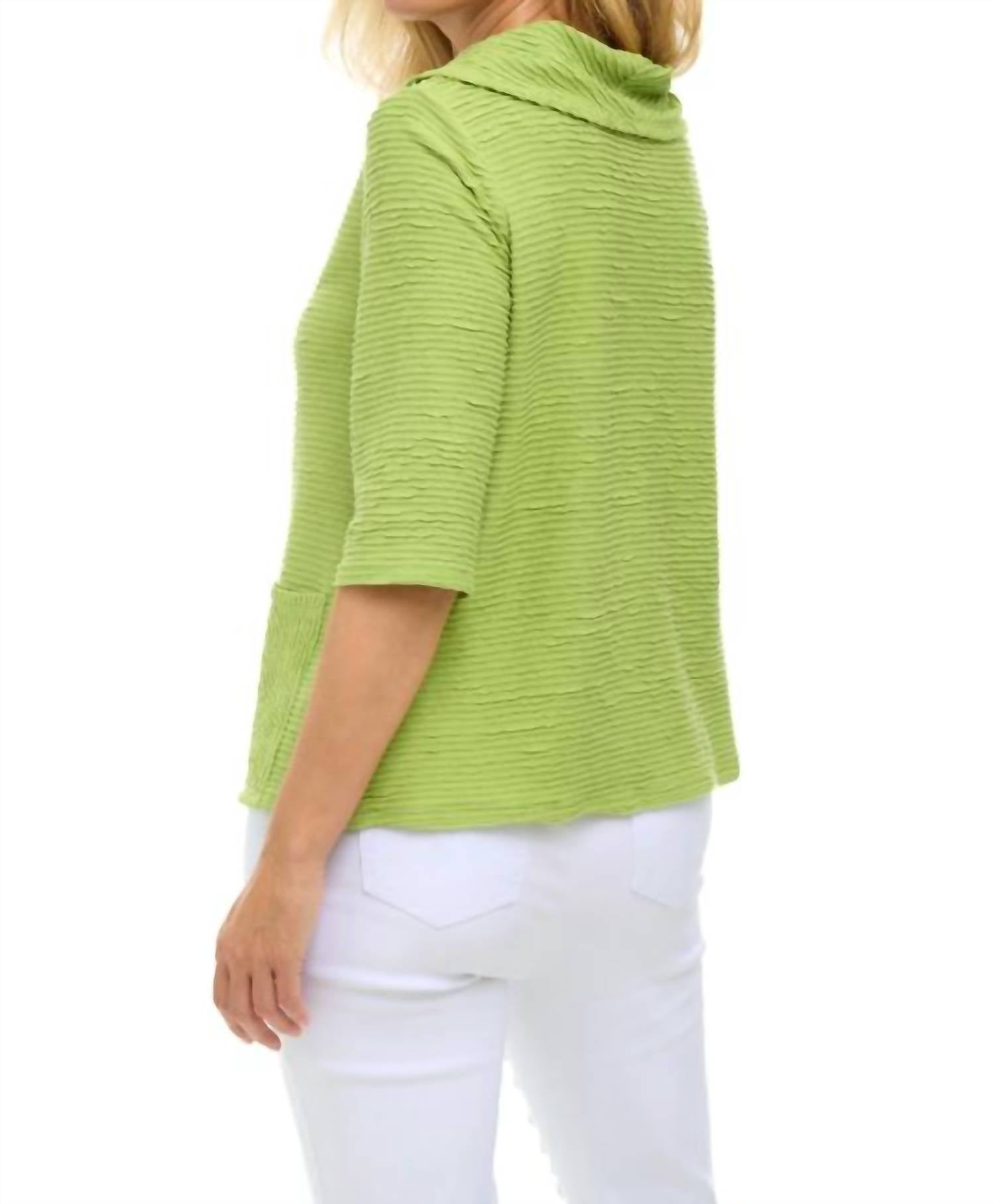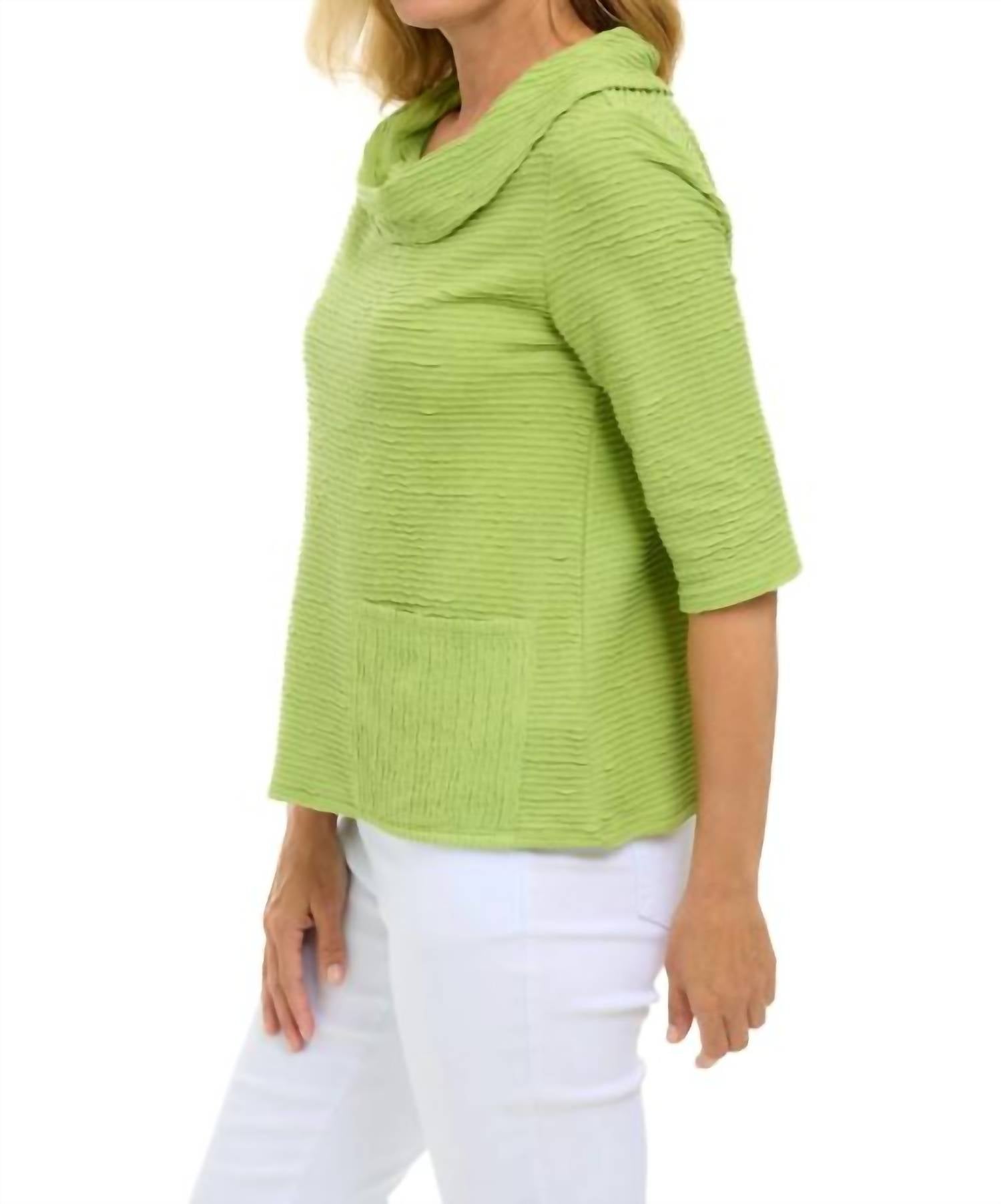 Stay warm and stylish in this versatile and effortlessly cool knitwear staple. Wear it alone or layered, it's the perfect sweater for the season and you'll wish you had it in every color. Blends style with comfort in a refreshing leaf green. Featuring three-quarter sleeves and a feminine cowl neckline. Pullover falls to a mid-length with an A-line hem that sits gracefully at the hip. Made from 100% cotton. Includes two patch pockets and a pull-on closure for easy wear. Machine wash cold on a gentle cycle and tumble dry low to maintain its soft texture and distinctive striped pattern.