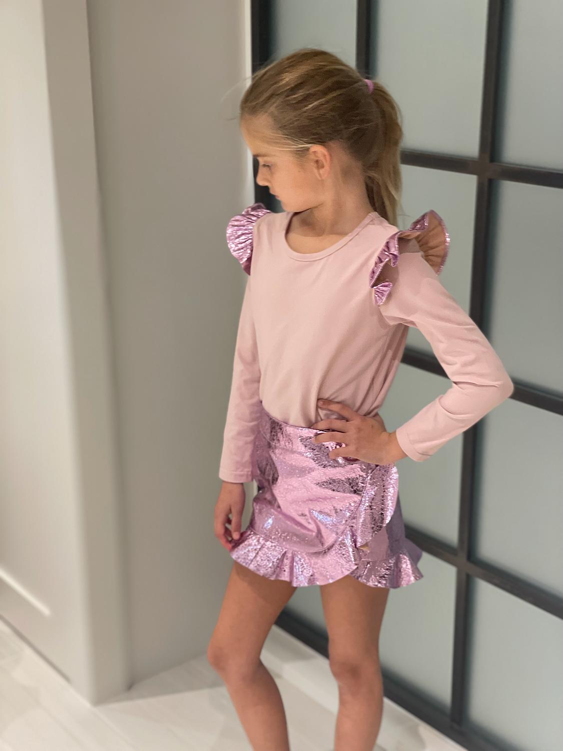 100% cotton jersey. Crew neck, Ruffle cap sleeves, Lurex silver ruffle. Pair this top with our pink metallic mini skirt!