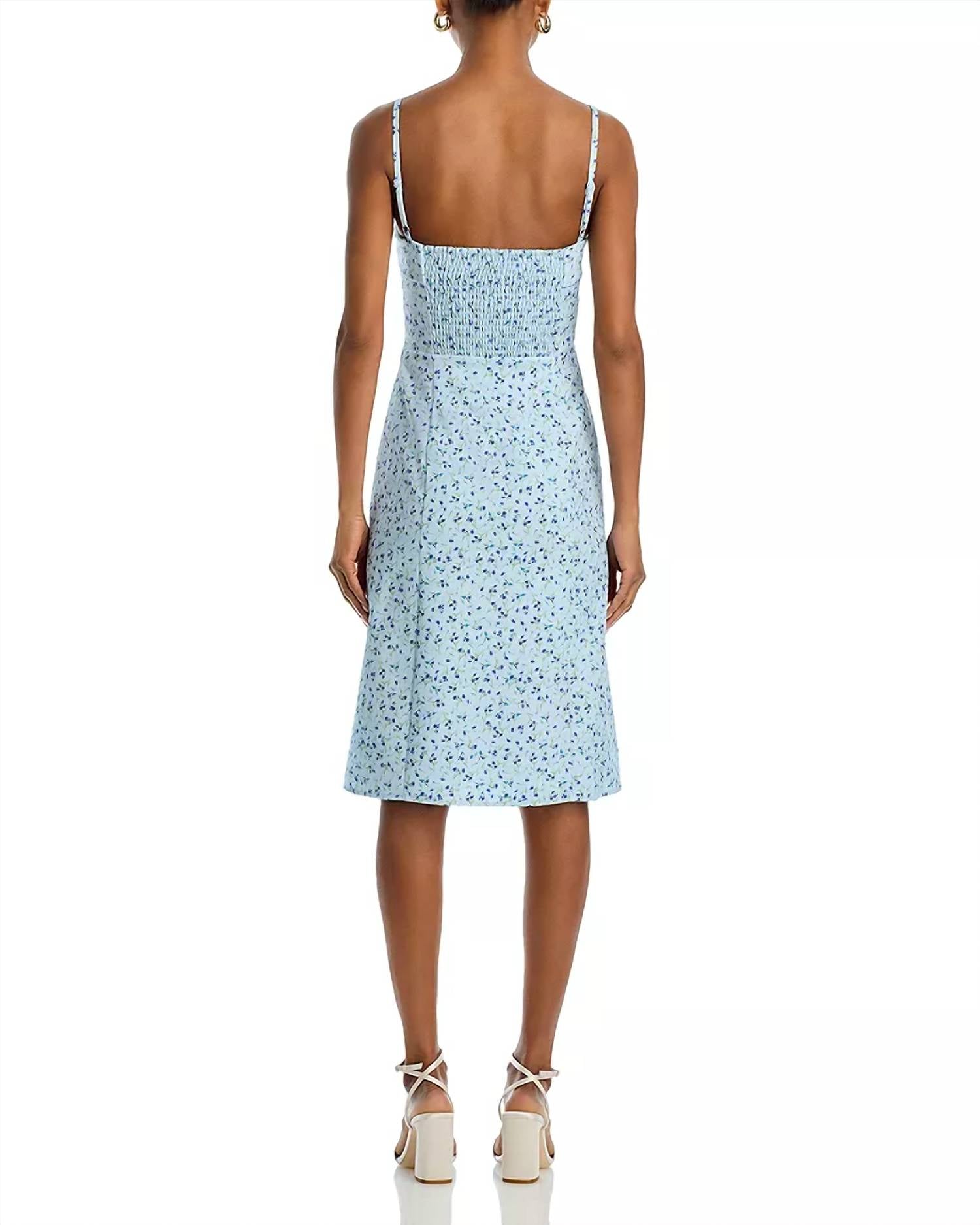 A midi dress so versatile, your options for wearing it are endless. Discover the Echo Crepe Midi Dress by French Connection, a stunning piece perfect for summer occasions. Featuring spaghetti straps and a scoop neckline, this dress is crafted from 88% polyester, 12% elastane with a whimsical floral pattern in shades of blue and green. It includes an eye-catching left leg slit and a smocked back panel for added detail. Closure: Side zip. Care: Machine wash.