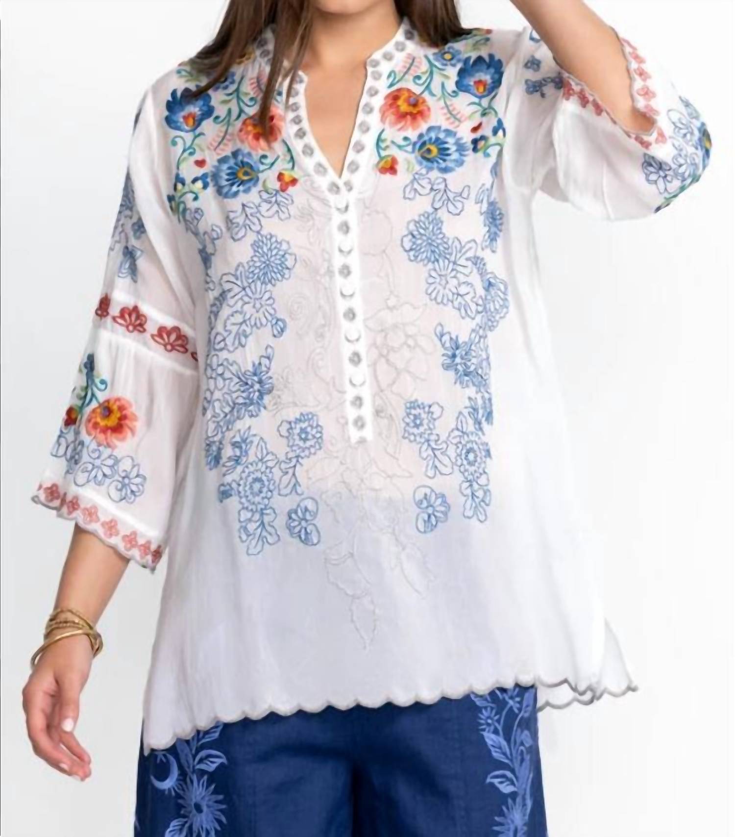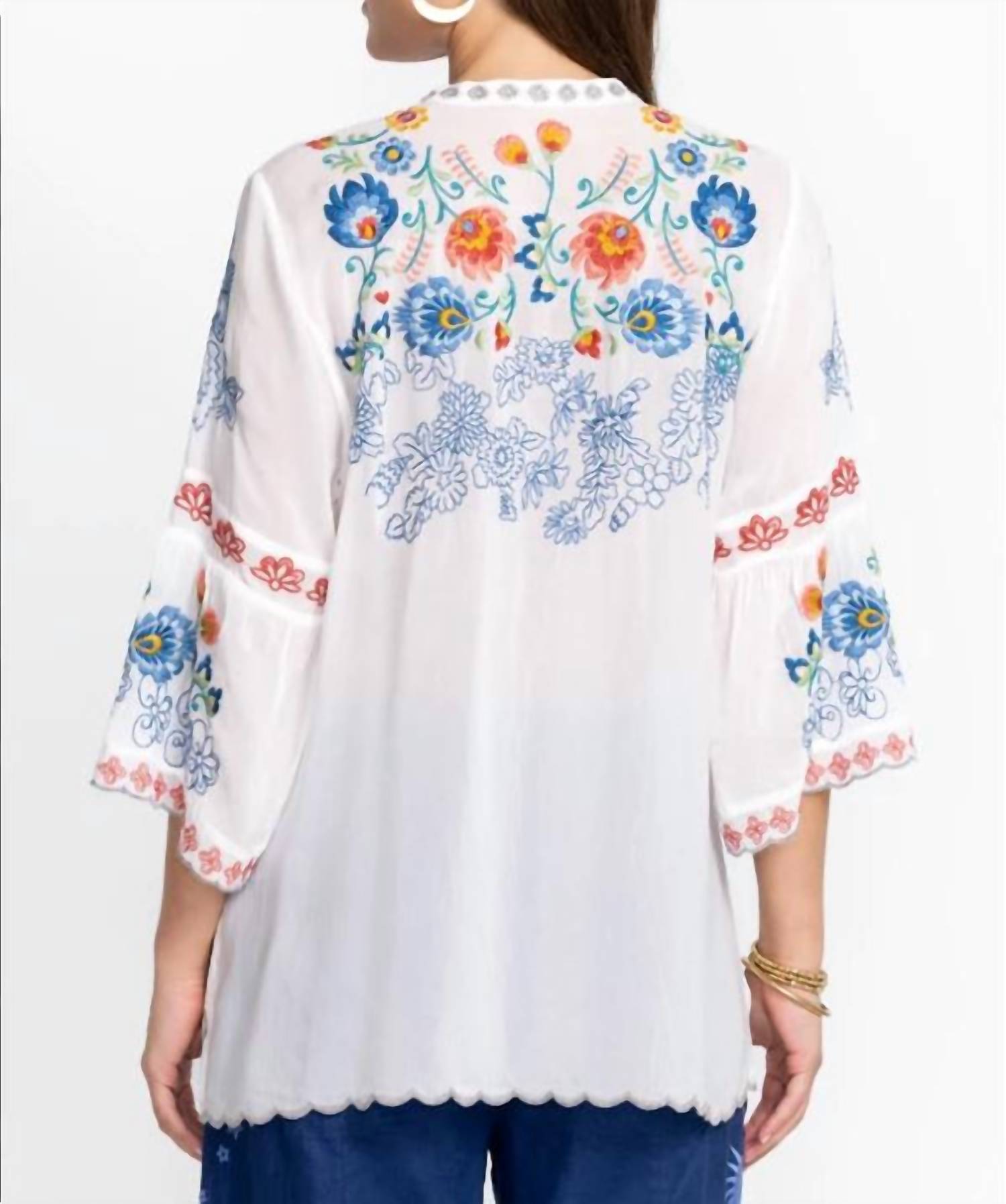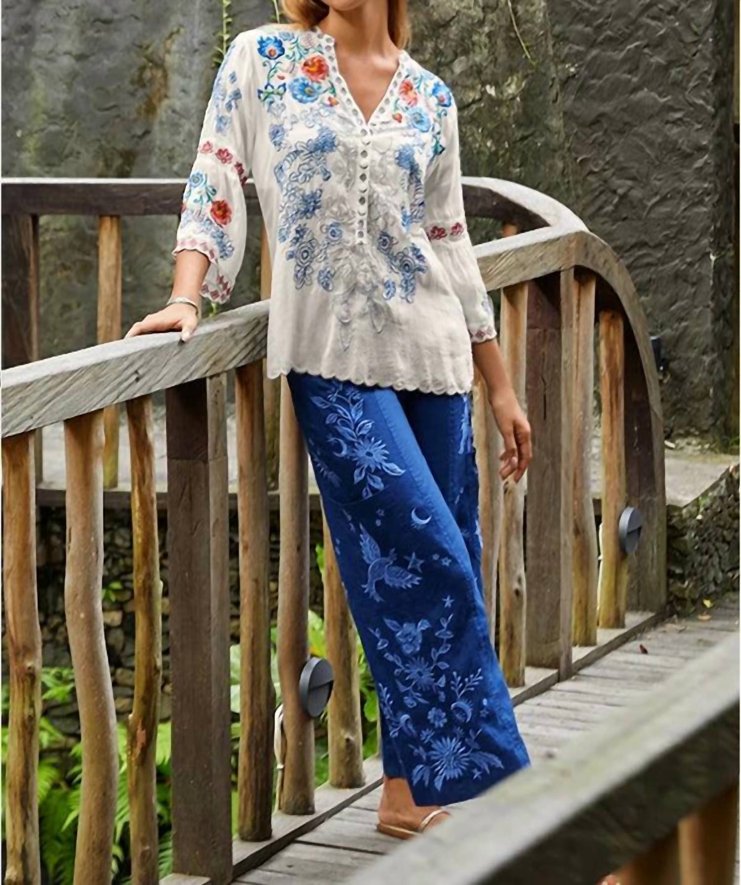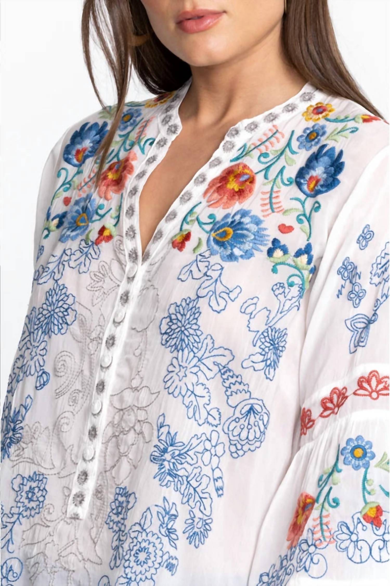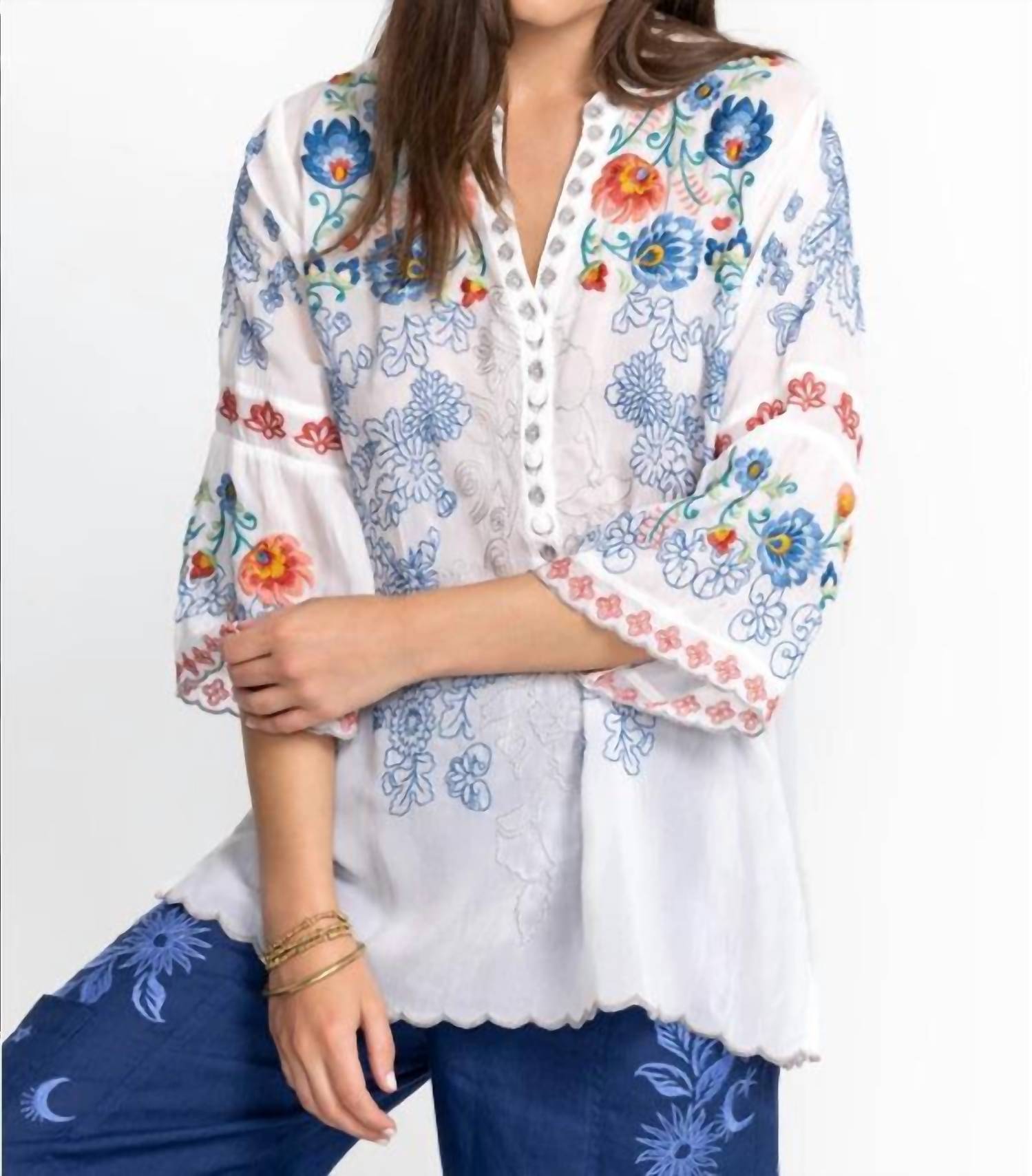 Flower-dotted fields and sun-drenched landscapes form the perfect backdrop for the Maverick Blouse. This blouse is designed from a breathable material with a round neck and long sleeves and further enhanced by a detailed floral placement embroidery. For an effortlessly stylish daytime outfit, style this blouse with a linen skirt and woven extras.Product Details:• Placement Embroidery• Model Height: 5'9"• Model is wearing a size Small• Measurements for size Medium: Bust- 41 1/4", Length- 28"• Care instructions: Machine wash cold only. Non chlorine bleach when needed. Tumble dry low. Warm iron.
