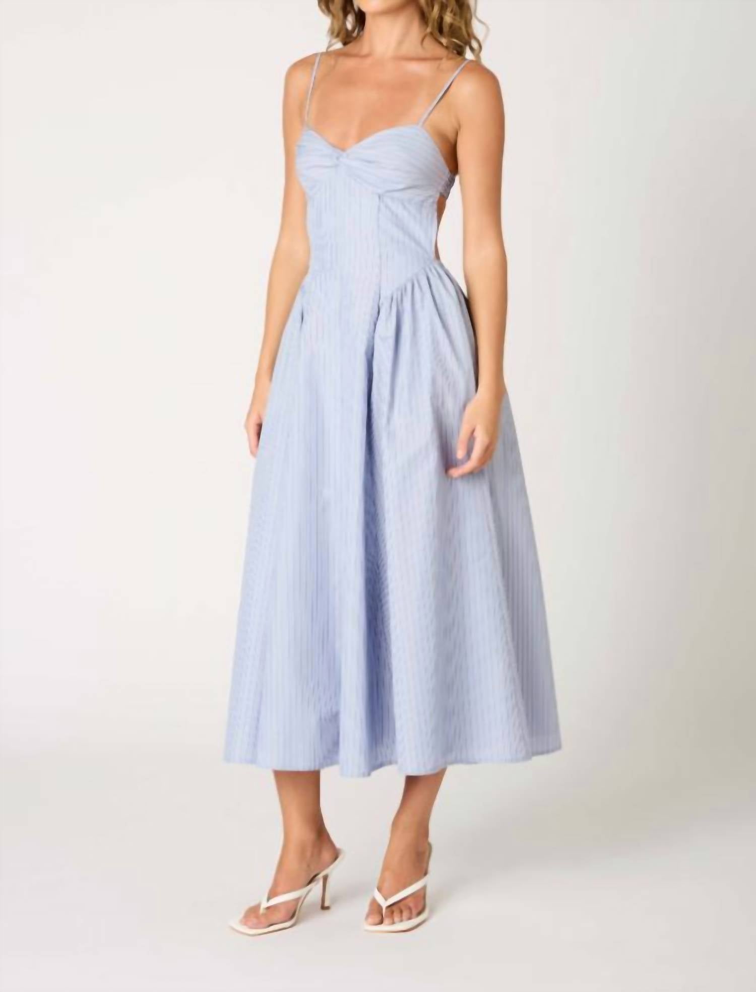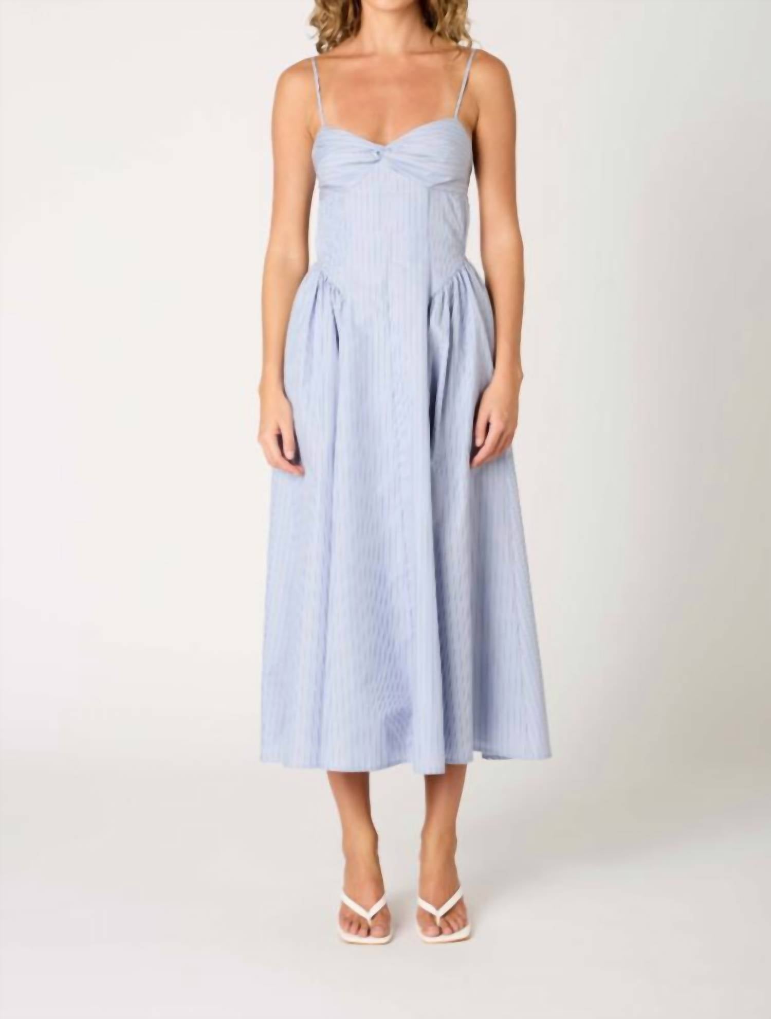 Pair with your favorite sandals for an effortlessly chic look. Elevate your wardrobe with the Destene Stripe Midi Dress by NIA, featuring spaghetti straps and a flattering A-line silhouette. Crafted in a cotton blend with a charming sweetheart neckline, this dress offers a chic slate blue stripe pattern, making it ideal for summer engagements and Thanksgiving soirées. Originating from a blend of 100% cotton shell with a 95% polyester and 5% spandex lining, this pull-on dress provides comfort without compromising style. Care instructions include machine wash and tumble dry for easy maintenance.