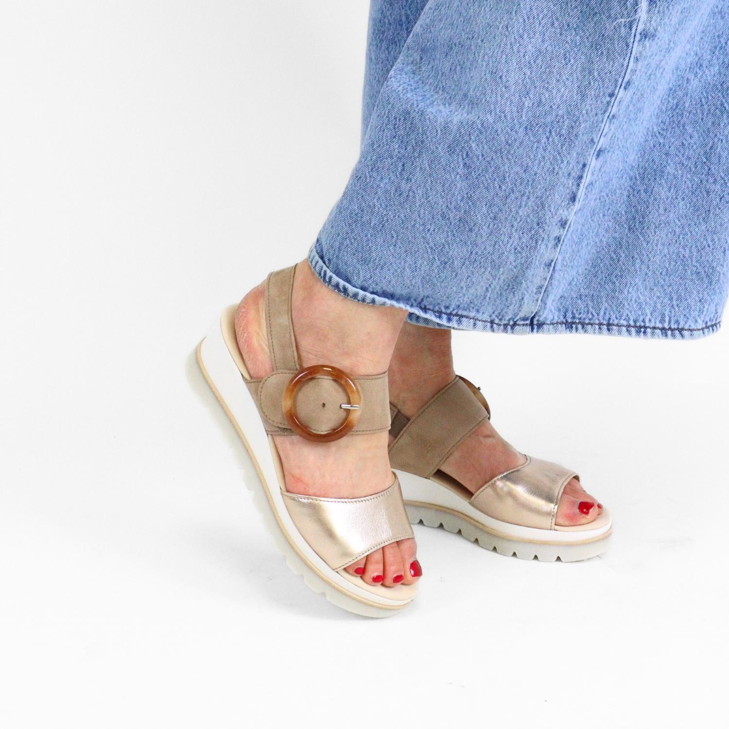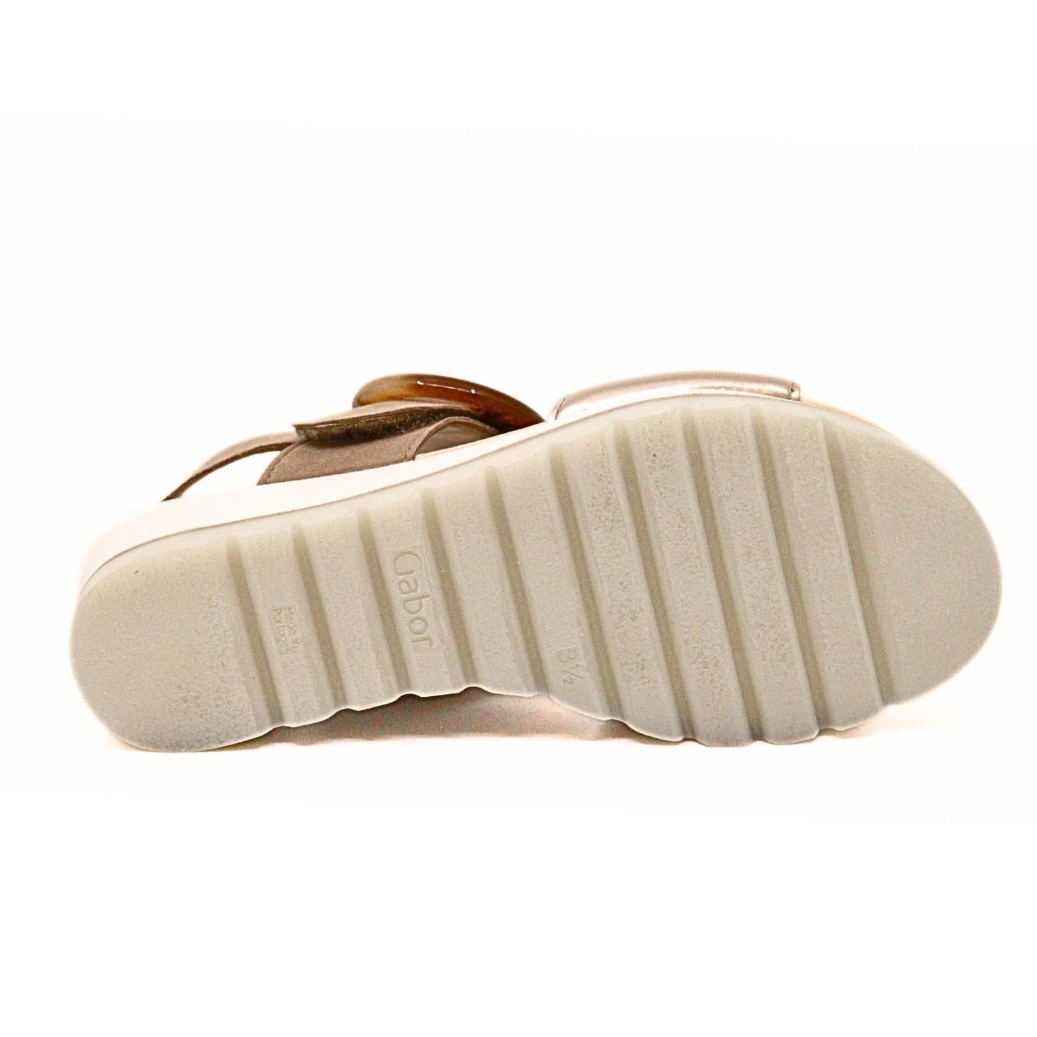 Elevate your footwear game with these adorable wedges. Experience the fusion of style and comfort with the Women's Sandal Wedge Champagne by GABOR in chic tan with metallic accents. These sandals feature a luxurious soft leather lining and an open toe design, perfect for making a stylish statement. The wedge heel and white heel add a contemporary touch, while the adjustable velcro straps equipped with elastic ensure a perfect fit that hugs your foot. Made in Germany, these sandals are ideal for a dinner party or any spring occasion, providing all-day comfort and elegance.