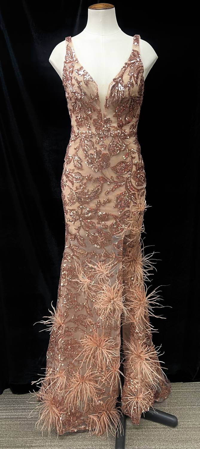 Make a stunning entrance with the AMARRA V-Neck Sequin Prom Gown in dazzling Rose Gold. This elegant gown features a machine sequin design complemented by a V neckline bodice and a stylish feather-embellished skirt slit. With a convenient zipper back, this gown effortlessly combines style and functionality. Perfect for prom or any glamorous event.