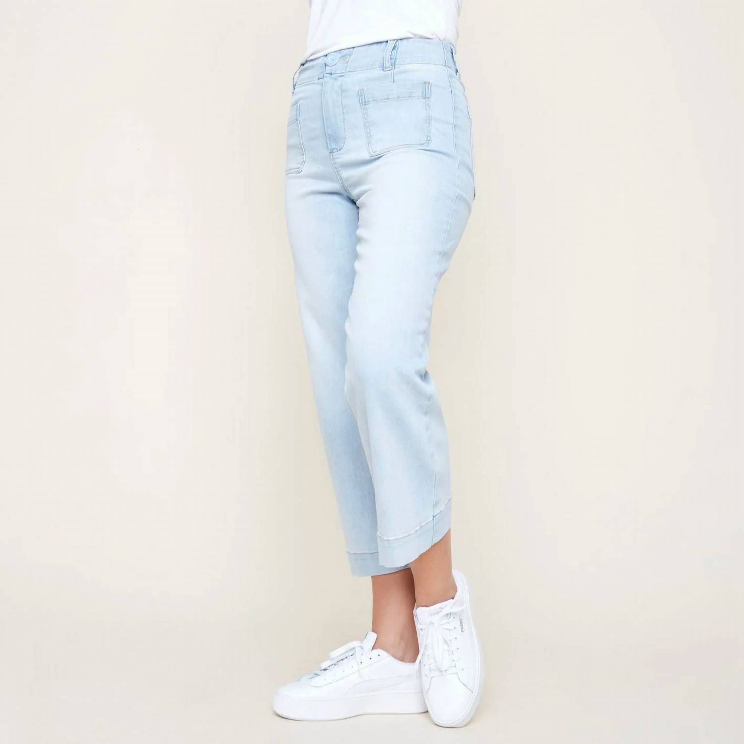 Refreshing Bleached Blue hue. Epitome of modern style and comfort. Featuring a flattering high rise and a relaxed wide-leg silhouette. Drapes beautifully with a 25-inch inseam. Crafted to perfection. Offer convenience with functional front pockets. Button closure add a touch of classic charm to this versatile piece. Promise a chic, effortless look. Experience the perfect blend of style and practicality.