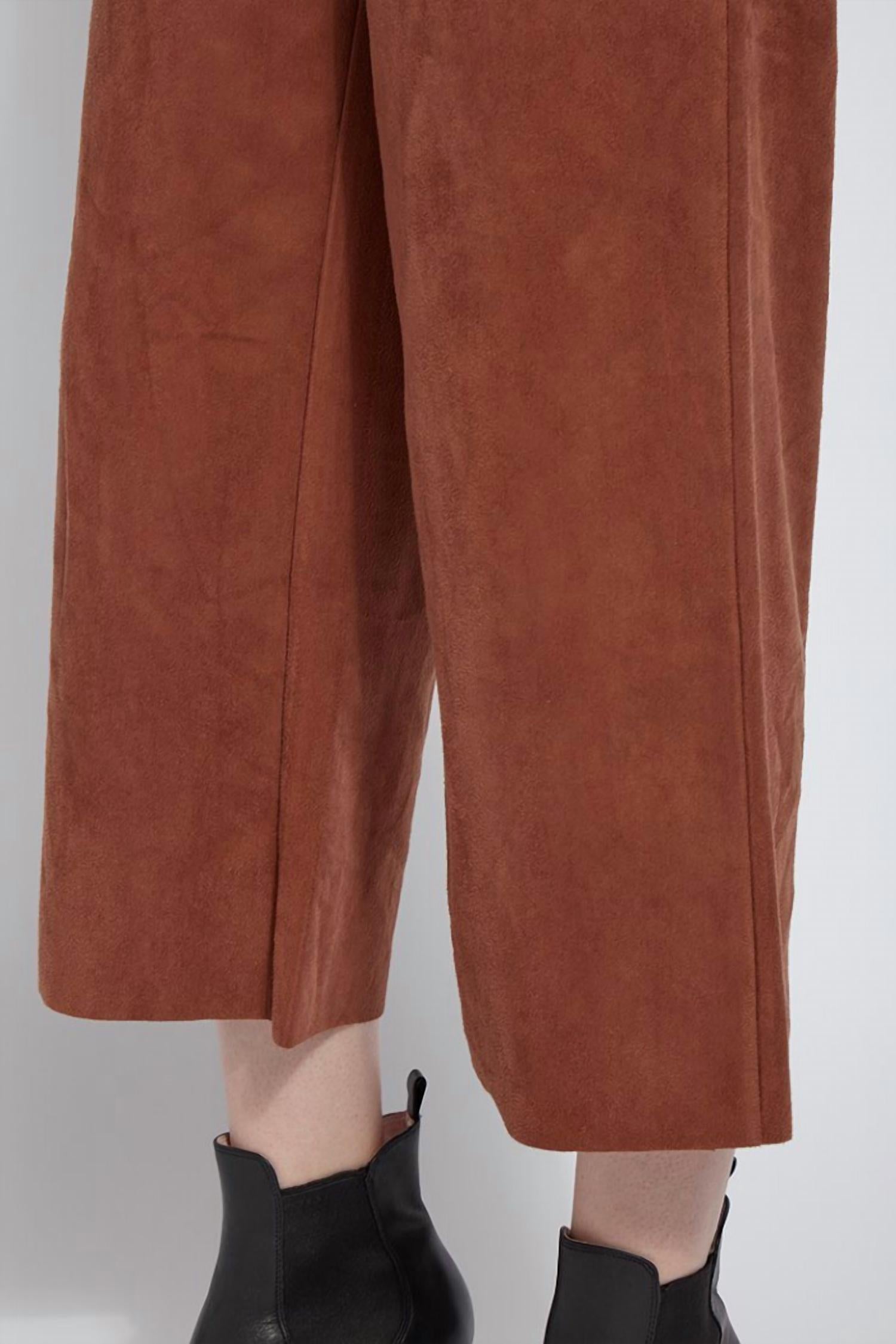 Step into sophistication with the Brown Prize Gathered Waist Ankle Pants by Lysse, perfect for a chic fall look. These women's wide-leg pants feature a relaxed fit high-rise design and 24.5" inseam for ultimate comfort. Made from 90% Polyester and 10% Spandex Faux Suede, they boast a pull-on closure and include pockets for convenience. Care is simple with machine wash and tumble dry, making them ideal for travel or Thanksgiving gatherings. Model is 5’10” and wearing size S.