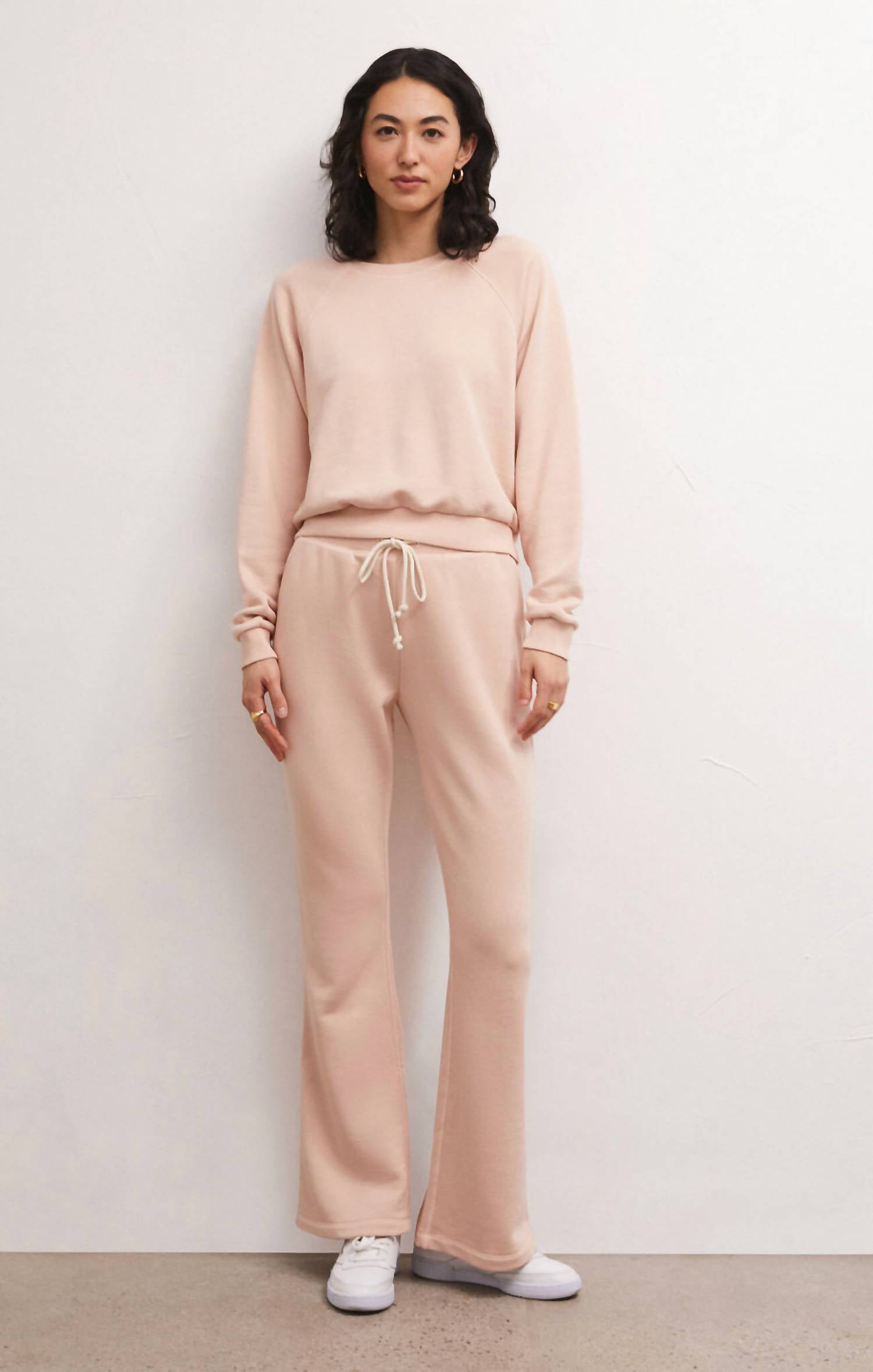 68% Cotton 17% Polyester 15% Rayon. The Shane Flare Sweatpant is made using our Cotton French Terry knit fabric and features an elastic, drawstring waistband, pockets and full length. This fit-and-flare sweatpant is stylish & very comfortable.
