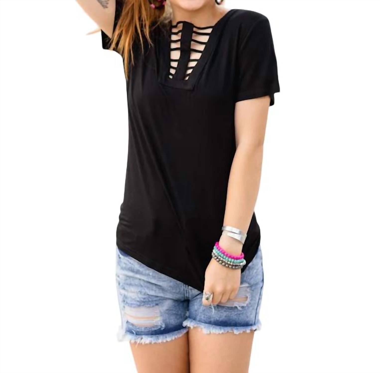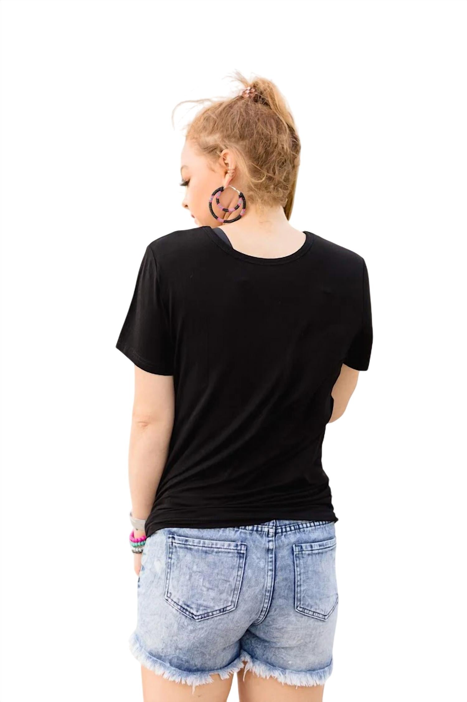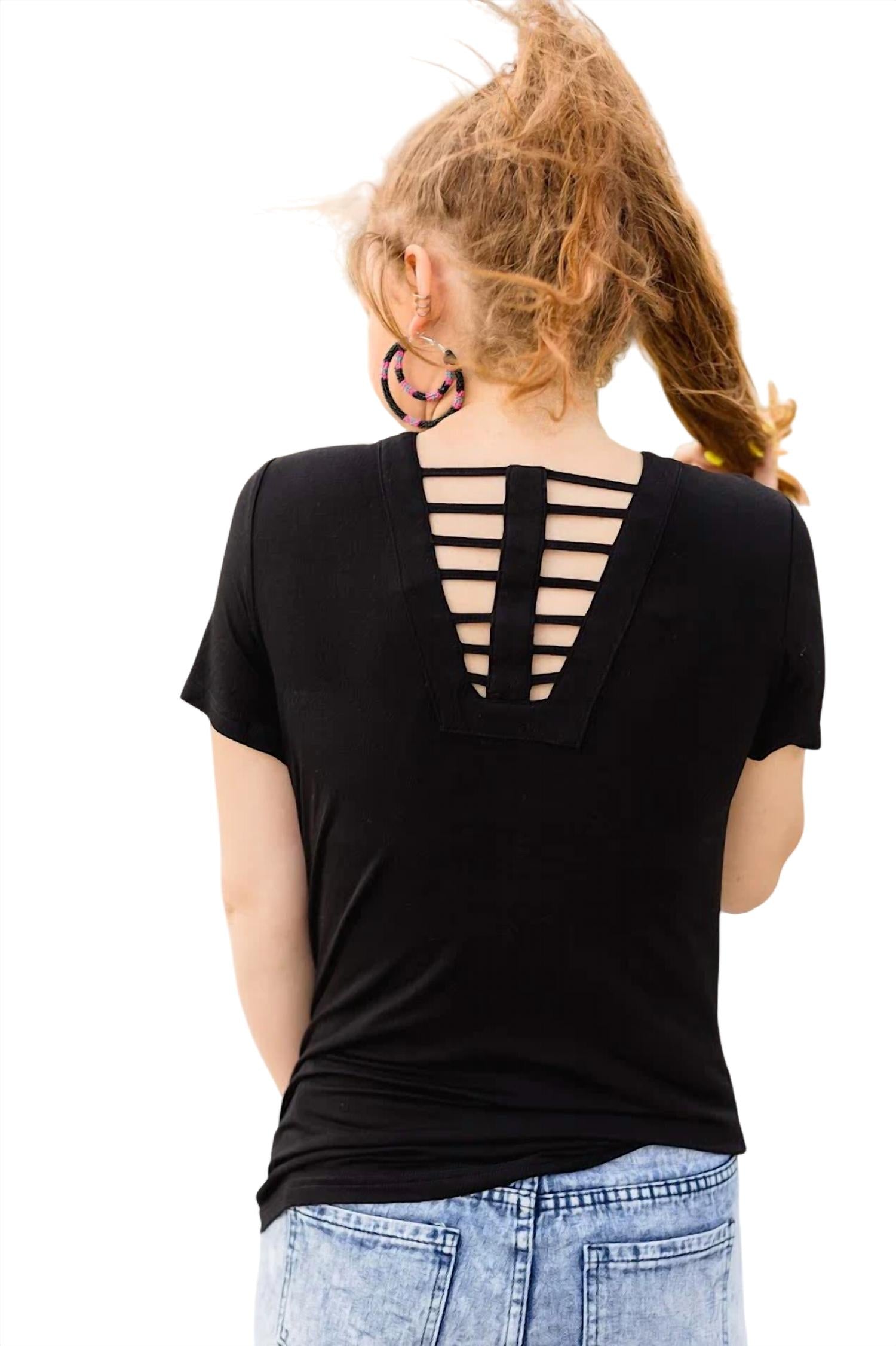 This reversible short sleeve tee is crafted from a blend of 95% Polyester and 5% Spandex, offering super comfy wear. It features a captivating cage neckline and a pull-on closure. Solid tee measures 26" in length and fits true to size. Hand wash cold for best care.
