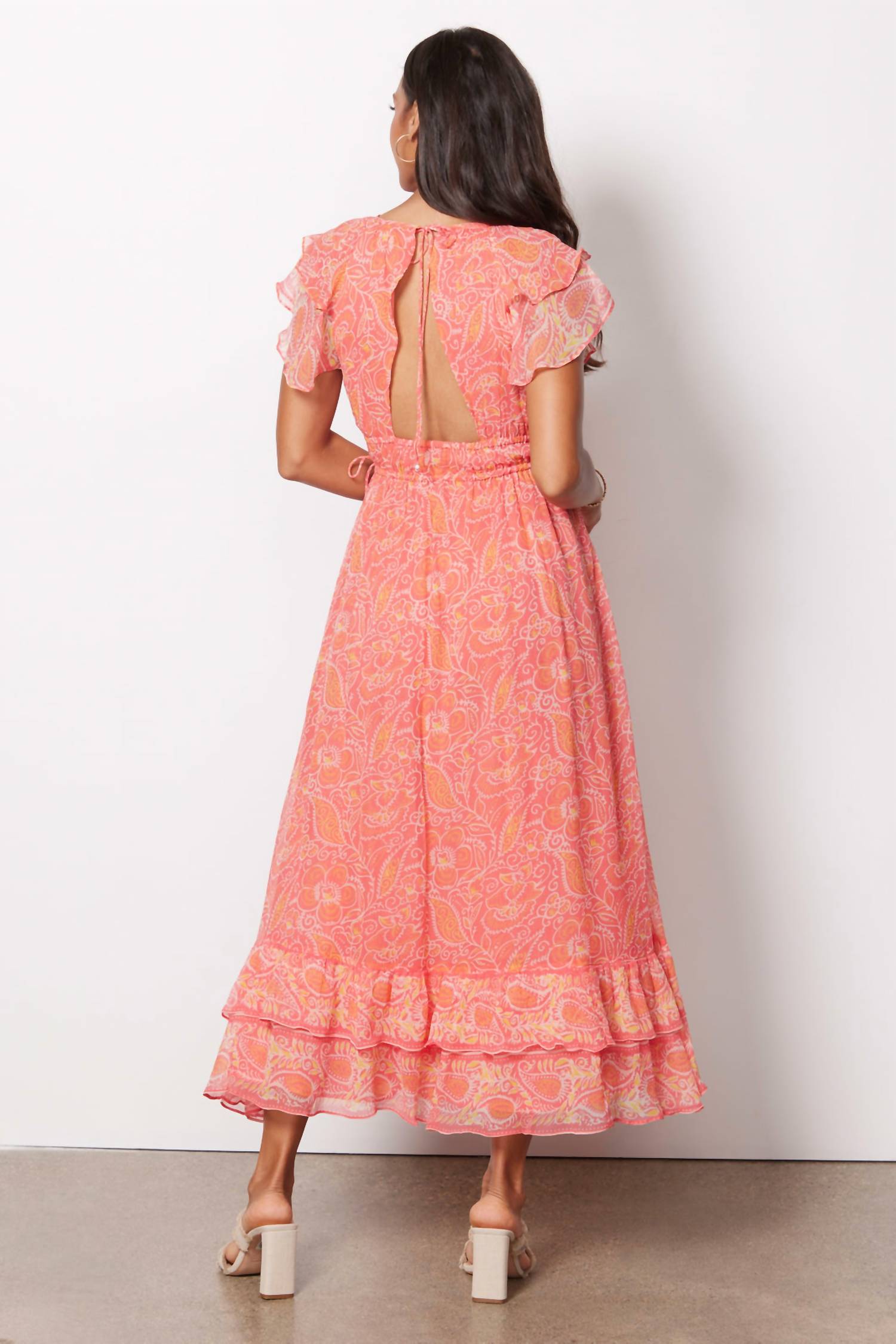 Fully lined. Pull-on styling with attached back tie closure. Elastic waistband with adjustable drawstring. Lightweight voile fabric with flutter sleeves. Hand wash. Model is 5'9 tall and wears size S. Length from Shoulder to Hem: 54"